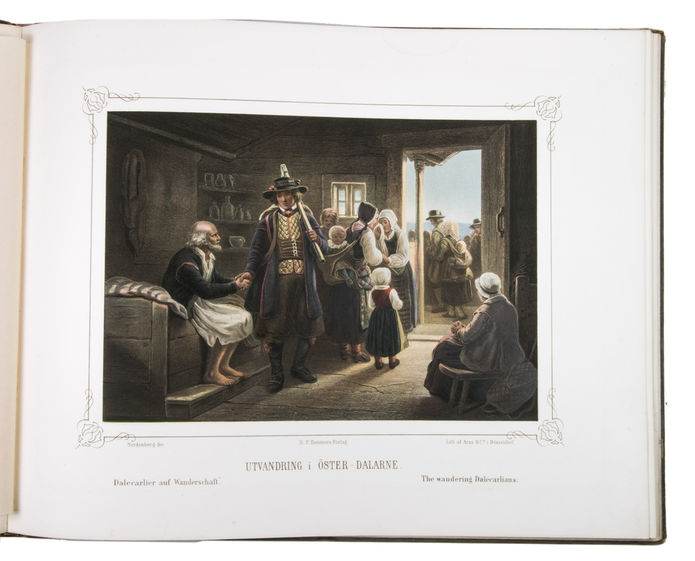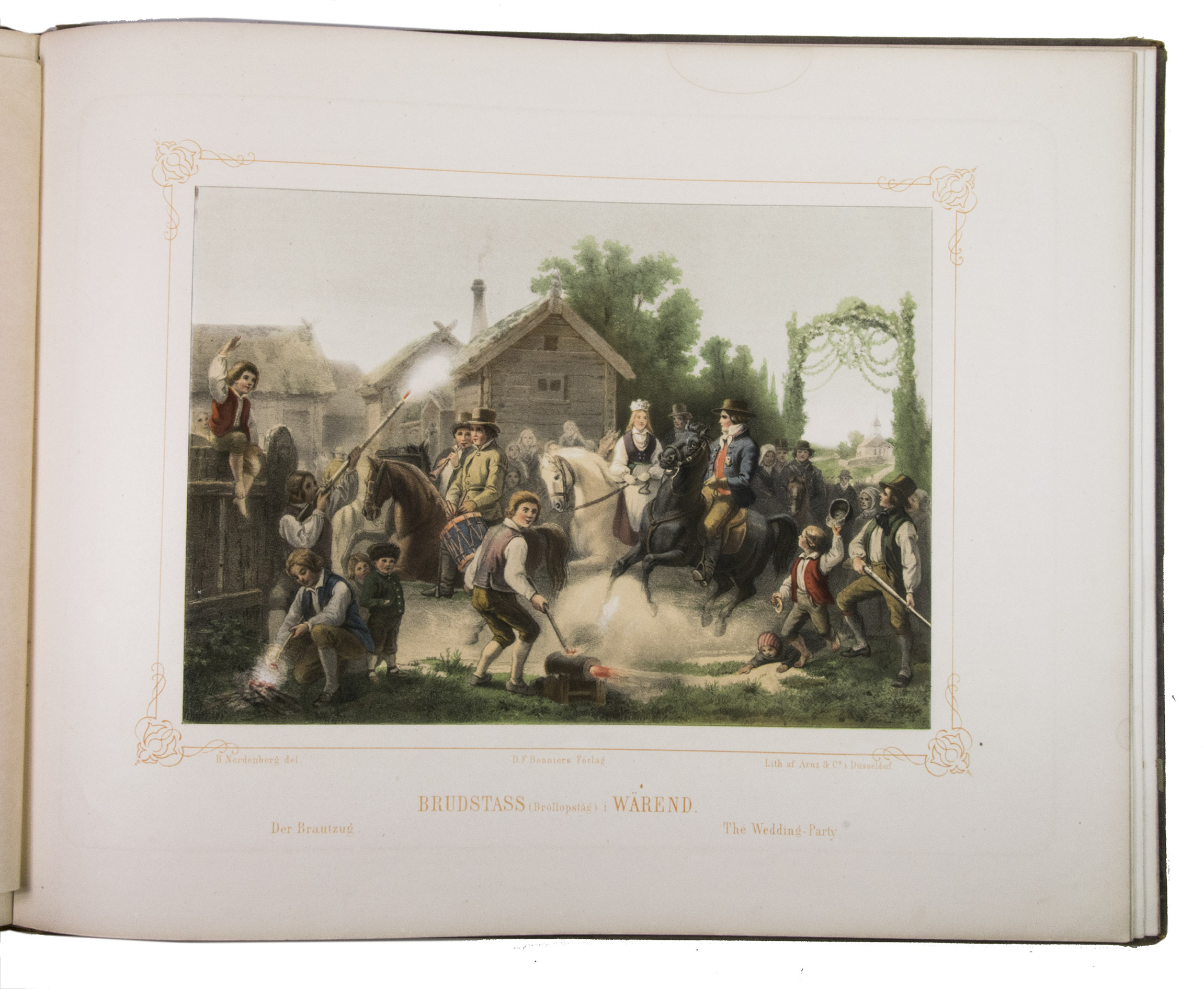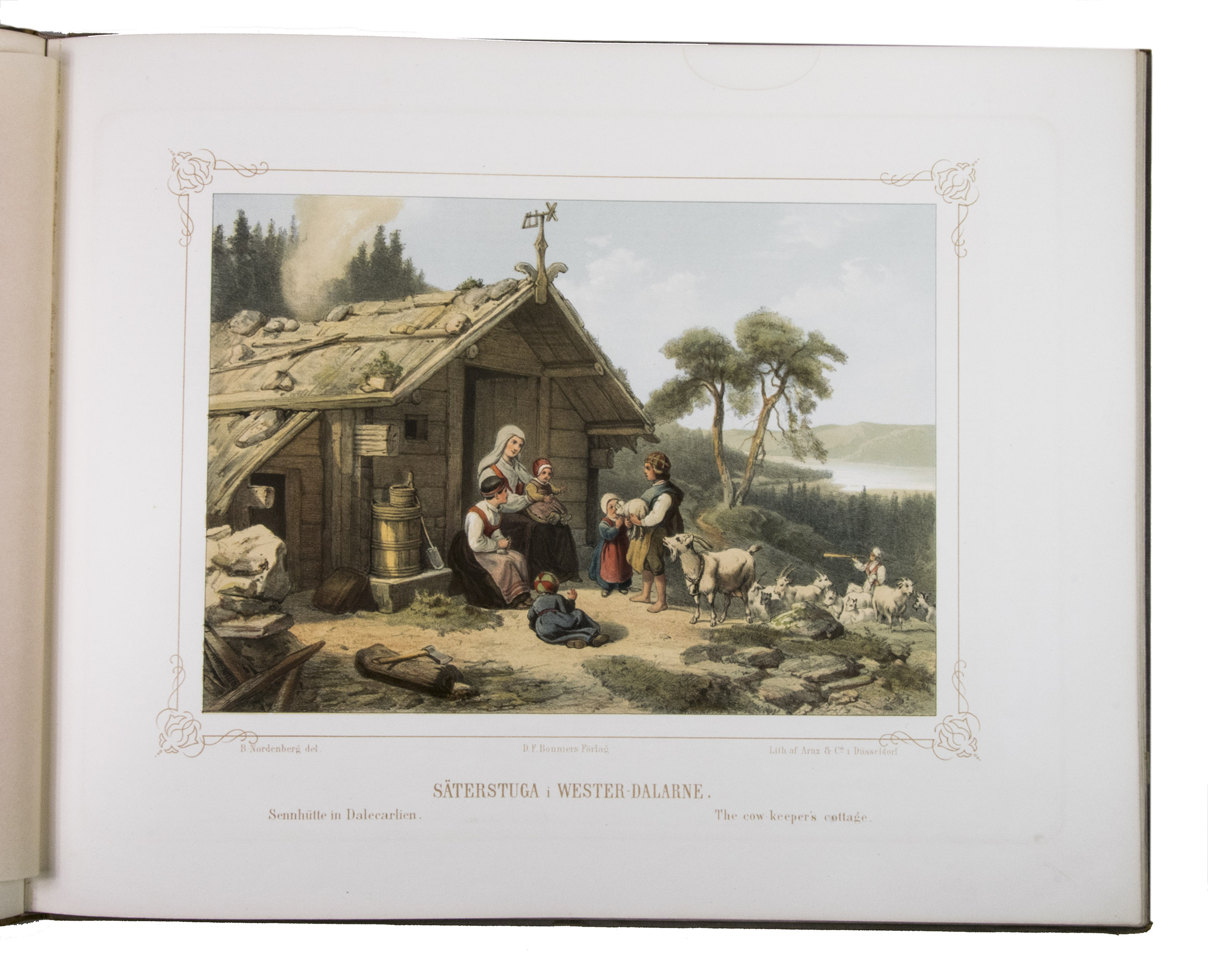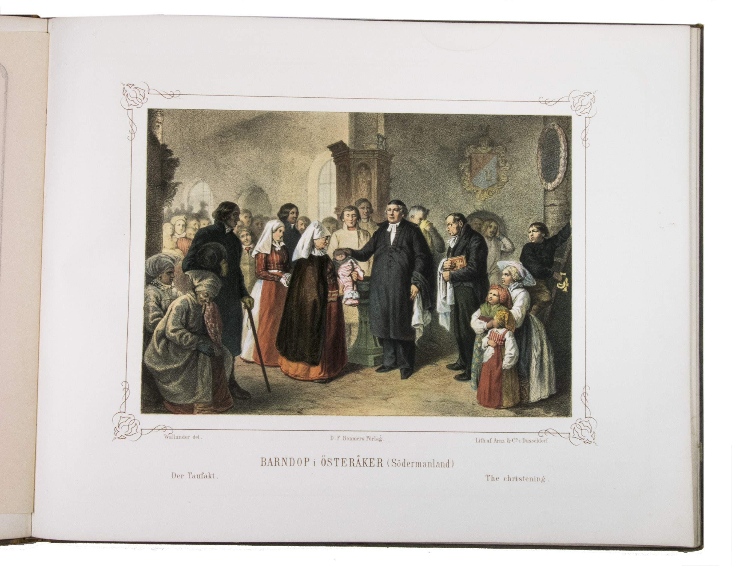 First and only edition of a beautiful work on Swedish traditional dress. The work contains 12 large chromolithographed plates depicting different scenes from Swedish life, including a wedding, herring fishing, a baptism, a horse market, and the interior of a hut in Lapland. Each plate is accompanied by a long description in Swedish, German, and English, which explains the scene in detail. The plates and text together offer a fascinating insight into life in the Swedish countryside in the middle of the 19th century.