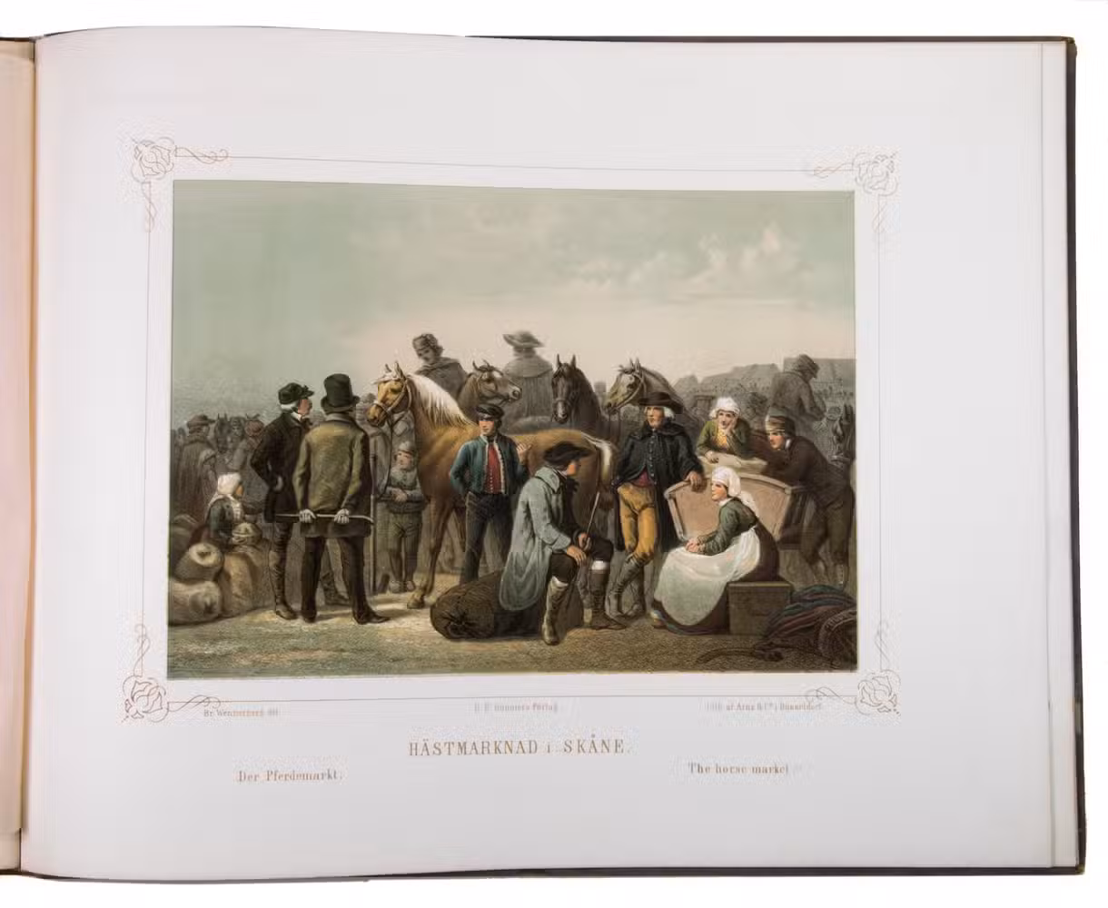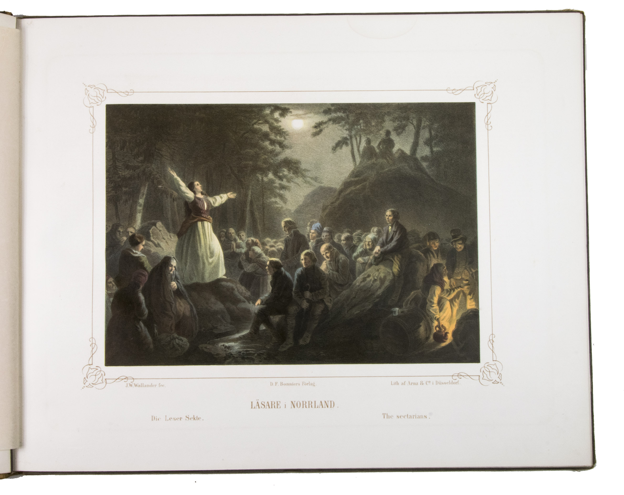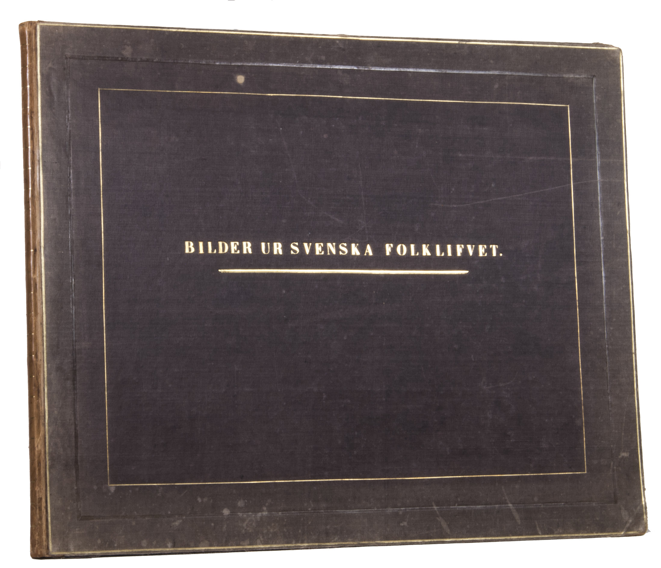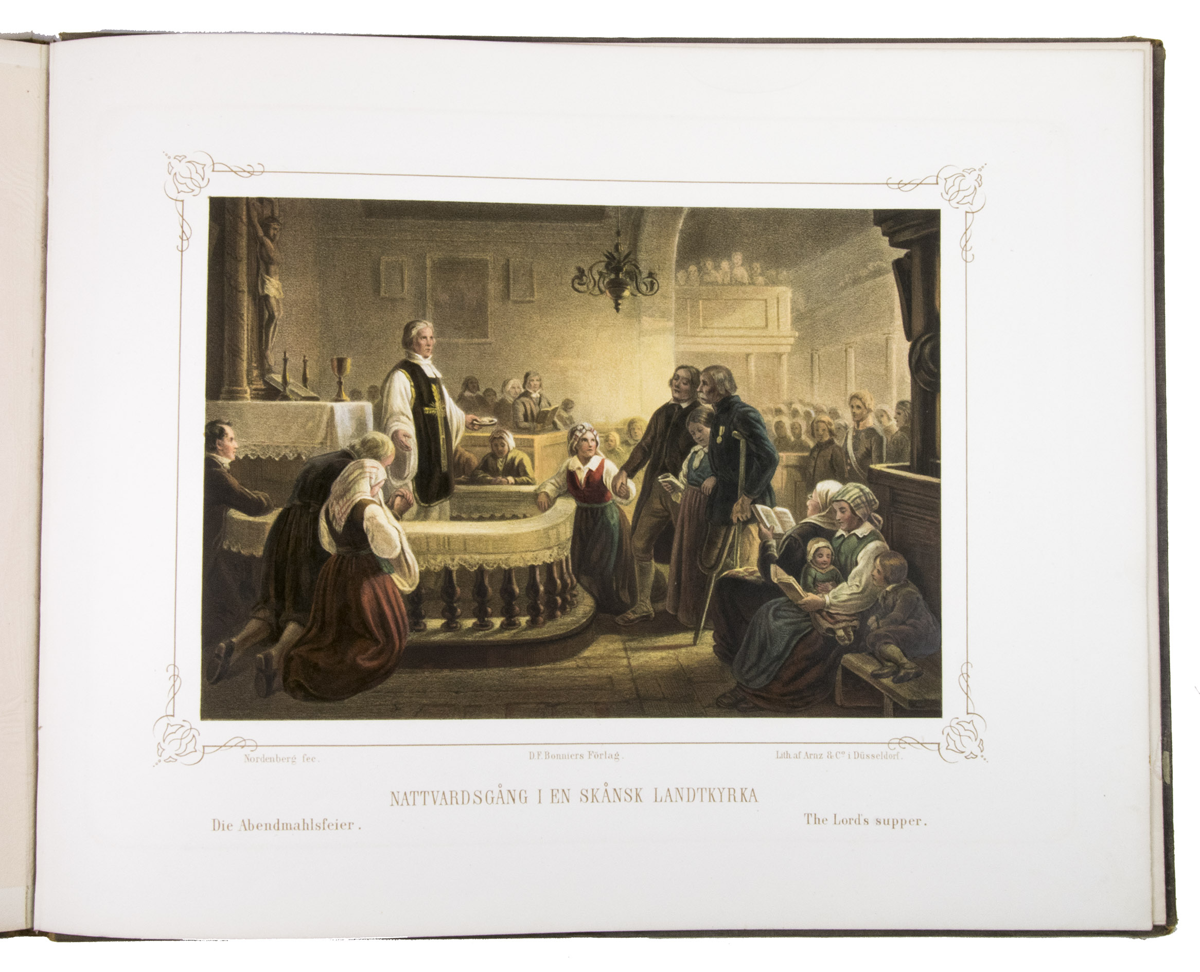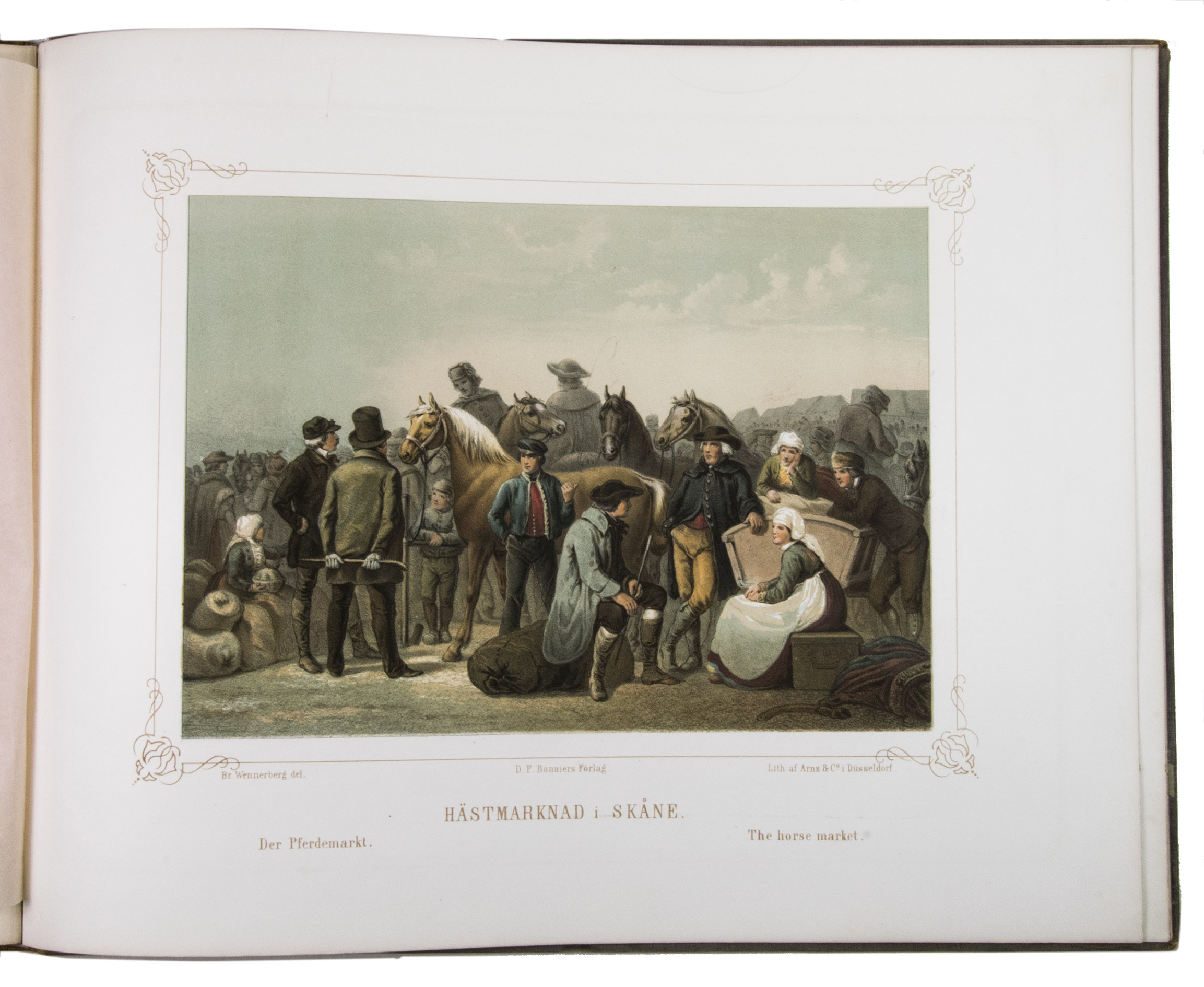 First and only edition of a beautiful work on Swedish traditional dress. The work contains 12 large chromolithographed plates depicting different scenes from Swedish life, including a wedding, herring fishing, a baptism, a horse market, and the interior of a hut in Lapland. Each plate is accompanied by a long description in Swedish, German, and English, which explains the scene in detail. The plates and text together offer a fascinating insight into life in the Swedish countryside in the middle of the 19th century.