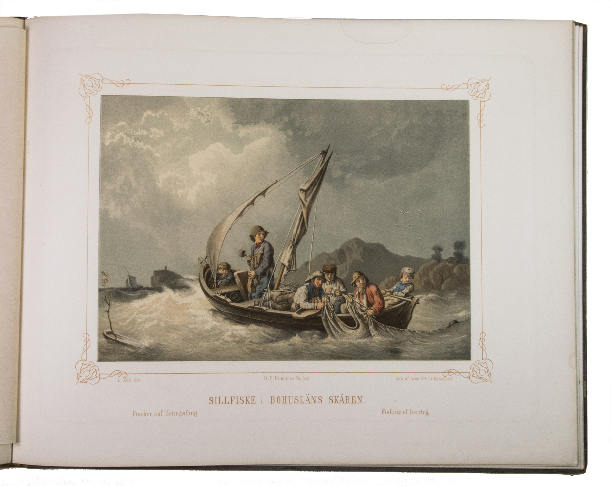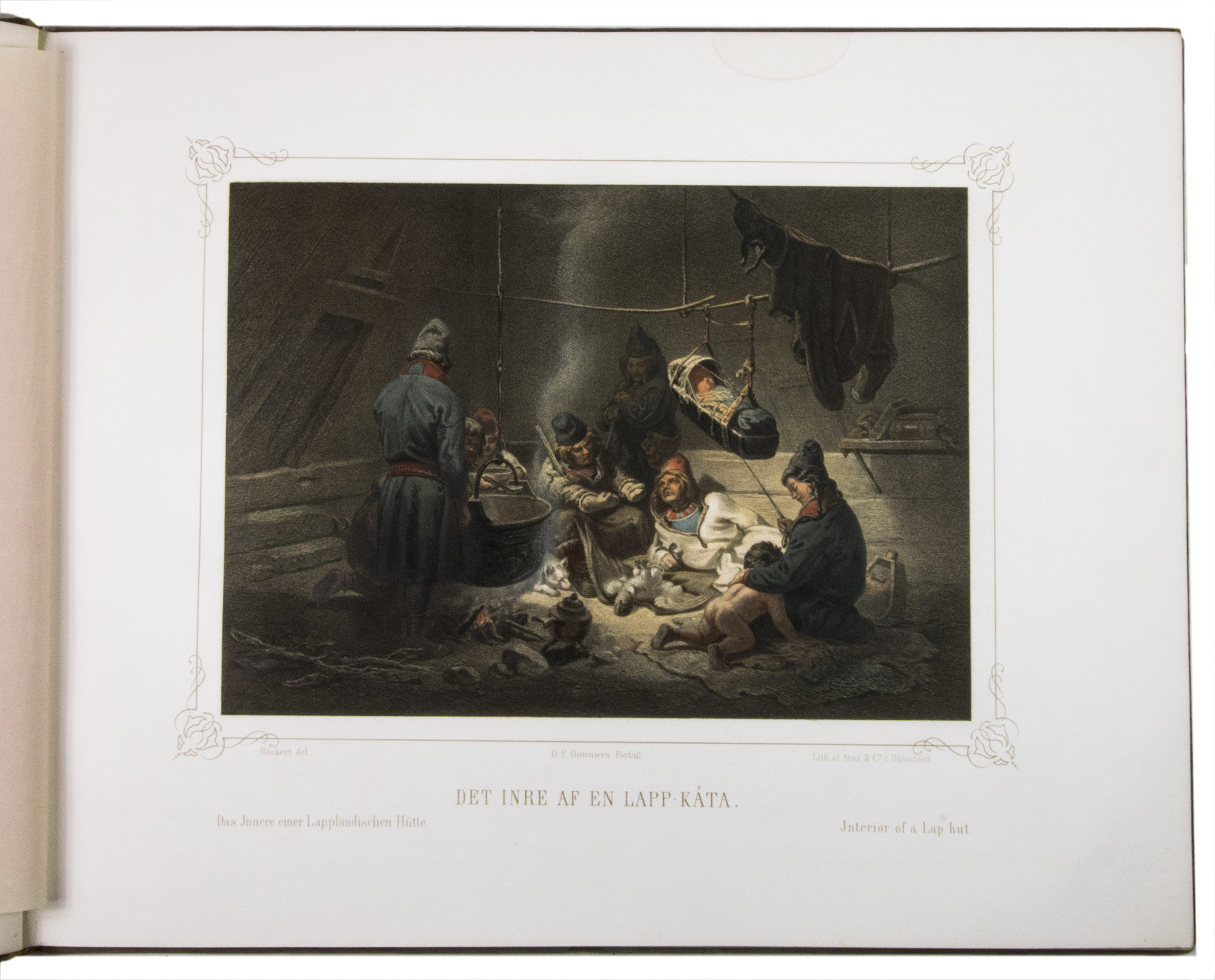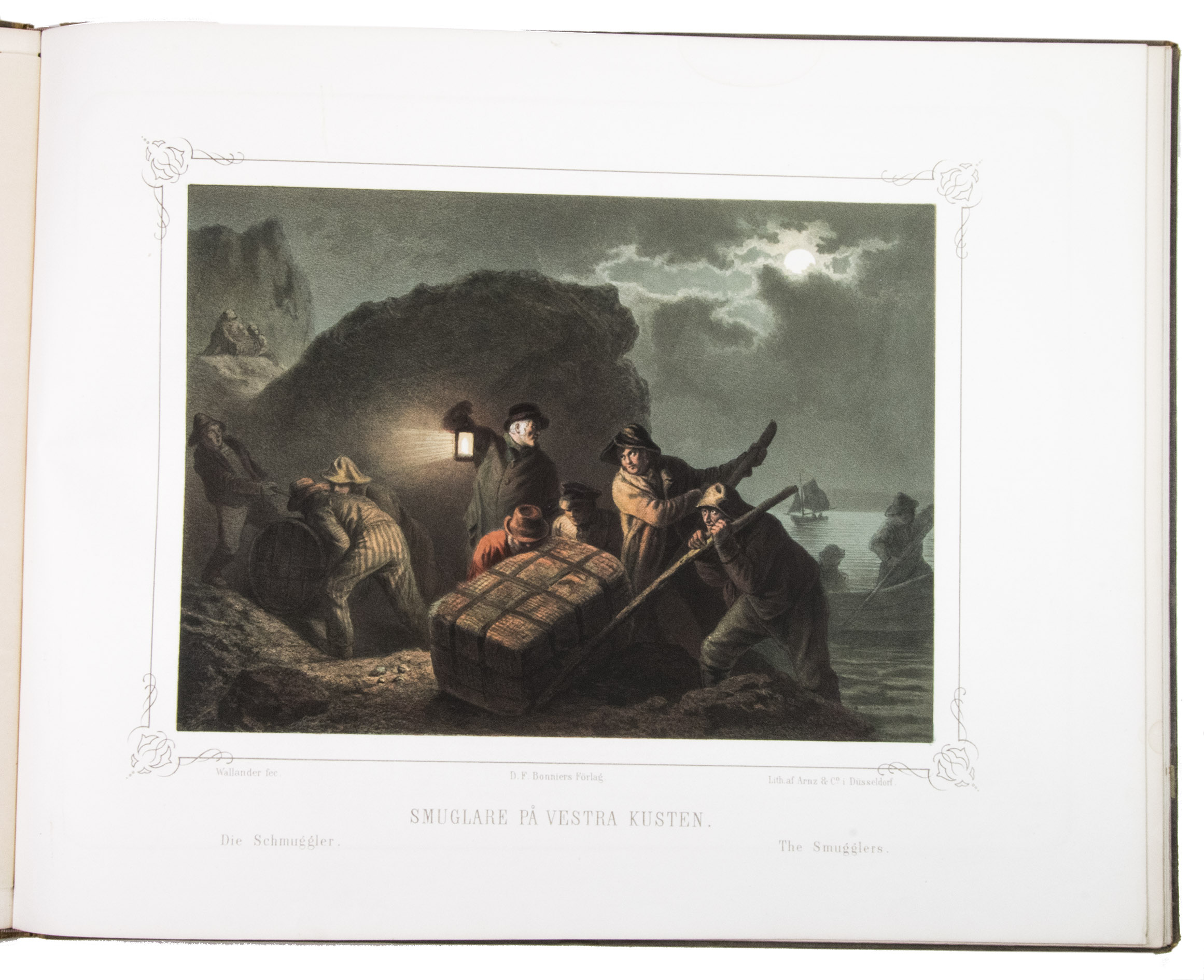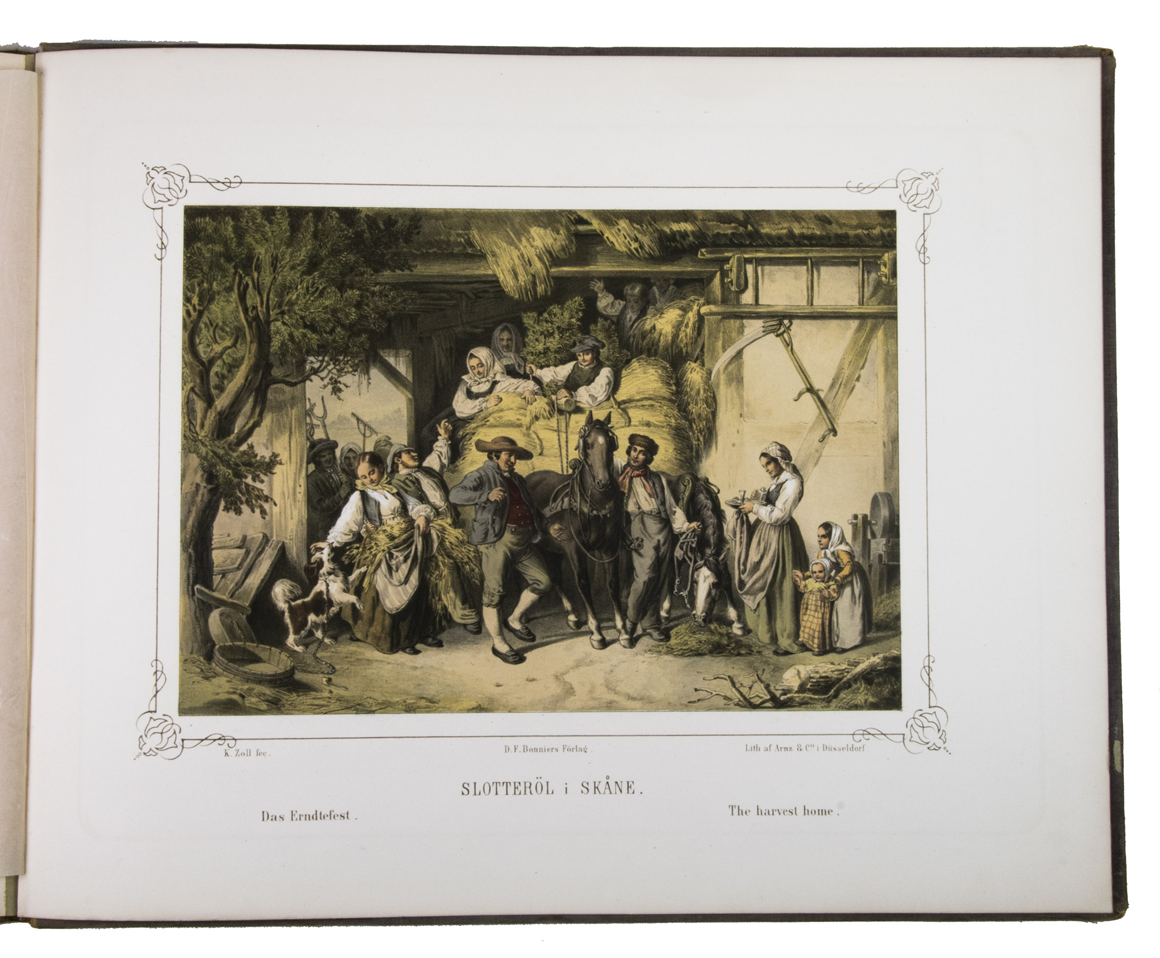 Gothenburg, D. F. Bonniers Förlag, 1855. Oblong folio (ca. 39.5 x 50 cm). With 12 full-page chromolithographed plates, separated by tissue paper guards. Contemporary quarter gold-tooled brown leather, [1], [1 blank], [1], [1 blank], [24] pp.