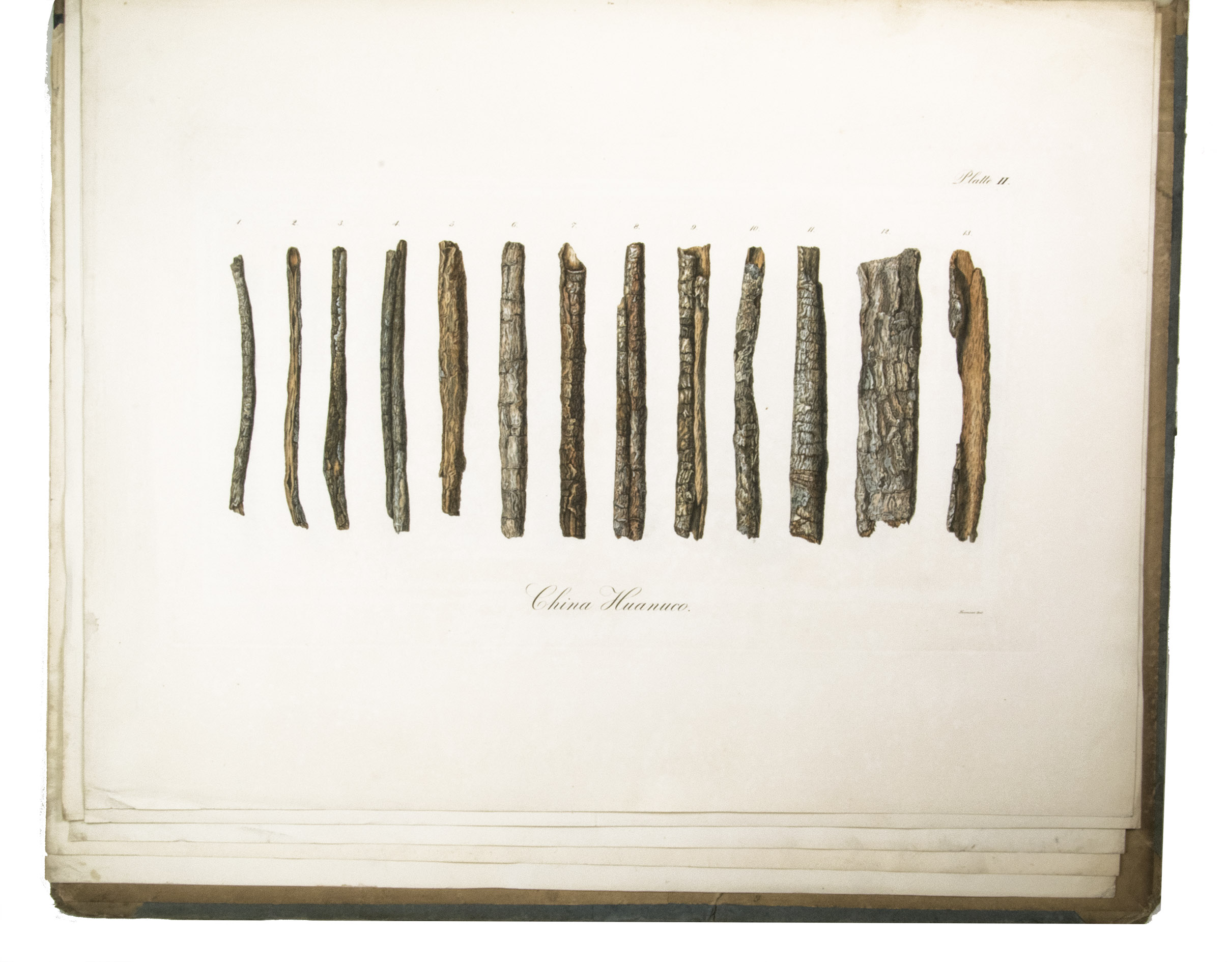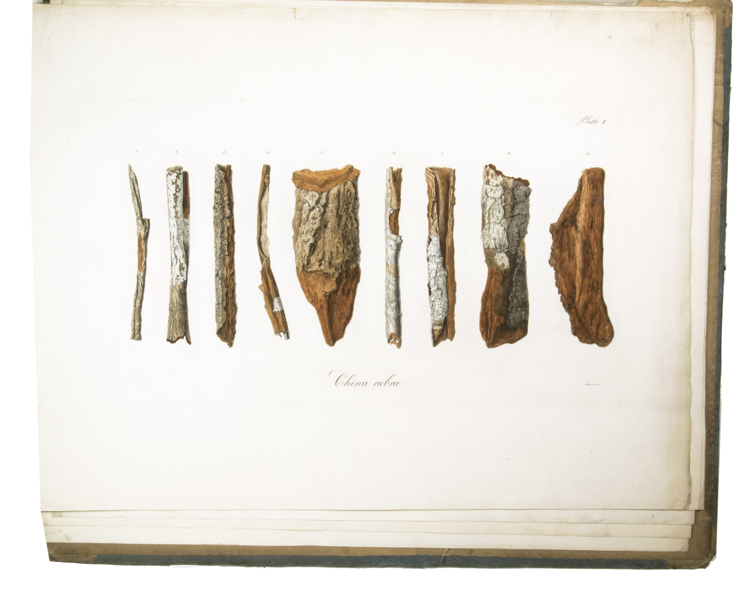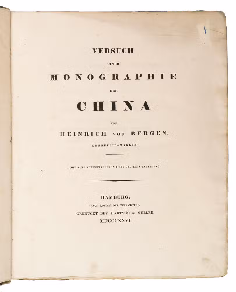First and only edition of this botanical work on cinchona bark, very rare with all ten tables present. Heinrich von Bergen (1792-1836), who was a "Droguerie-Makler" (drug-broker) at Hamburg, gives a state of the art description of the botanical, economic and pharmaceutical history of cinchona bark. The work opens with a 72-page long list of reference literature. Among the publications are those by Pelletier and Caventou, who were the first to isolate cinchonine and quinine in 1820 (DSB X, p. 497). The 8 coloured plates depict different types of cinchona bark (seven plates) and a Peruvian mountain with cinchona trees (plate 8) titled '' Geographie der Chinchonen'' after the plate by Alexander von Humboldt.