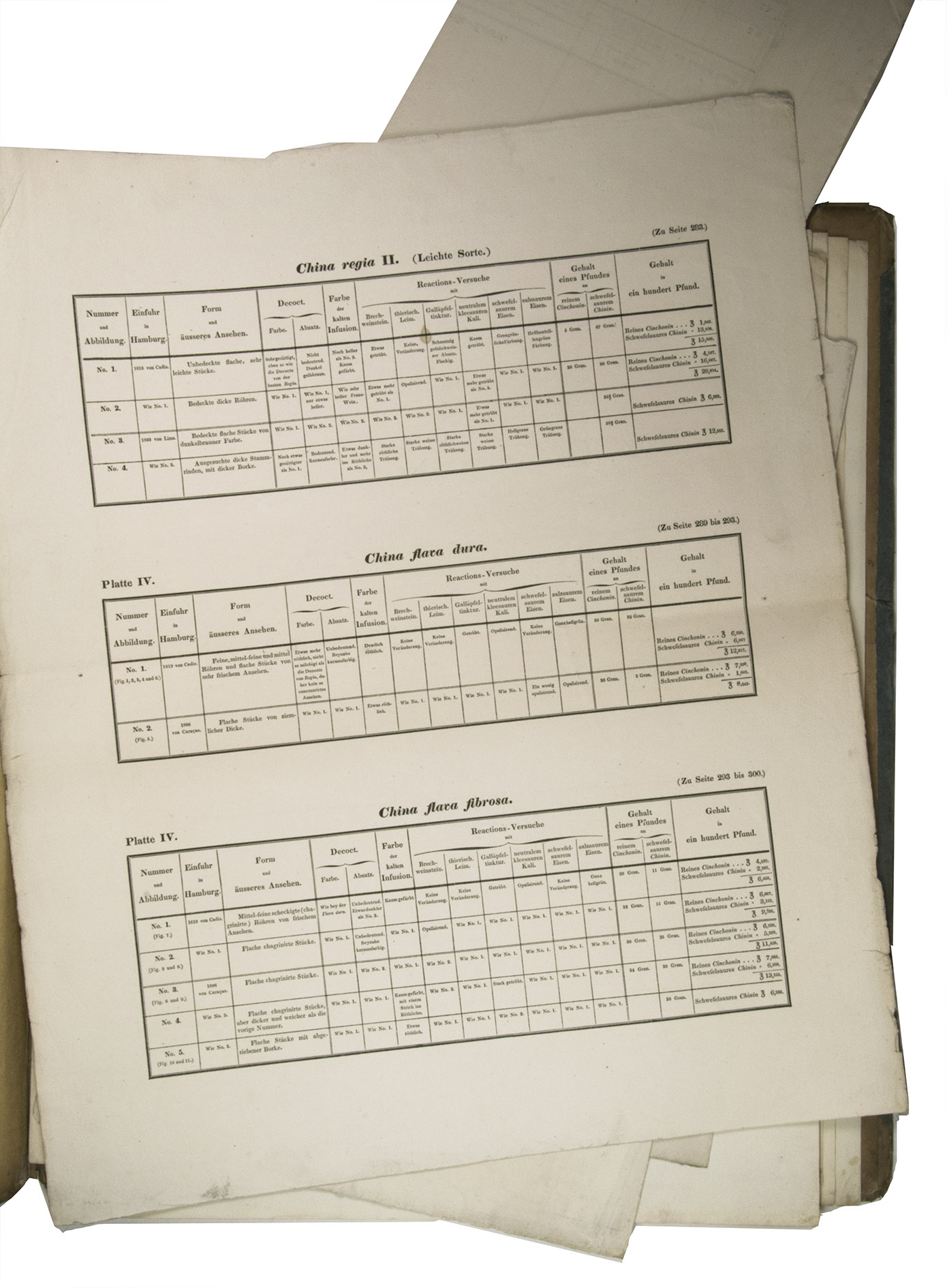Our copy contains all ten tables with test results of the extraction of cinchonine and quinine from different types of cinchona bark. These tables are lacking in the copies of the British Museum and the Wellcome Library. In the copy in the library of the Arnold Arboretum, the book is contains xii, 348 pages, accompanied by an oblong atlas of eight coloured plates and eight [!] tables. The explanation of the tables with their highly important conclusions (pp. 331-341) was written by Christian Heinrich Pfaff (1773-1852), a renowned professor of medicine, physics and chemistry at the University of Kiel (Poggendorf II, cols. 425-428). It is followed by an article on a procedure to extract cinchona salt from chinchona bark titled Art der Darstellung der Chinasalze aus den Chininrinden by H.L. von Santen.