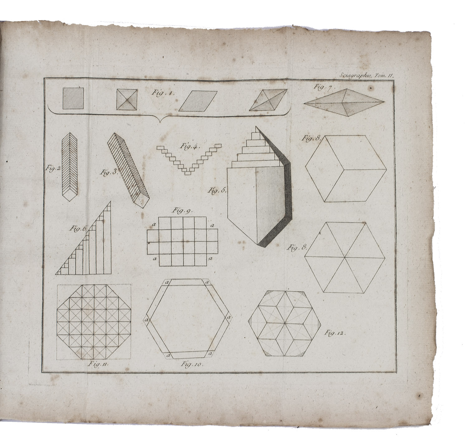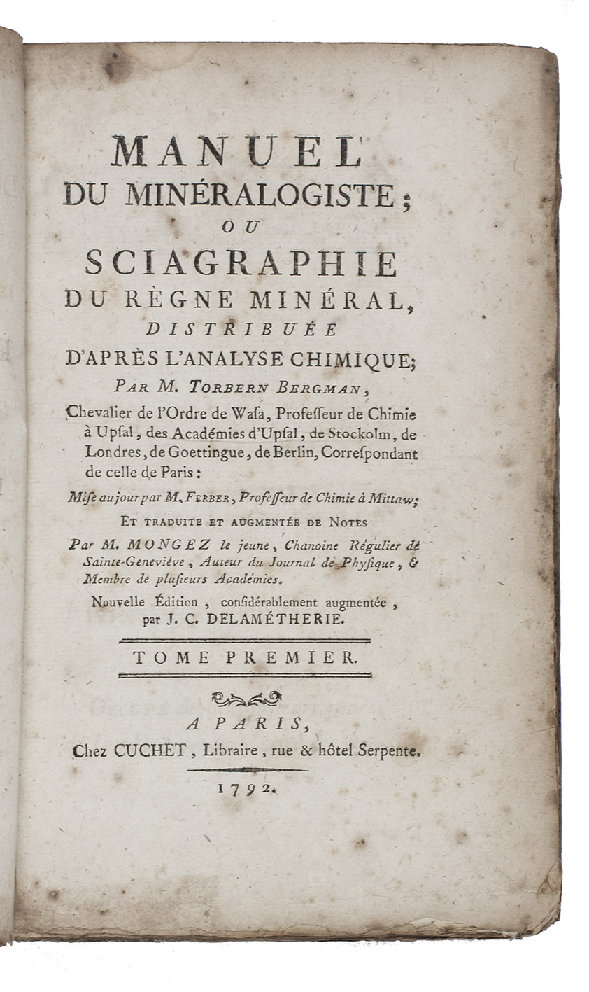 Enlarged second edition of an important mineralogical work by the Swedish scholar Torbern Olaf Bergman (1735-1784). "From 1775 he began to coin names related to chemical composition, and he attempted a general reform in Sciagraphia regni mineralis (1782) ... Following Linnaeus, Bergman divided inorganic substances into classes, genera, and species; and, as Linnaeus had done with plants and animals, he defined each class and genus by one word and each species by two" (DSB). The first edition consisted of 166 pages and J.C. Delaméthrie doubled the amount of information for the present edition. It provided the first classification of minerals by their composition, and thus based on purely chemical principles. Bergman's analysis also disproved the widely held "saline principle" in crystallization. The two engraved plates belonging to this edition show equipment and crytaline geometry.