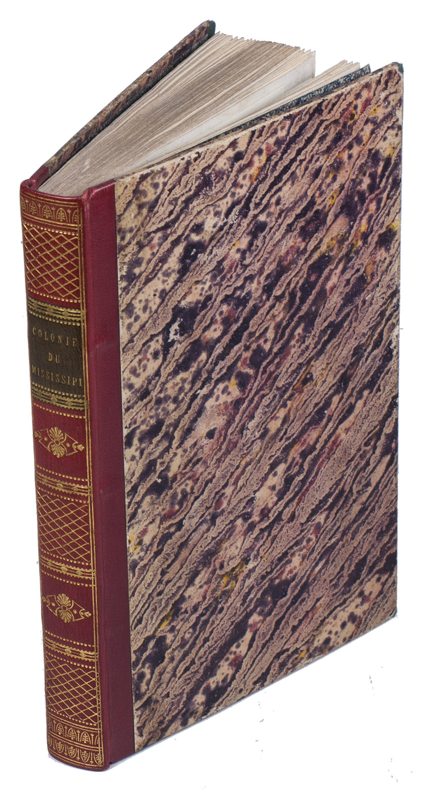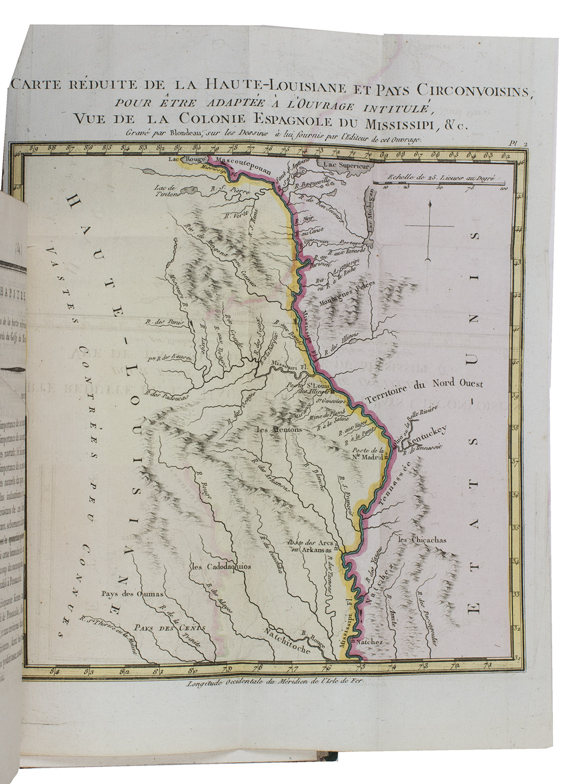 Paris, Imprimerie expéditive, 1803. 8vo. With 2 folding engraved maps of the Louisiana territory by Alexandre Blondeau after Berquin-Duvallon, both coloured by hand. Modern red half morocco, richly gold-tooled spine. XX, 318, 5, [5] pp.