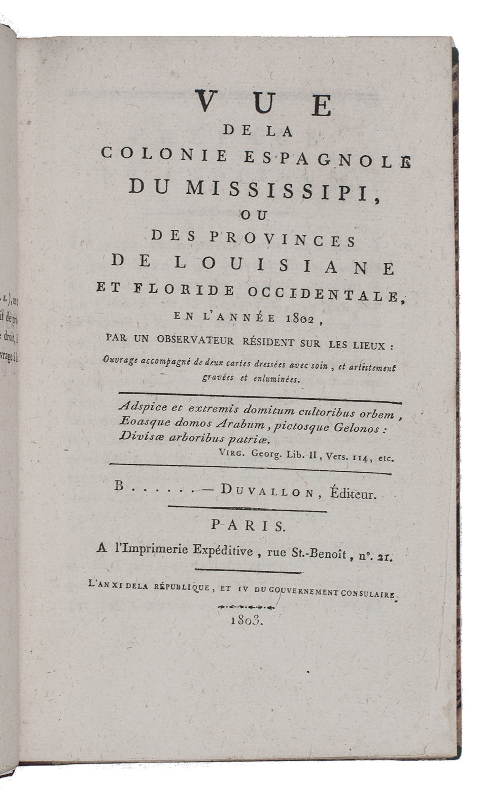 First and only edition in the original French, of a travel account of the territories of Louisiana and West Florida, then a French possession but administered by Spain. Pierre-Louis Berquin-Duvallon (1769-post 1814) was one of the many French plantation holders who had fled the Haitian Revolution on Saint-Domingue and settled in Louisiana. Embittered by his experience, he wrote an extremely negative report of Louisiana and its inhabitants, who had refused to admit the refugees' slaves. Nevertheless, after describing the geography and economy of the territories, Berquin-Duvallon gives a colourful account of the cities and their inhabitants, particularly of New Orleans. He found the latter to be a filthy place, unworthy to be titled a city, full of ramshackle buildings and streets that for the greater part of the year turn into open sewers. Its citizens fared no better, as he considered them to be noisy and amoral, they preferred drinking wine to conversation and only sought profit instead of education. The nightlife of New Orleans is particularly mentioned, with its gambling and endless dancing where the low orders indiscriminately mix: black and white, freeman and slave. In five specific chapters, the former plantation owner Berquin-Duvallon describes the various racial groups in the colony: white "creoles", white foreigners, freed people of colour and slaves.