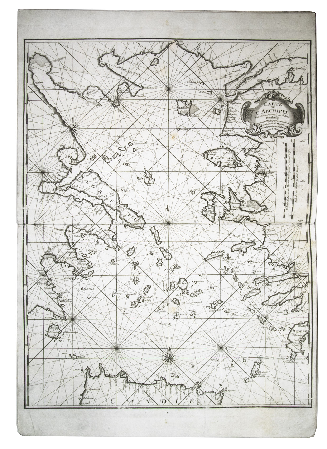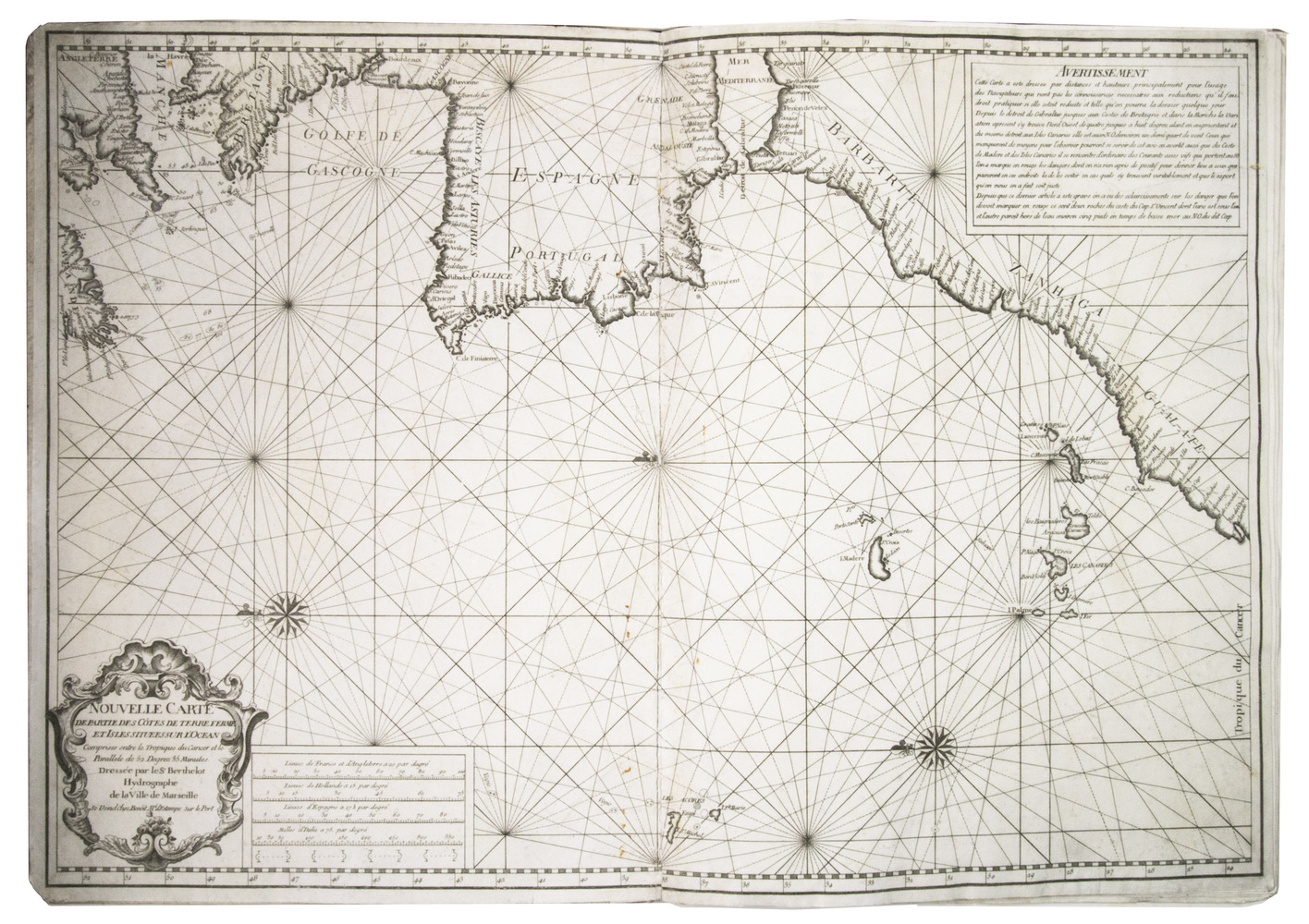 Fine example of this exceptionally rare nautical work depicting in detail the Mediterranean, which was a standard reference for French sailors in the region. The four charts are very crisp and clear, and together show every part of the Mediterranean Sea and the coasts of the countries that border it. Maps by François Berthelot (dates unknown) are very scarce, both on the market and in libraries, possibly due to the practical purpose they served. The present collection can only be found in the library of the University of California Berkeley.