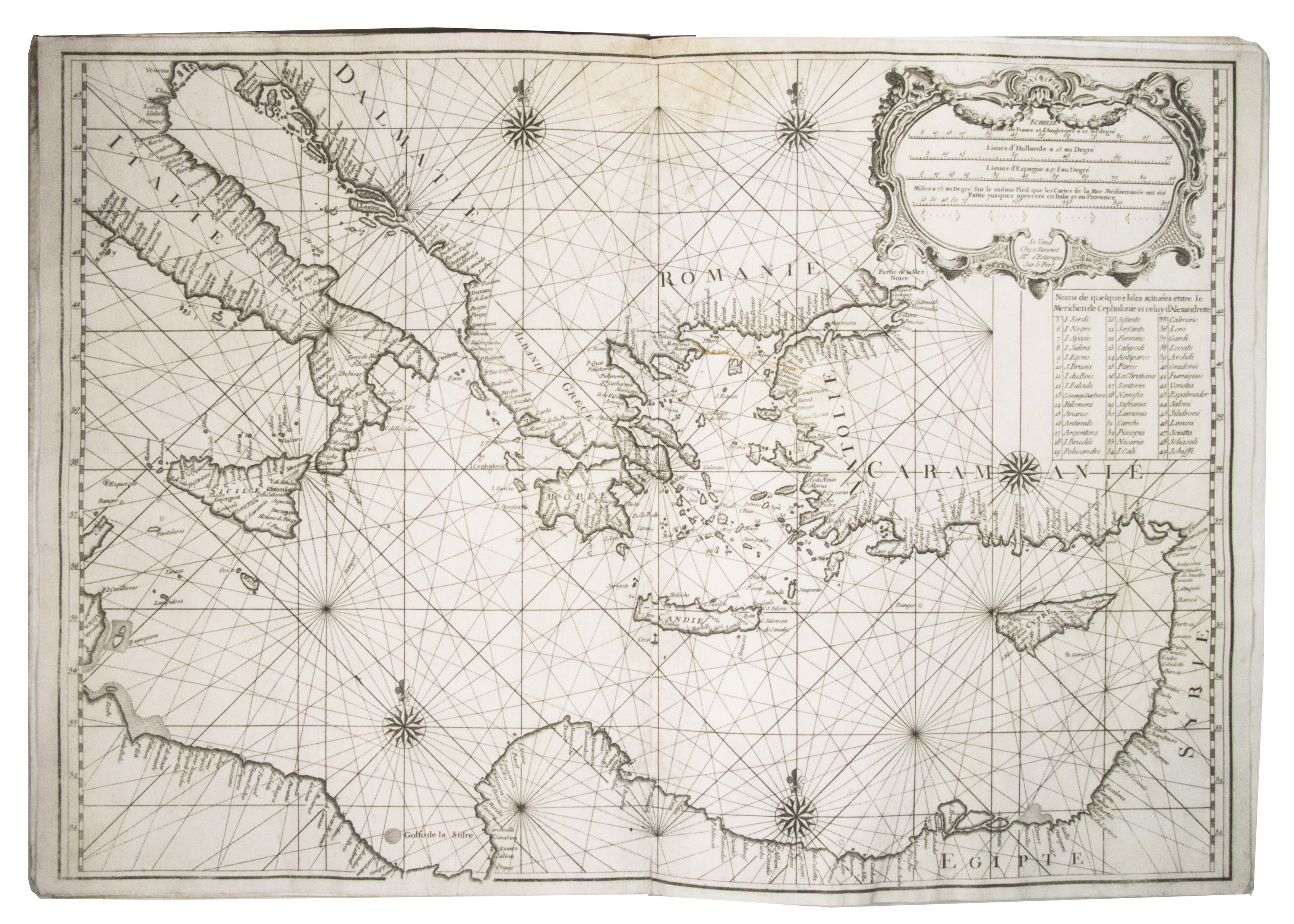 Marseille, "se vend chez Benoît", 1720-1730. Large folio (40 x 55 cm). With 4 double-page engraved maps, with the first half of the first map as the front paste-down and the second half of the last map as the back pastedown. Contemporary vellum-backed boards, reinforced with light brown leather at the head and foot of the spine. 4 nautical maps on [8] pp.