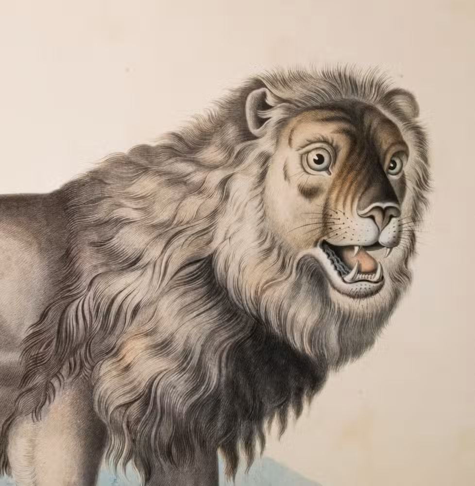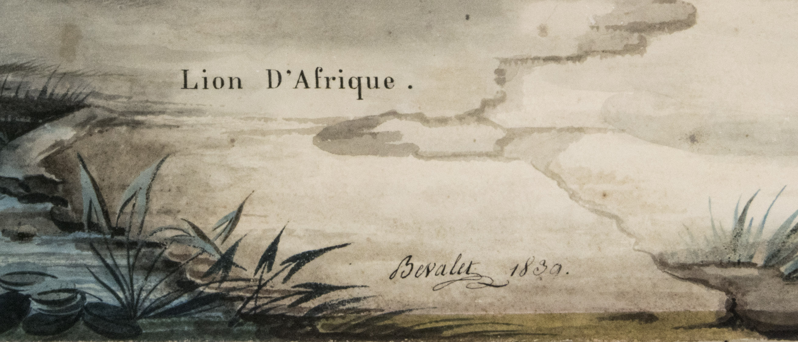 [France], 1839. Ca. 65 x 81 cm. Watercolour and ink drawing on wove paper (with a part of an unidentified watermark ["igant & C"] in the upper right corner). Titled Lion dAfrique, signed "Bevalet" and dated "1839" in black ink in the lower part.