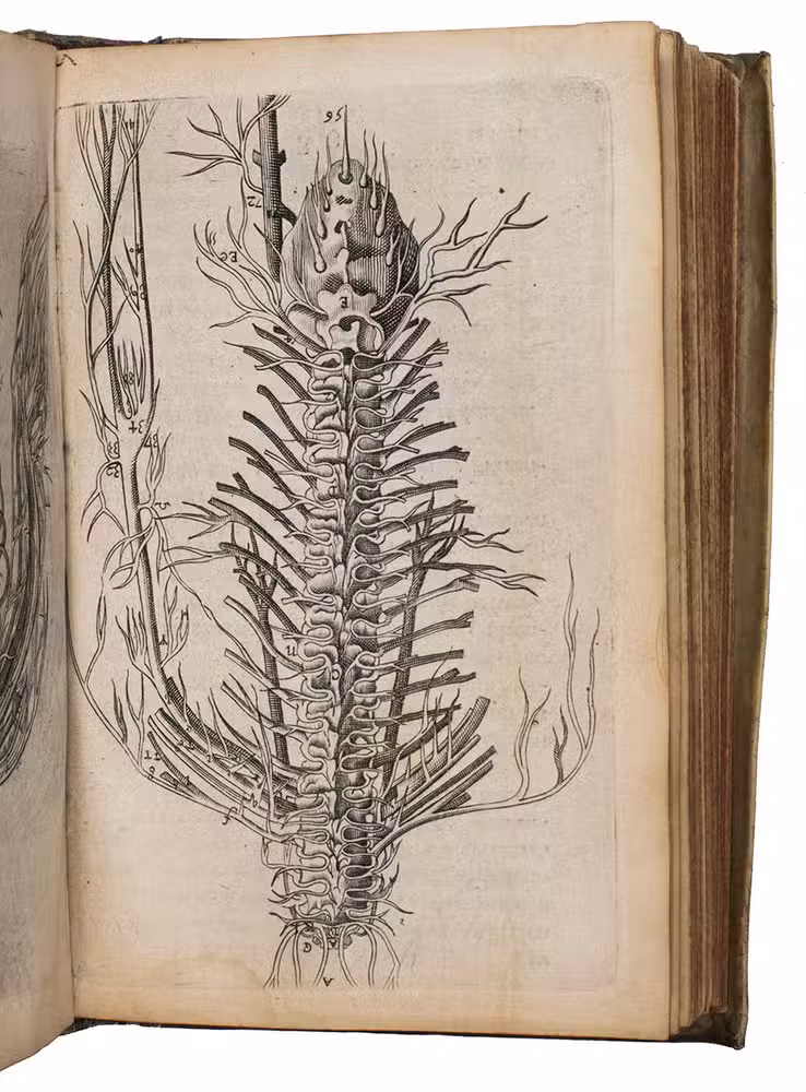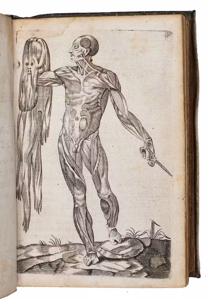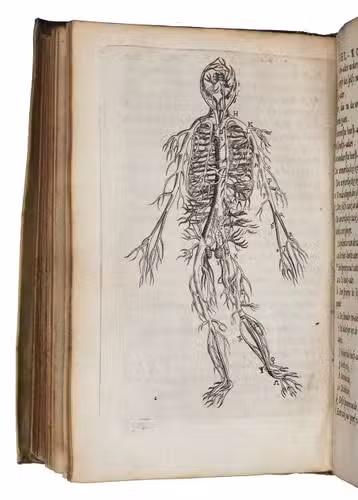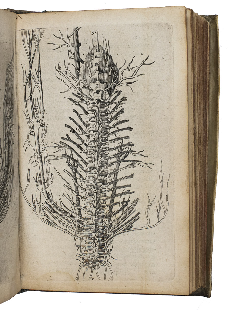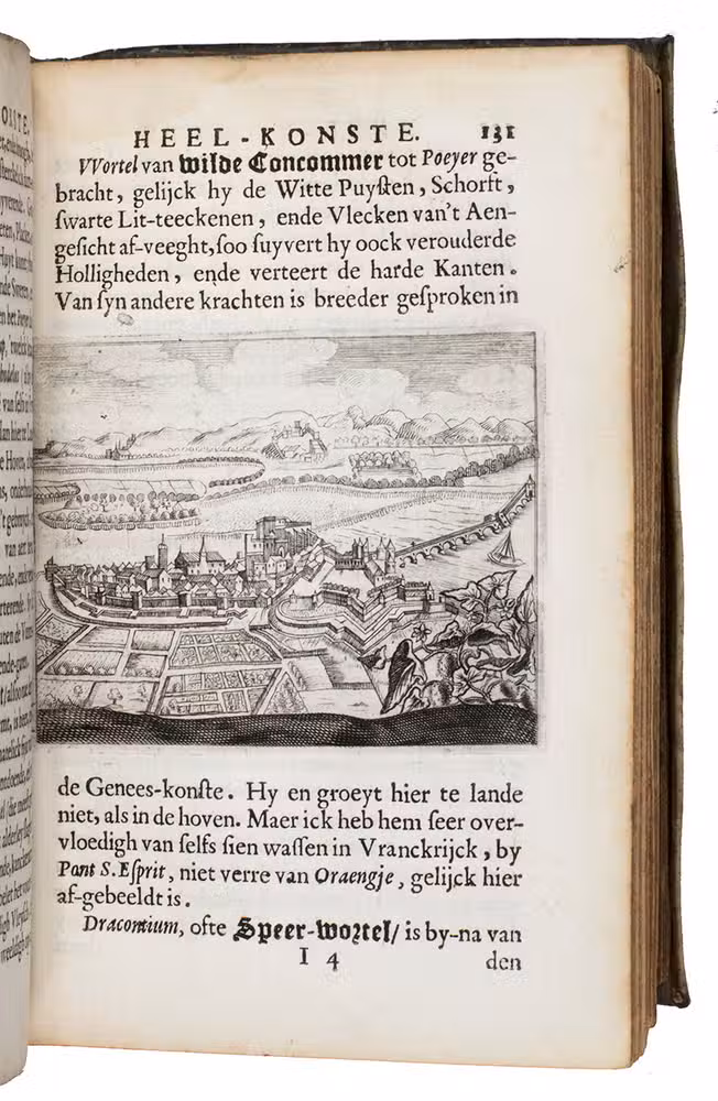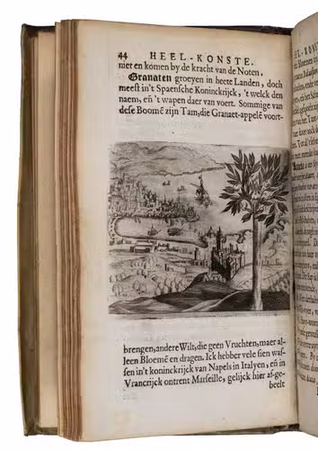 Small 8vo. With an engraved frontispiece, an emblematic engraving in the preliminaries, 5 engravings of herbs and plants, including 3 with views of Granada, Orange and Cairo, 2 anatomical engravings in the text and 11 full-page engraved anatomical plates. Original overlapping vellum, manuscript title on spine, red edges. [44], 487, [7]; [6], 176 pp.