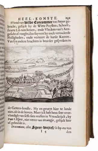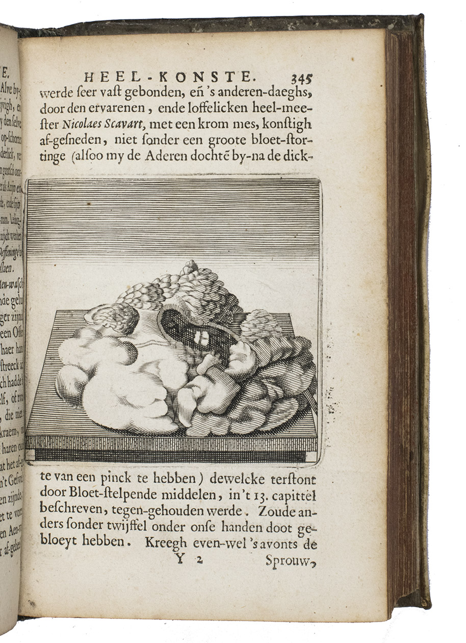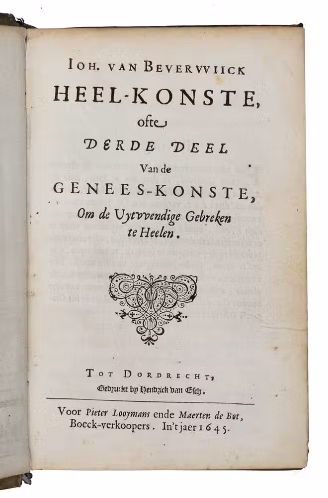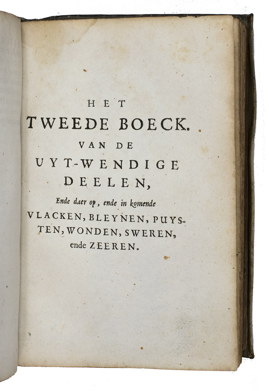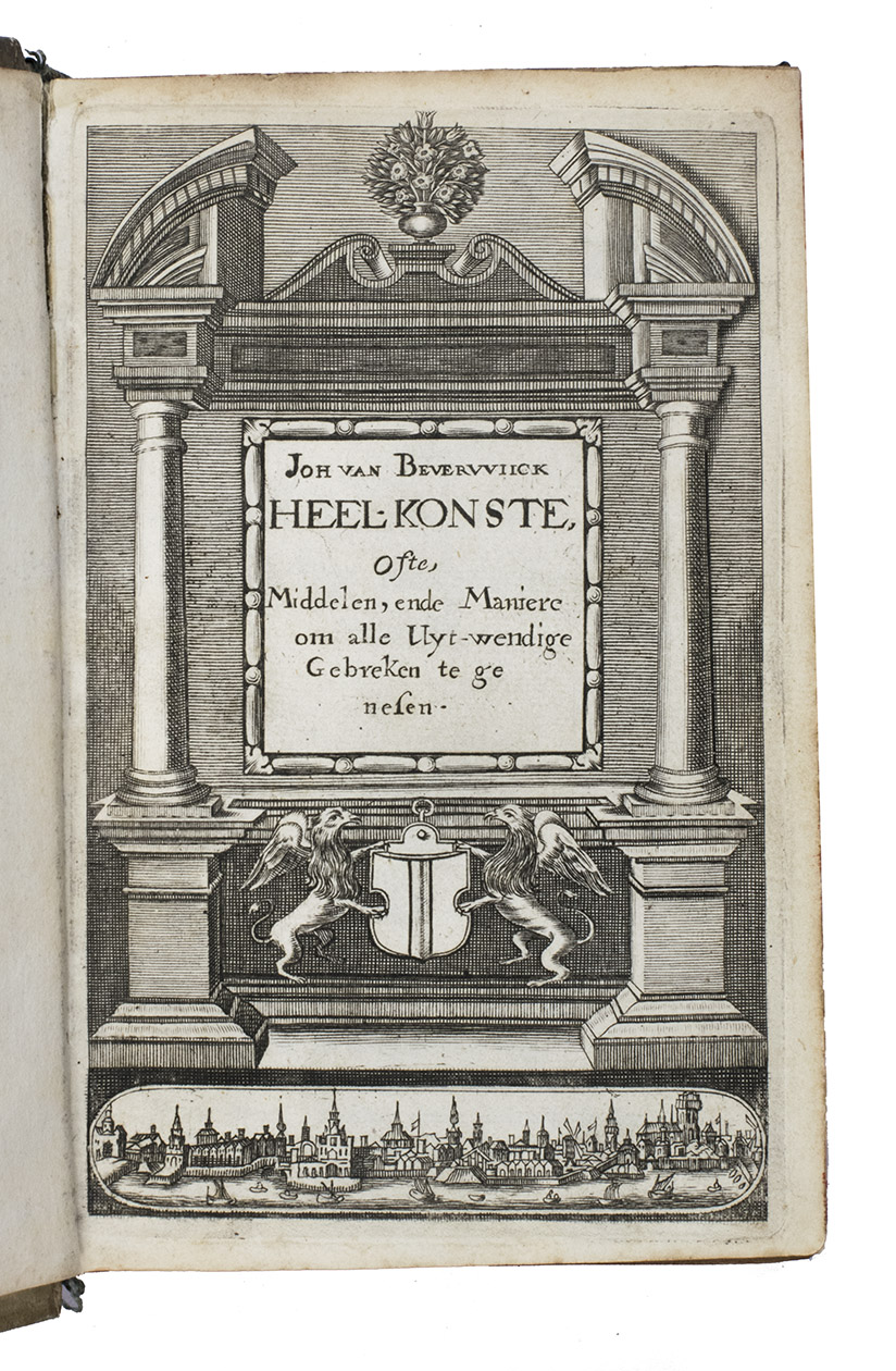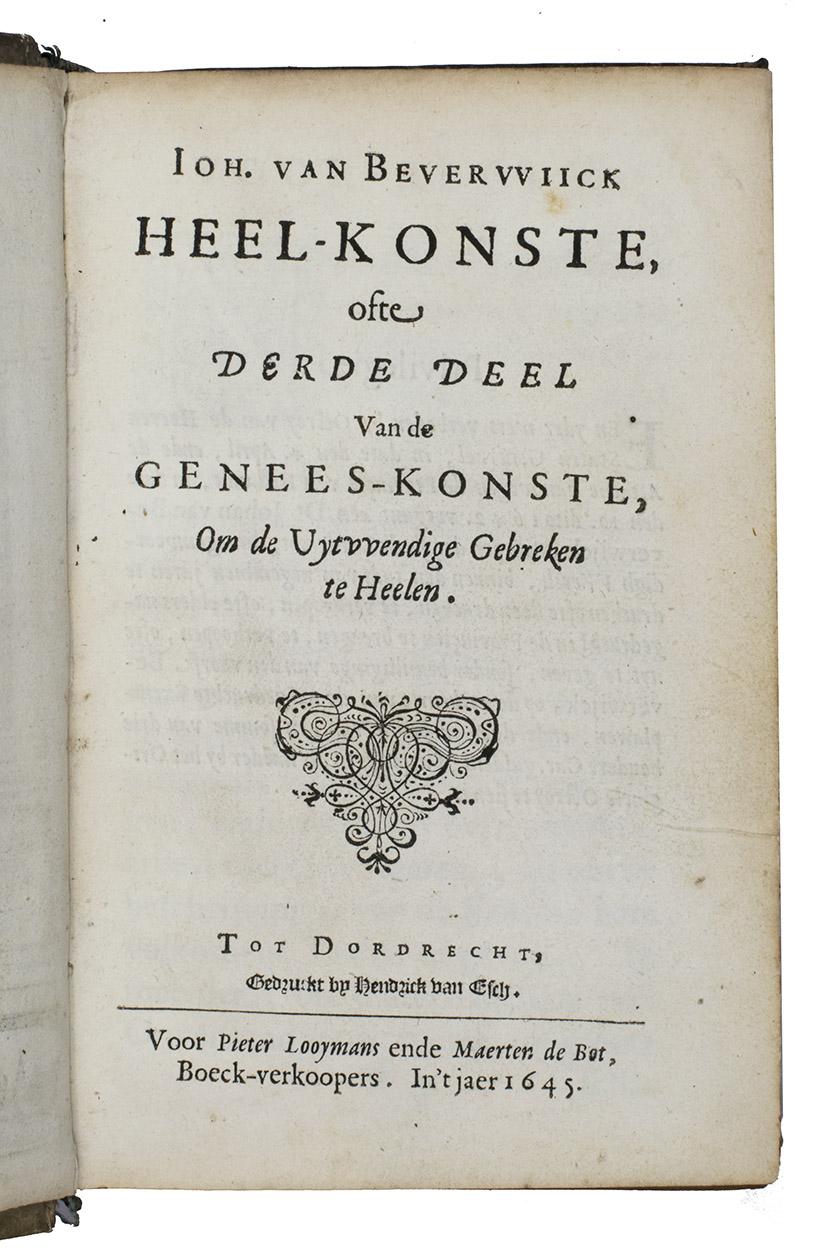 Ad 1: First edition of a practical manual of surgery by Jan van Beverwijck, in Latin Beverovicus, (1594-1647). He and Andreas Vesalius were among the few physicians of the Low Countries to enjoy international fame. He had studied at Padova, then the most advanced university for medicine, and became town physician and Lector in Surgery at his native Dordrecht. Of interest in the present work is the discussion of and manner of preparation of a large number of healing plants and fruits, preceding the main work on practical surgery.