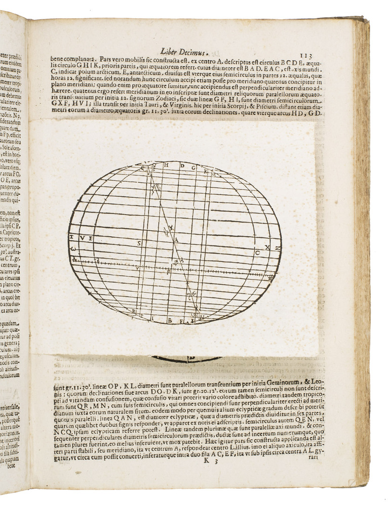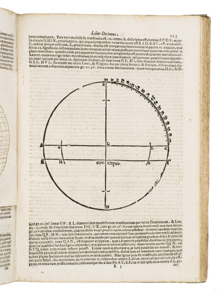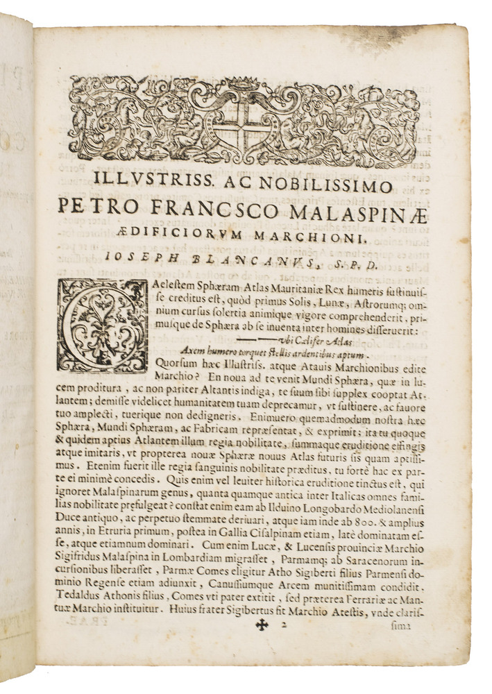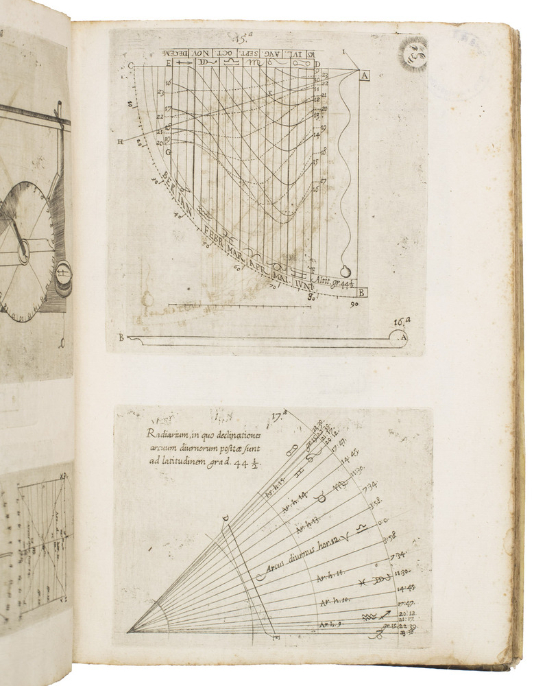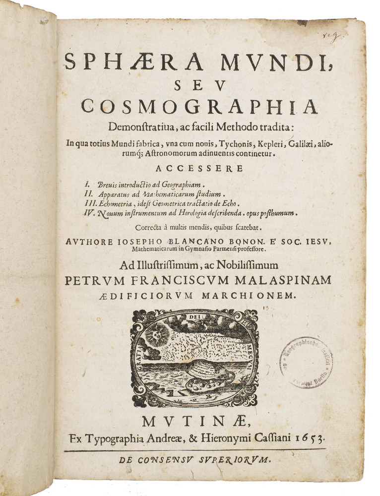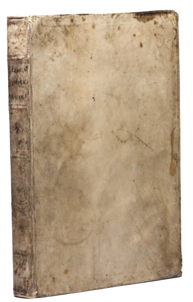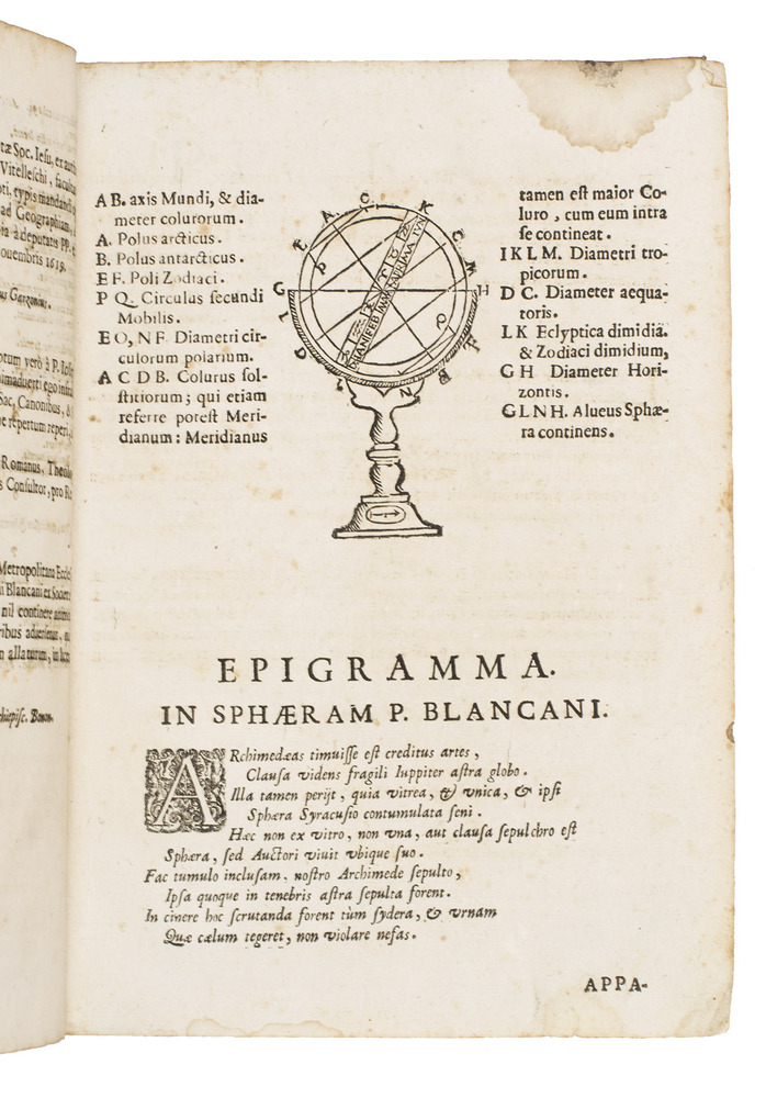 The two most important works of the famous Jesuit mathematician Giuseppe Biancani (1566-1624). Here the third edition of his Sphaera mundi, with the second edition of his Constructio instrumenti. The former presents a summary of the recent progress in astronomy from discoveries made with the telescope by famous scientists like Tycho Brahe, Kepler, Galileo and Copernicus. Biancani never gave up the geocentric view of the universe, noting that Copernicus's heliocentric view was forbidden by the Church, but he ascribes tides to the influence of the moon, discusses the moons of Jupiter and Saturn, refers readers to the work of Tycho and Kepler, discusses sonic echoes, and even anticipated Halley in suggesting that comets might be periodic. The second work, devoted to the construction and use of sundials, includes precisely drafted diagrams and clear illustrations that allow one to construct a sundial exactly as Biancani did shortly before his 1624 death.