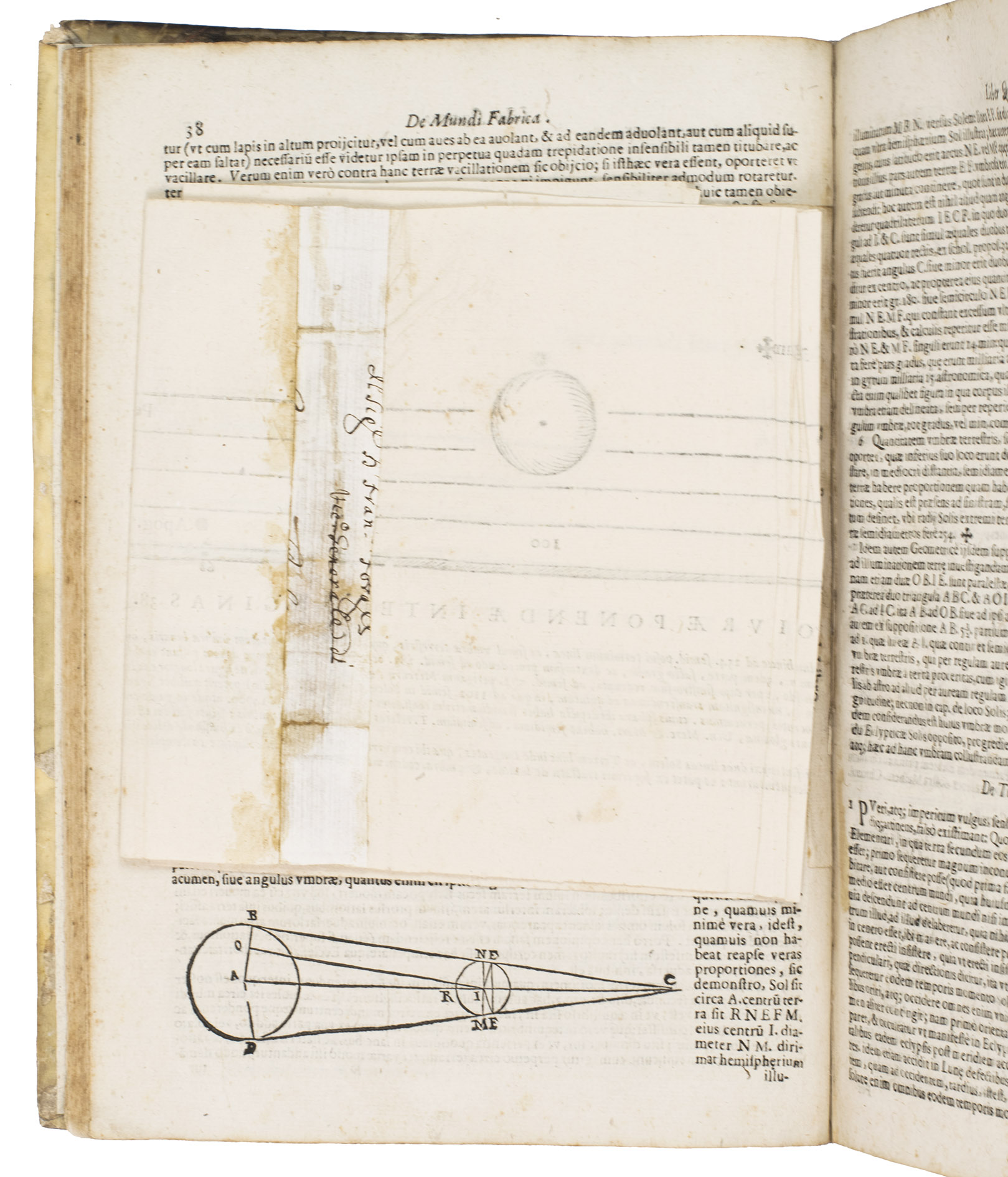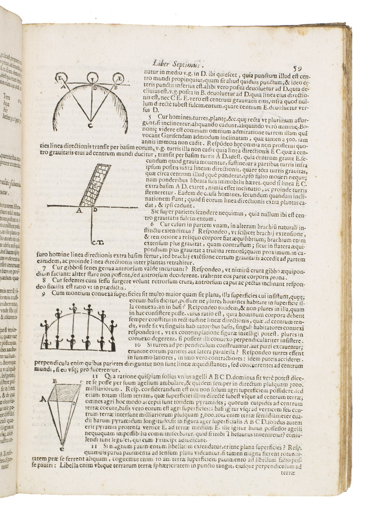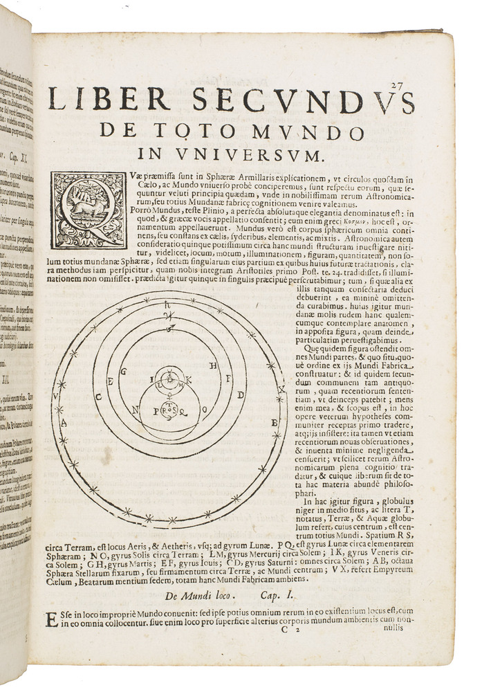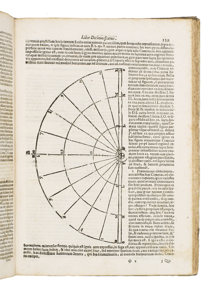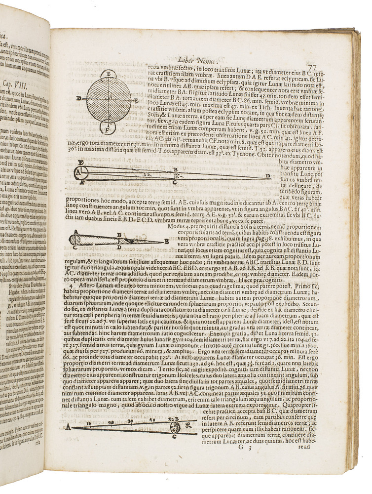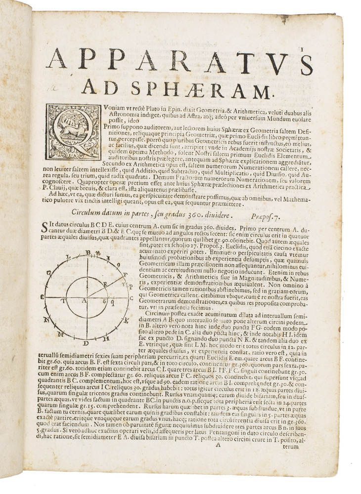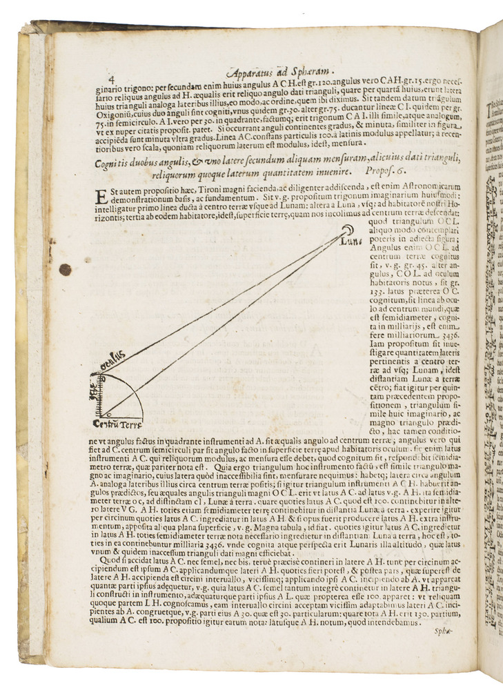 The two most important works of the famous Jesuit mathematician Giuseppe Biancani (1566-1624). Here the third edition of his Sphaera mundi, with the second edition of his Constructio instrumenti. The former presents a summary of the recent progress in astronomy from discoveries made with the telescope by famous scientists like Tycho Brahe, Kepler, Galileo and Copernicus. Biancani never gave up the geocentric view of the universe, noting that Copernicus's heliocentric view was forbidden by the Church, but he ascribes tides to the influence of the moon, discusses the moons of Jupiter and Saturn, refers readers to the work of Tycho and Kepler, discusses sonic echoes, and even anticipated Halley in suggesting that comets might be periodic. The second work, devoted to the construction and use of sundials, includes precisely drafted diagrams and clear illustrations that allow one to construct a sundial exactly as Biancani did shortly before his 1624 death.