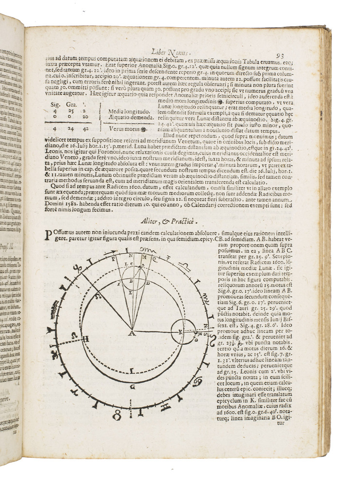 Modena, Andrea Cassiani, 1654. With a woodcut astronomical dial on the title-page, 18 numbered engraved figures printed from 12 copper plates and a large folding letterpress table. 2 works in 1 volume. Folio. Contemporary sheepskin parchment, rebacked. [6], 232; 24, [5] pp.