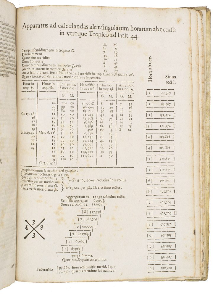 Modena, Andrea & Girolamo Cassiani, 1653. With a large folding diagram, a woodcut diagram on an inserted half-page slip, numerous woodcut diagrams and other illustrations in text, letterpress tables.