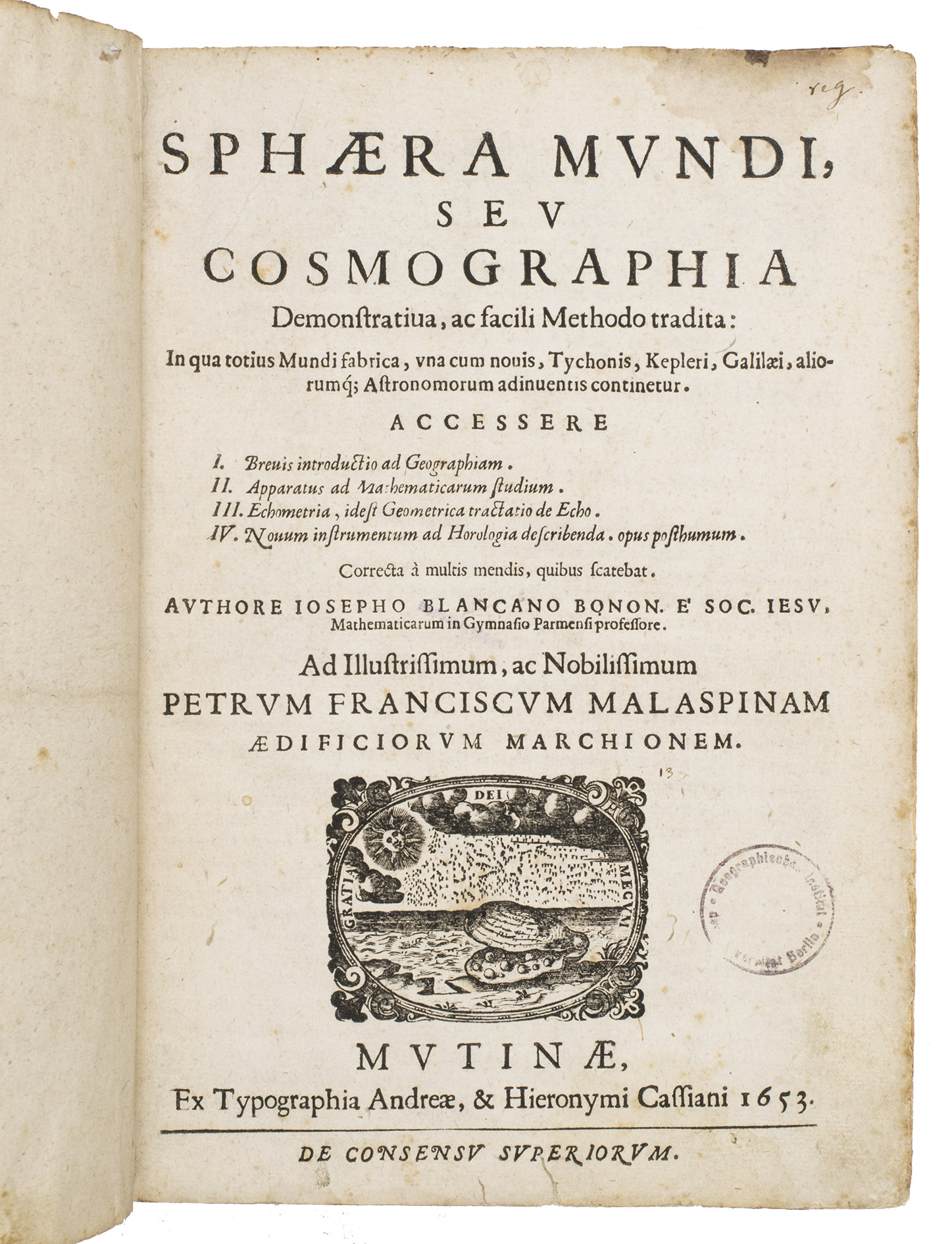 Sphaera mundi, seu cosmographia demonstrativa, ac facili methodo tradita: in qua totius mundi fabrica, una cum novis, Tychonis, Kepleri, Galilaei, aliorumq[ue] astronomorum adinventis continetur.