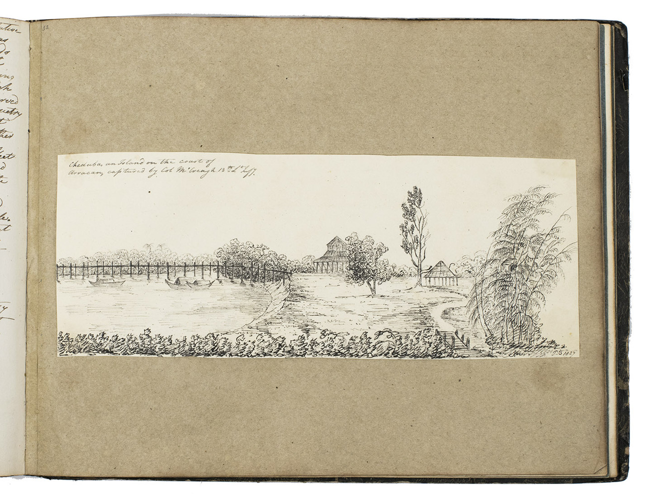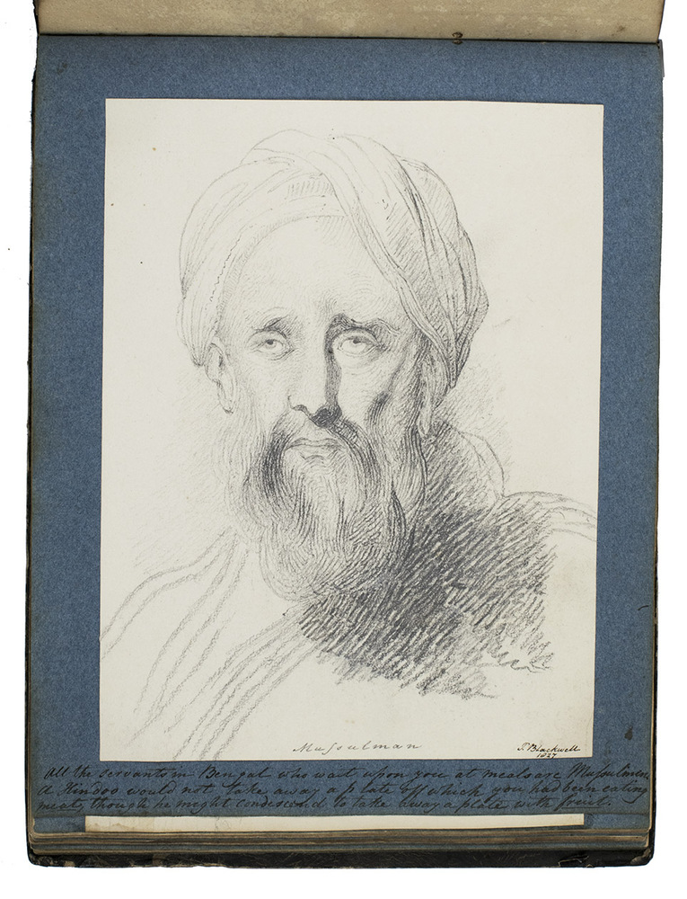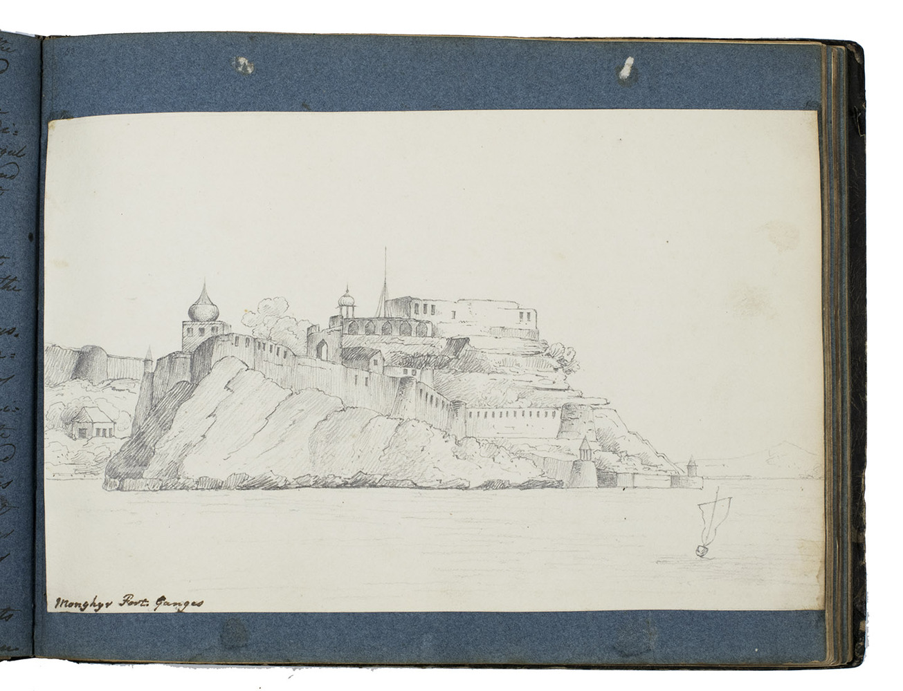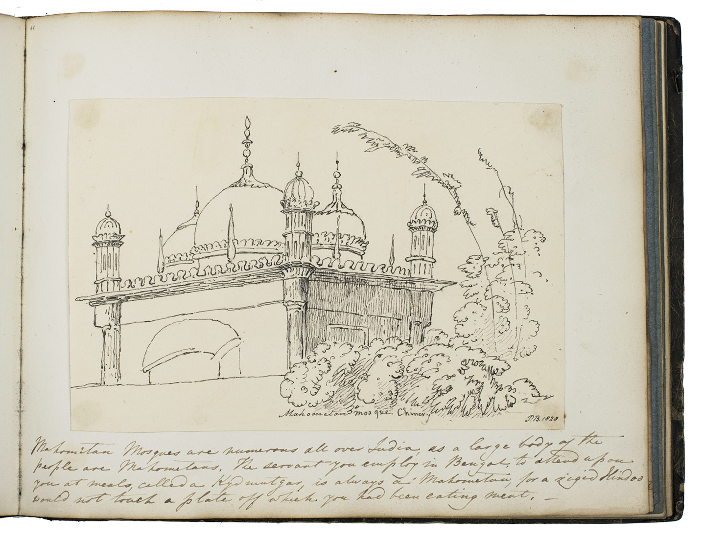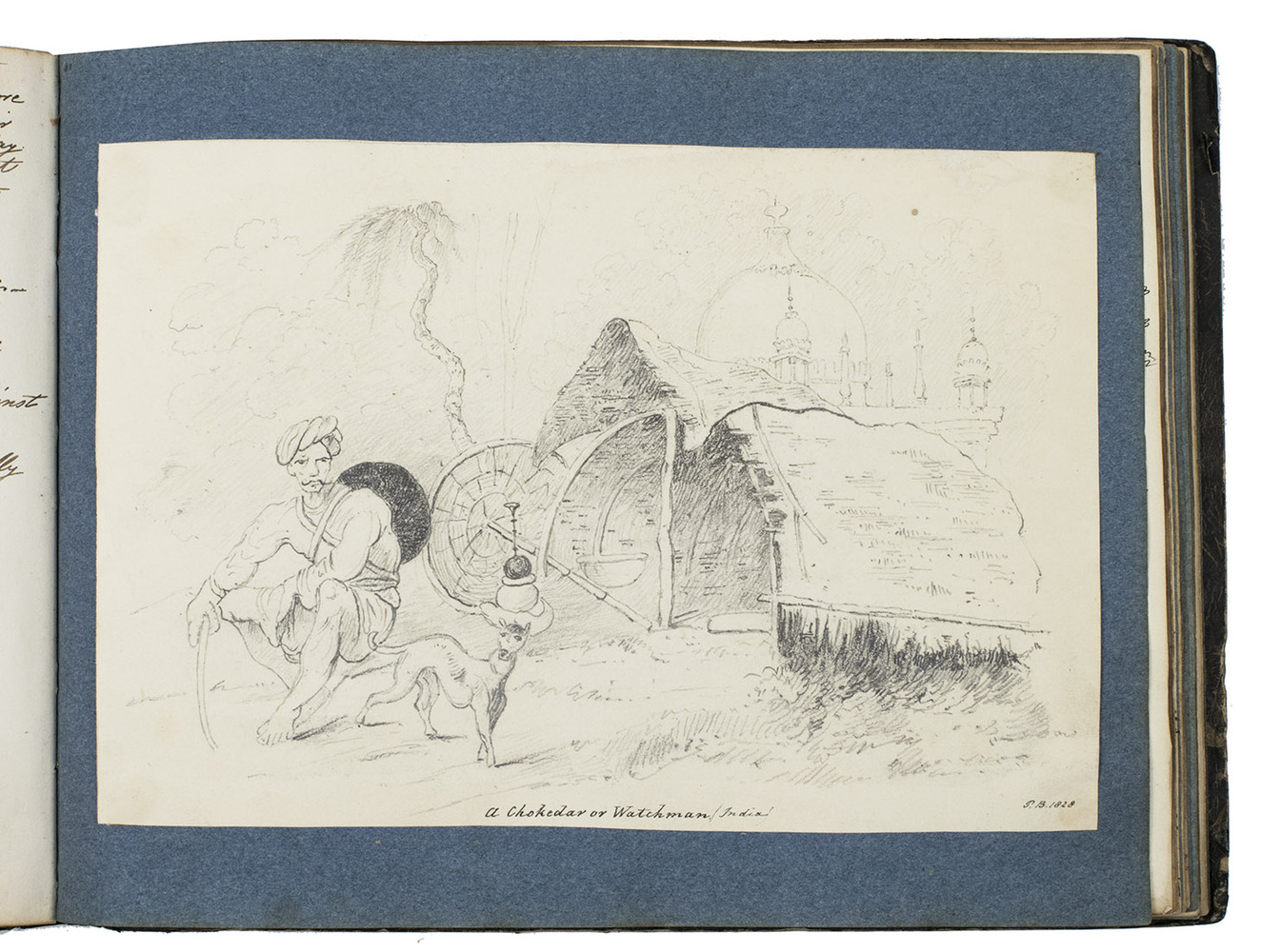Sketchbook by the English lieutenant Thomas Eden Blackwell (1803?-1845), showing views of India, Burma and Switzerland, made in the years 1826-1830, when India, which is the subject of about 30 of the sketches, and parts of Burma (nowadays Myanmar) were British colonies. The sketches, most signed and dated by Blackwell, are mounted on album leaves and accompanied by manuscript captions and descriptions, also by Blackwell and sometimes by a later hand. These descriptions explain the sketches in more detail. Some of these remarks are general or contain interesting facts, while others are very personal or describe an event that happened during Blackwells time as officer.