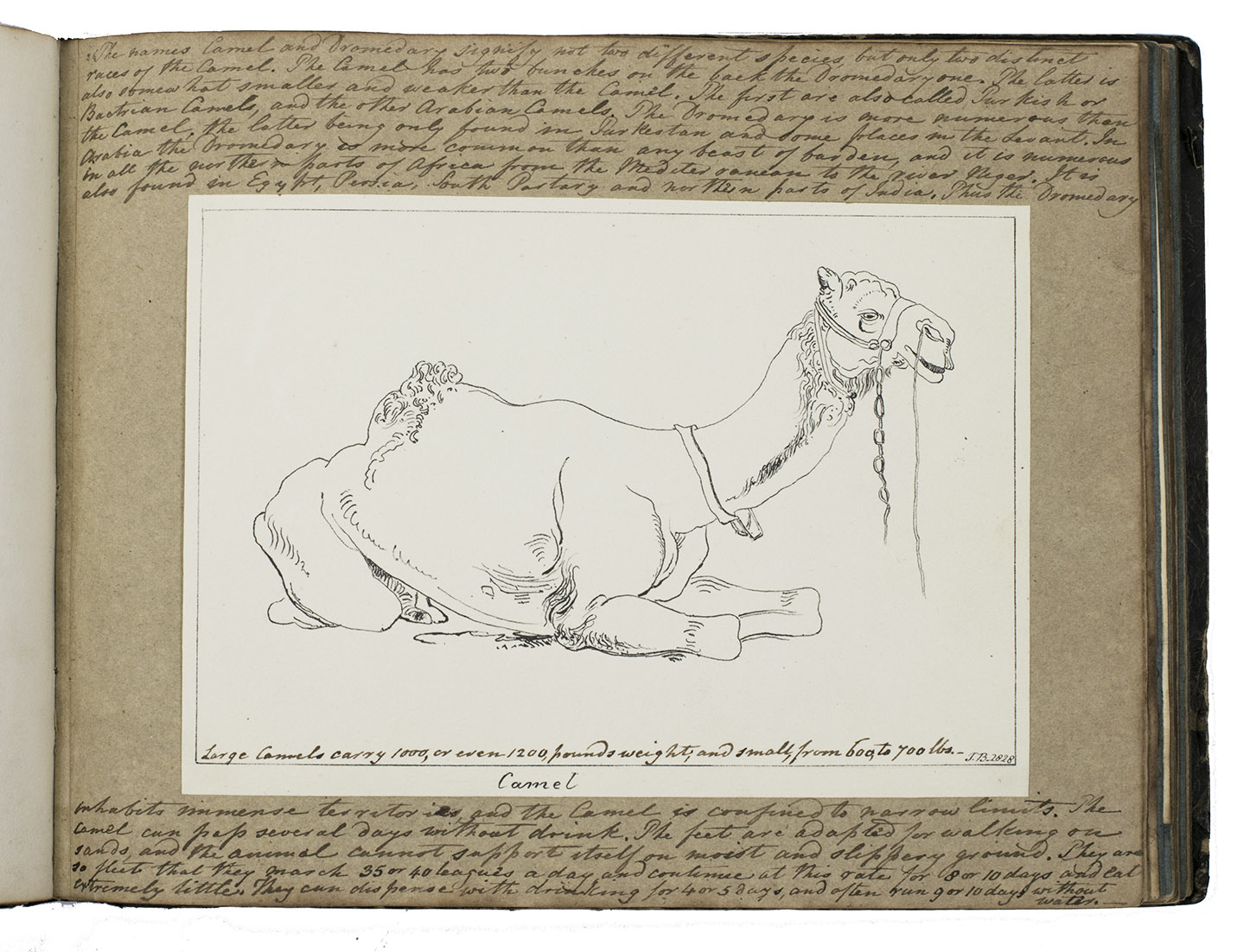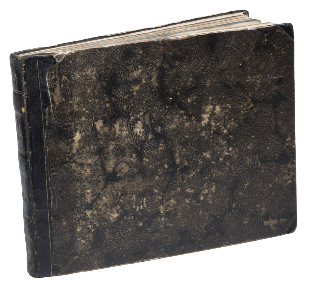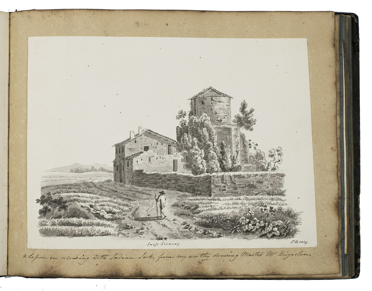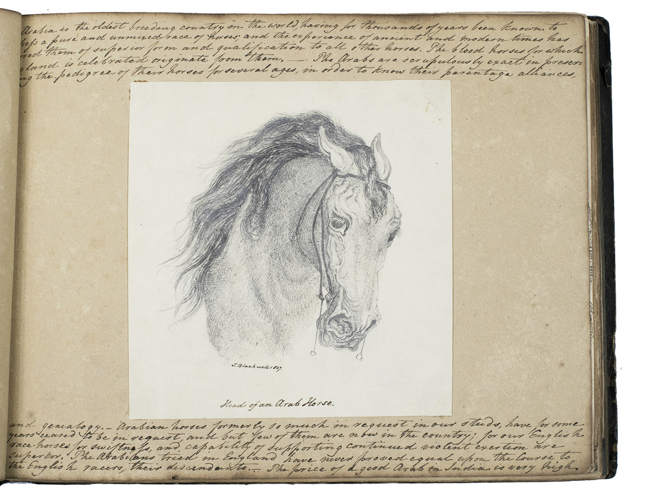 [Various places, ca. 1826-1830]. Oblong 4to. With 66 sketches in pen & ink and pencil, mostly signed by Blackwell, mounted and bound in, with manuscript captions. There is also 1 print (ca. 1795/1800?) drawn by Singey Bey and engraved by Thomas Medland. Half black morocco, black decorated paper sides, gold-tooled ornaments on spine. [70] gray, white and blue album ll., containing 67 sketches and their accompanying manuscript captions and descriptions.