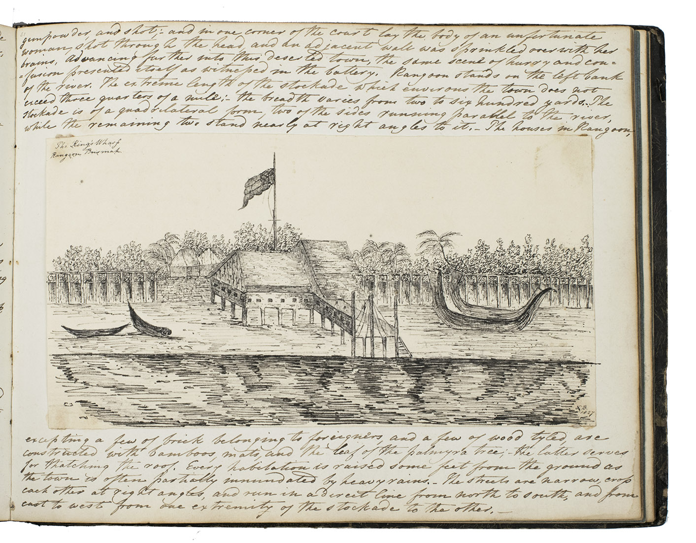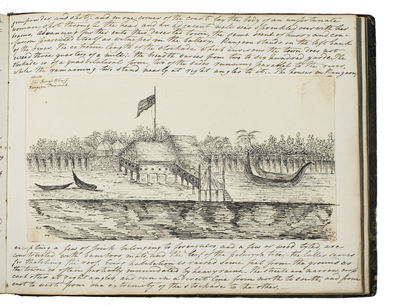 For Burma (now Myanmar), for which not very many sketches were made, Blackwell made only a few sketches, but focussed mostly on the coasts and the city of Ragoons wharfs. The only exception is a sketch of the so-called great bell in Ragoon, which is representative for all the bells in Burma, which are often located near celestial buildings. The album also includes two views of Tobago in the West Indies.