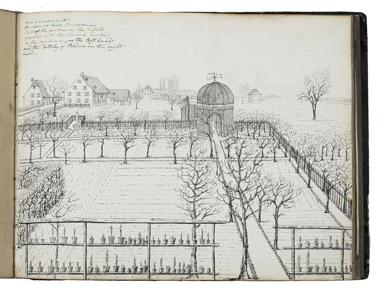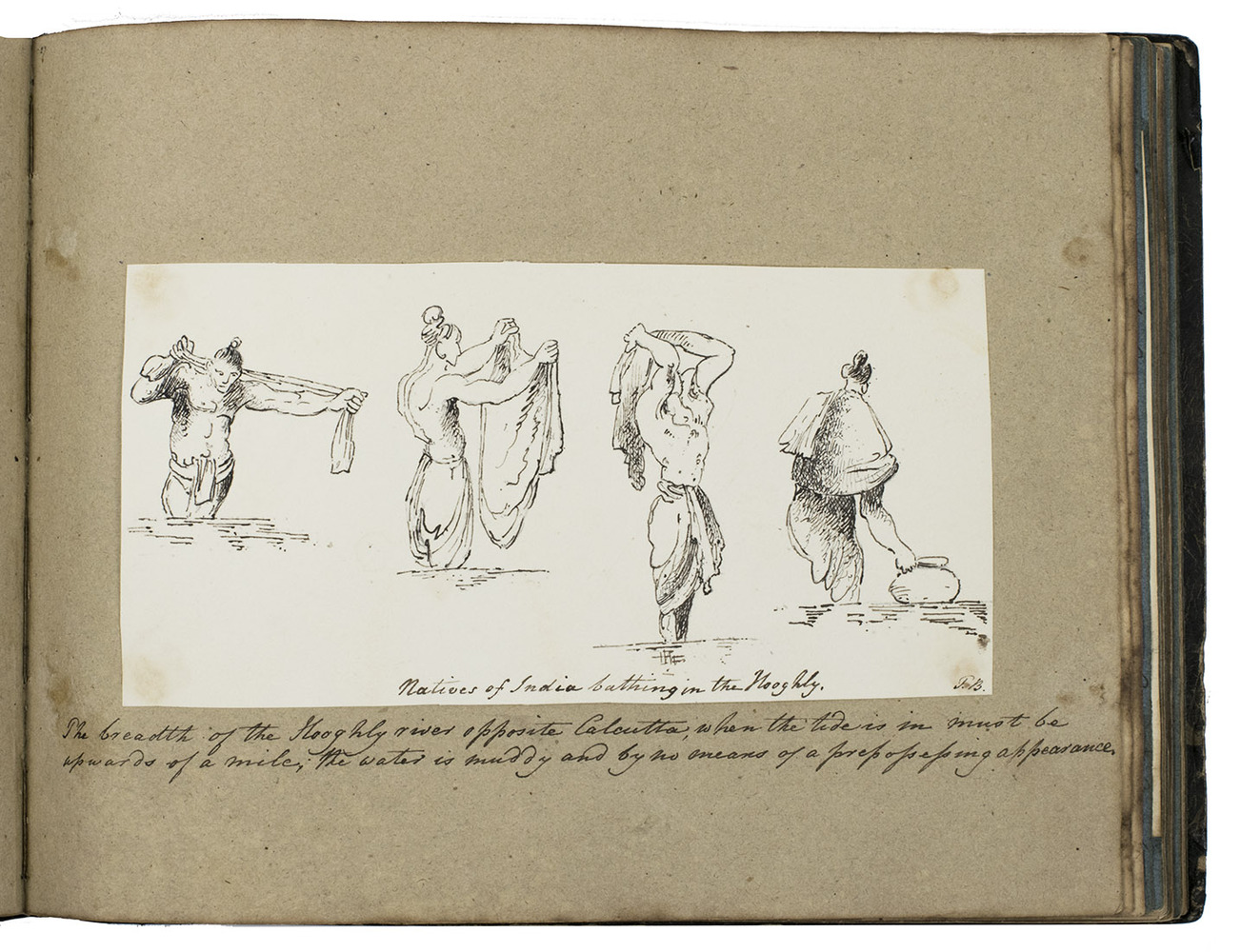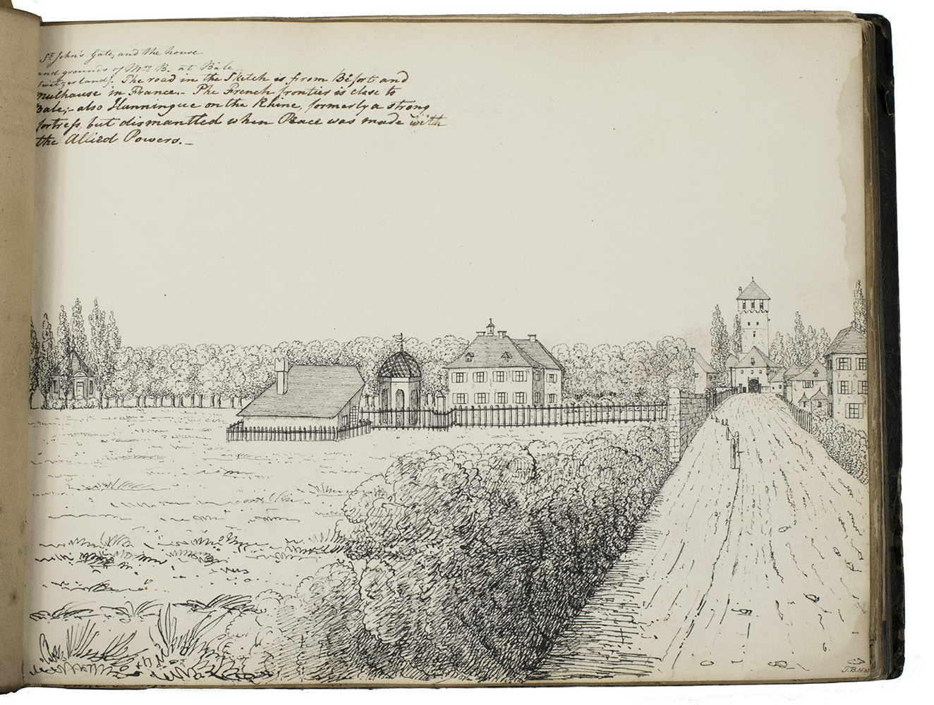 Another large part of the sketchbook consists of sketches of Swiss landscapes and panoramas, especially of the region surrounding the Swiss city of Basel. This sketchbook, nearly a personal dairy of Lieutenant Blackwell, contains sketches outlining a variety of subjects. He gives us an insight into Indian habits, animals and inhabitants, in the breeding of Arabian horses, shows us Swiss and Burmese landscapes and also Indian architecture and culture. With his refined drawings, Blackwell offers the reader an interesting historical artefact that gives an insight into the life of an English officer in the first half of the 19th century and the cultures he encountered, including his remarks upon them.