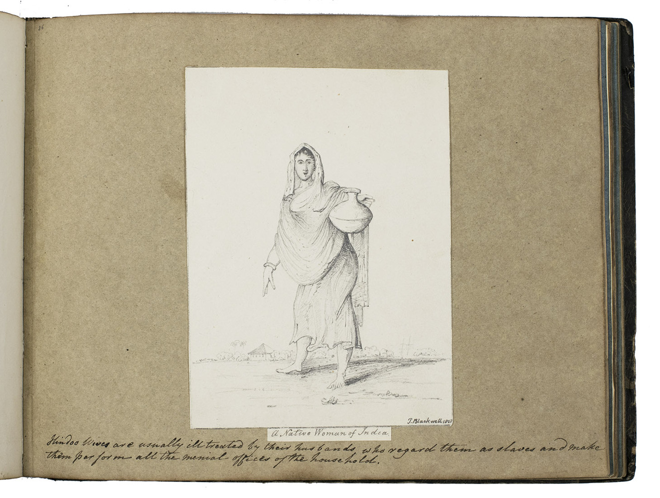 As noted, most of the sketches concern India. Blackwell drew some panoramic views and buildings (for example an Indian mosque or a narrow street in Calcutta), but he pays particular attention to the Indian culture in his sketches of India and the accompanying explanations. He sketched Indian inhabitants, animals and scenes representing the everyday life of Indian people.