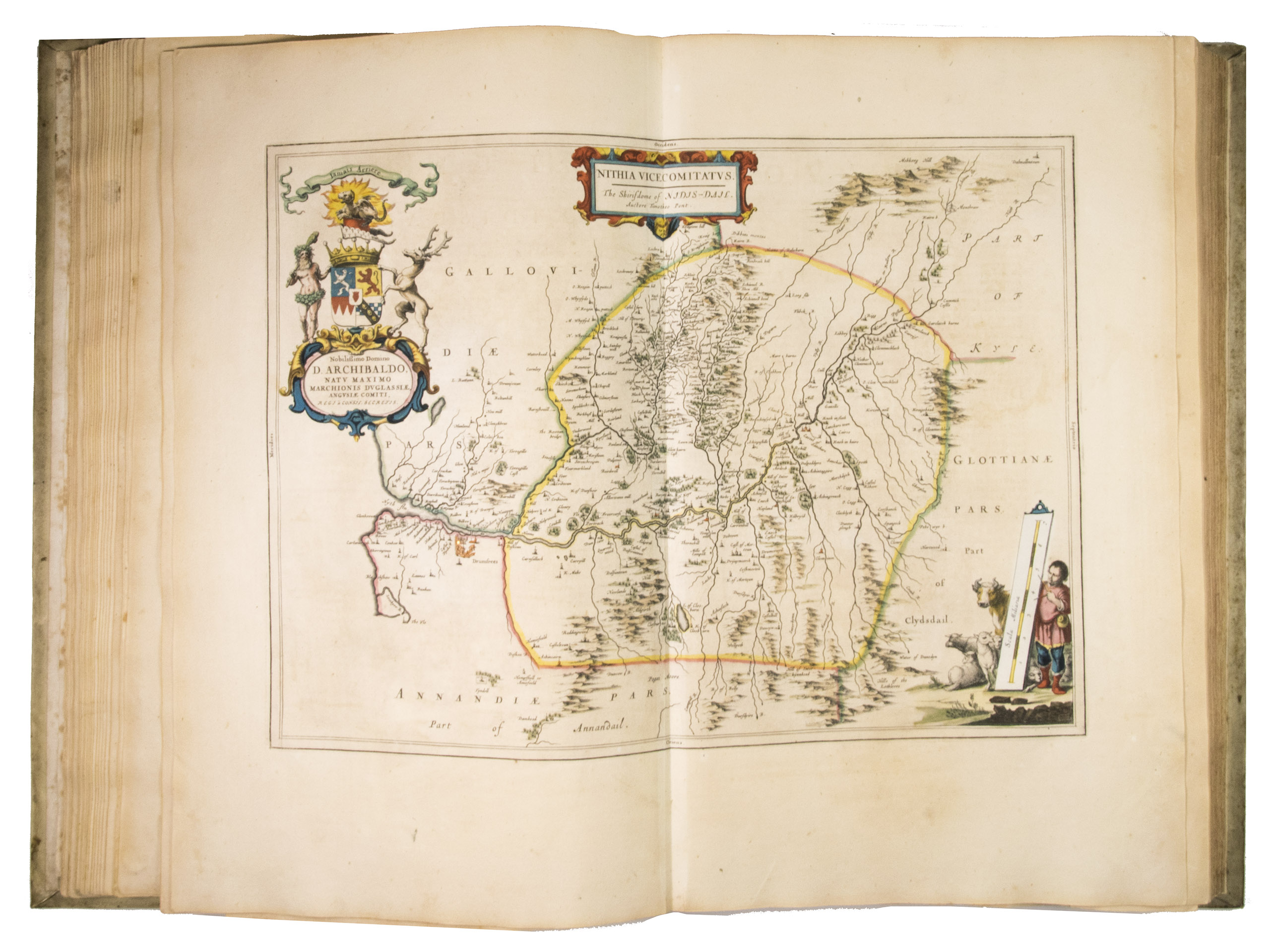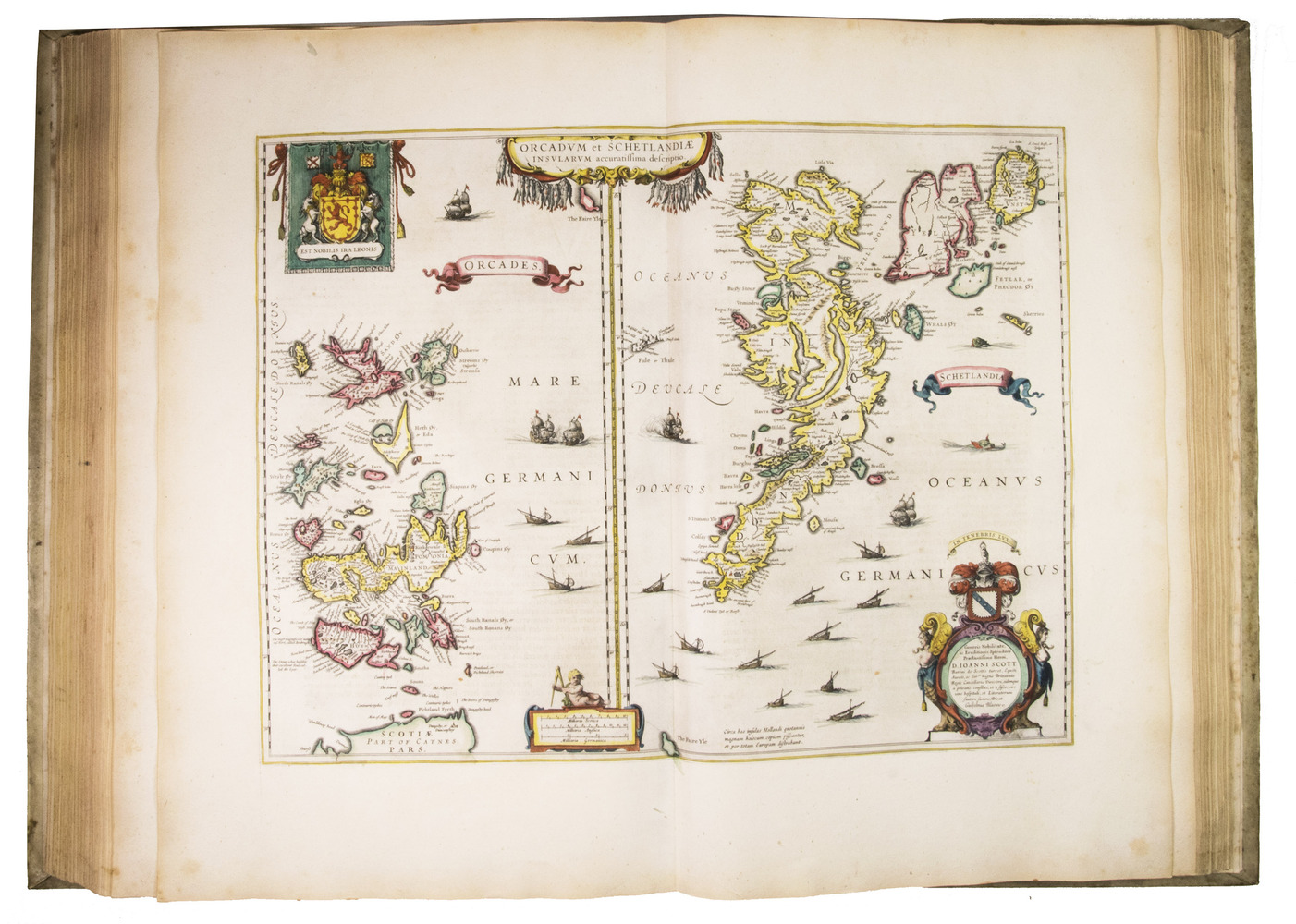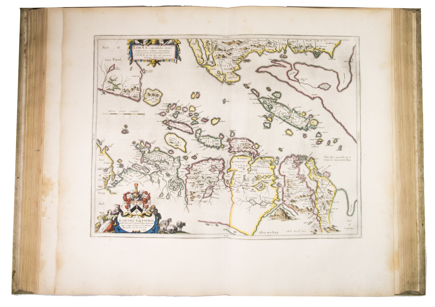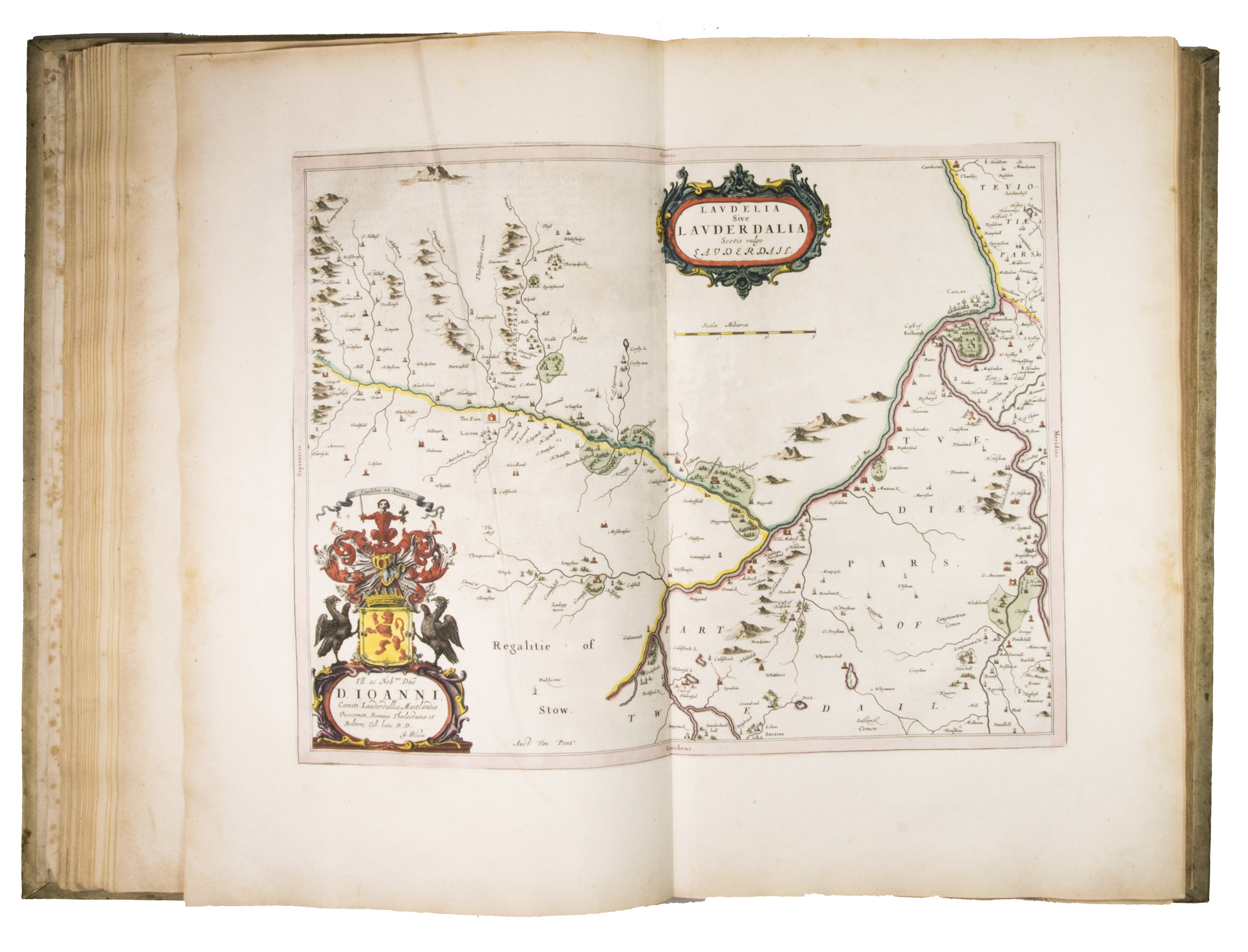 First edition, in Dutch, of the first national atlas of Scotland, far more accurate than any previously published, complete with the atlas of Ireland, the whole beautifully executed by Blaeu's printing office and with the engraved title-page, maps, and the cartouches, pictorial scenes and coats of arms in the maps coloured by a contemporary hand and highlighted with gold. The maps are coloured in outline, but with cities, forests, mountain ranges, etc. also coloured. It was published both separately and (as in the present copy) as the 5th volume of the 9-volume Dutch edition of Blaeu's Atlas major or Grooten atlas.