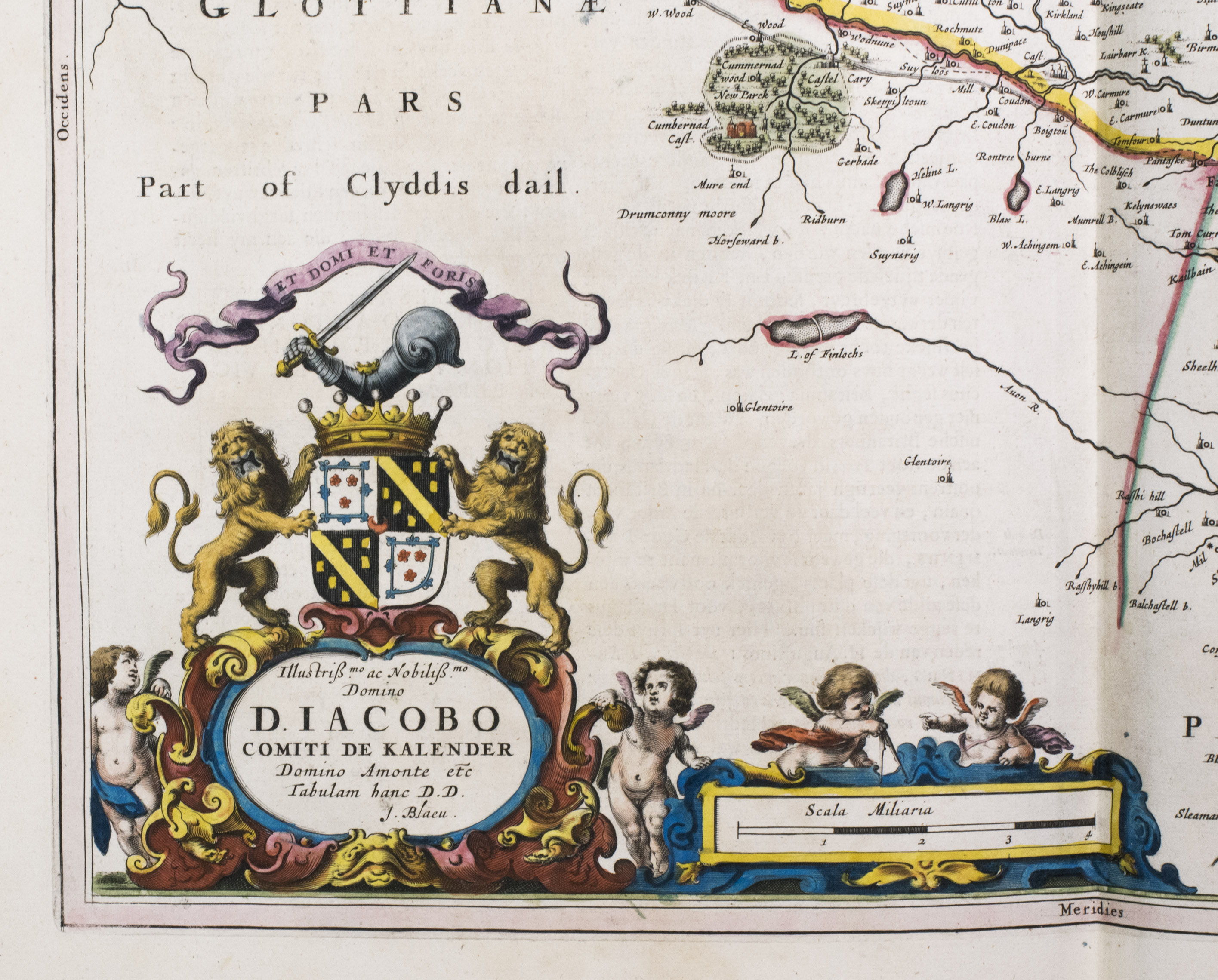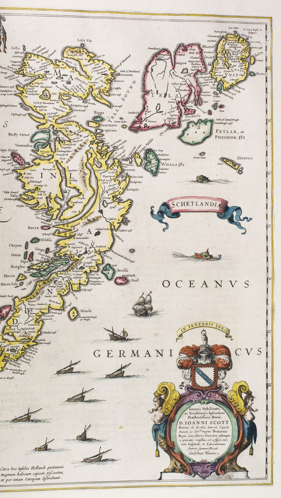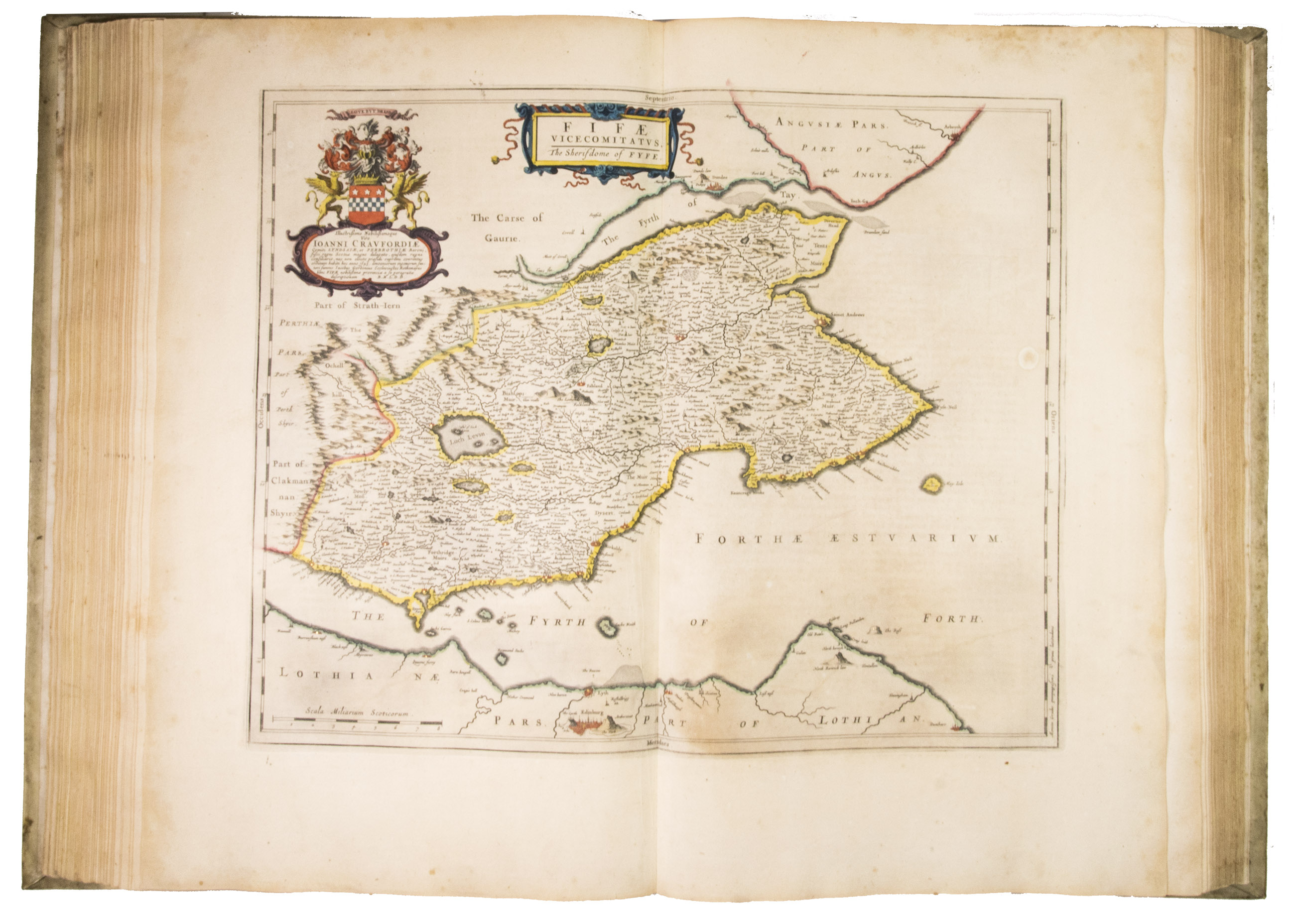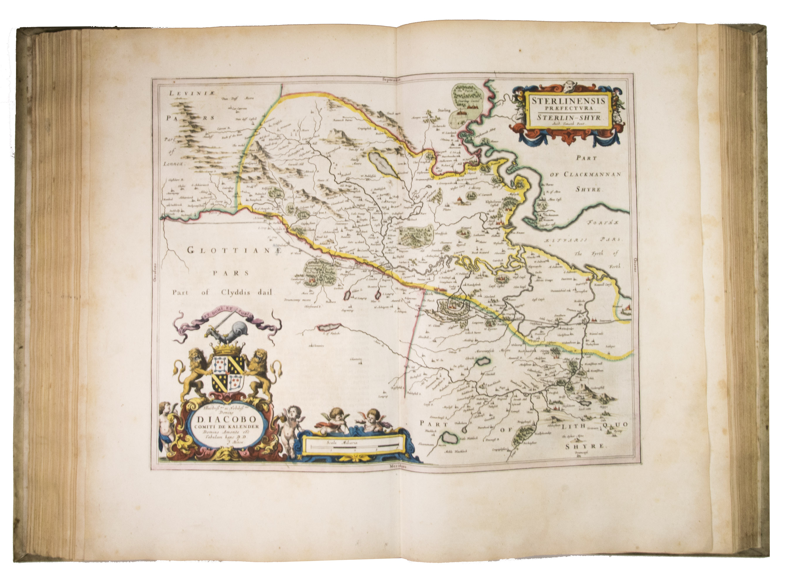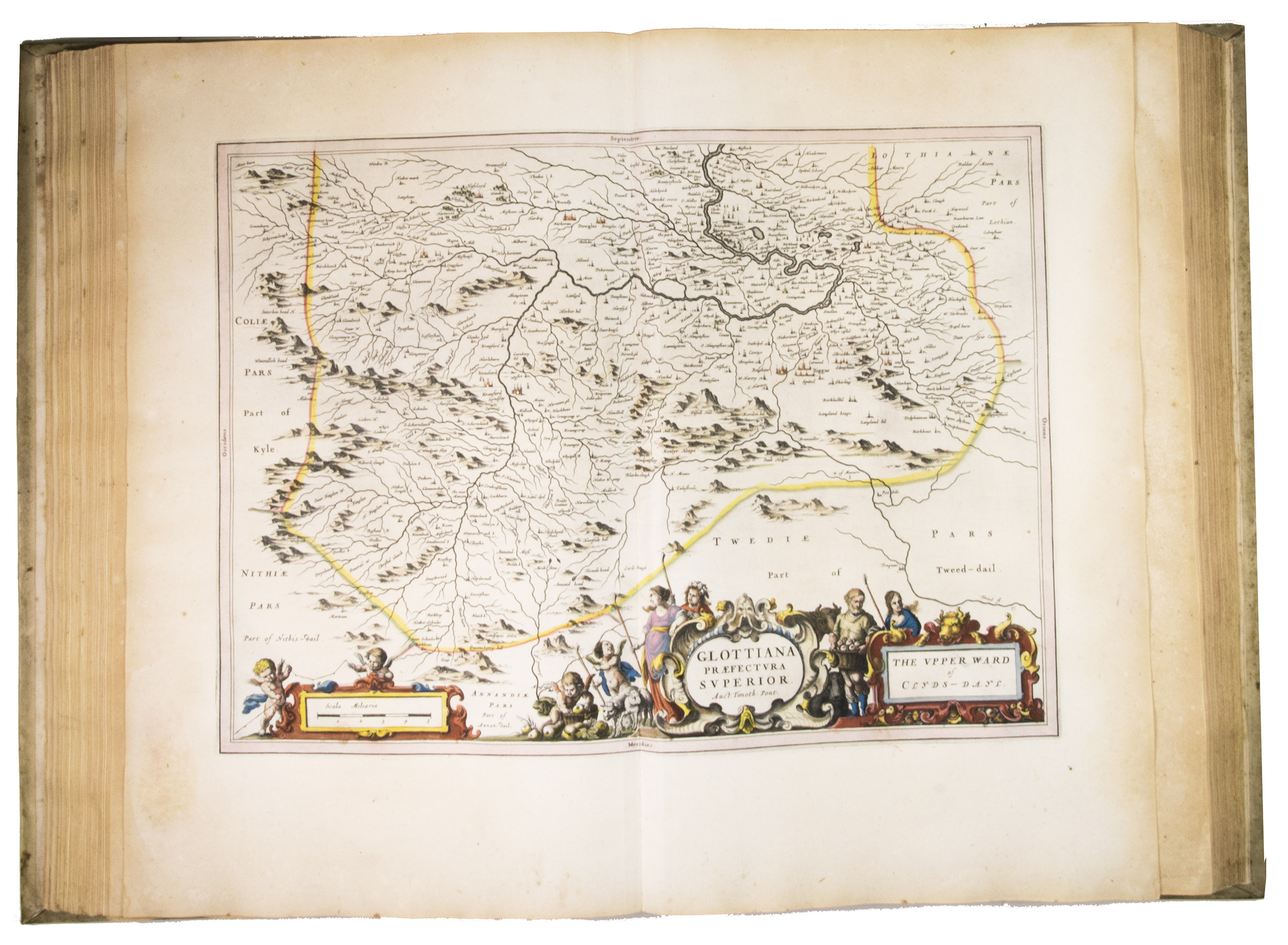 First edition, in Dutch, of the first national atlas of Scotland, far more accurate than any previously published, complete with the atlas of Ireland, the whole beautifully executed by Blaeu's printing office and with the engraved title-page, maps, and the cartouches, pictorial scenes and coats of arms in the maps coloured by a contemporary hand and highlighted with gold. The maps are coloured in outline, but with cities, forests, mountain ranges, etc. also coloured. It was published both separately and (as in the present copy) as the 5th volume of the 9-volume Dutch edition of Blaeu's Atlas major or Grooten atlas.
