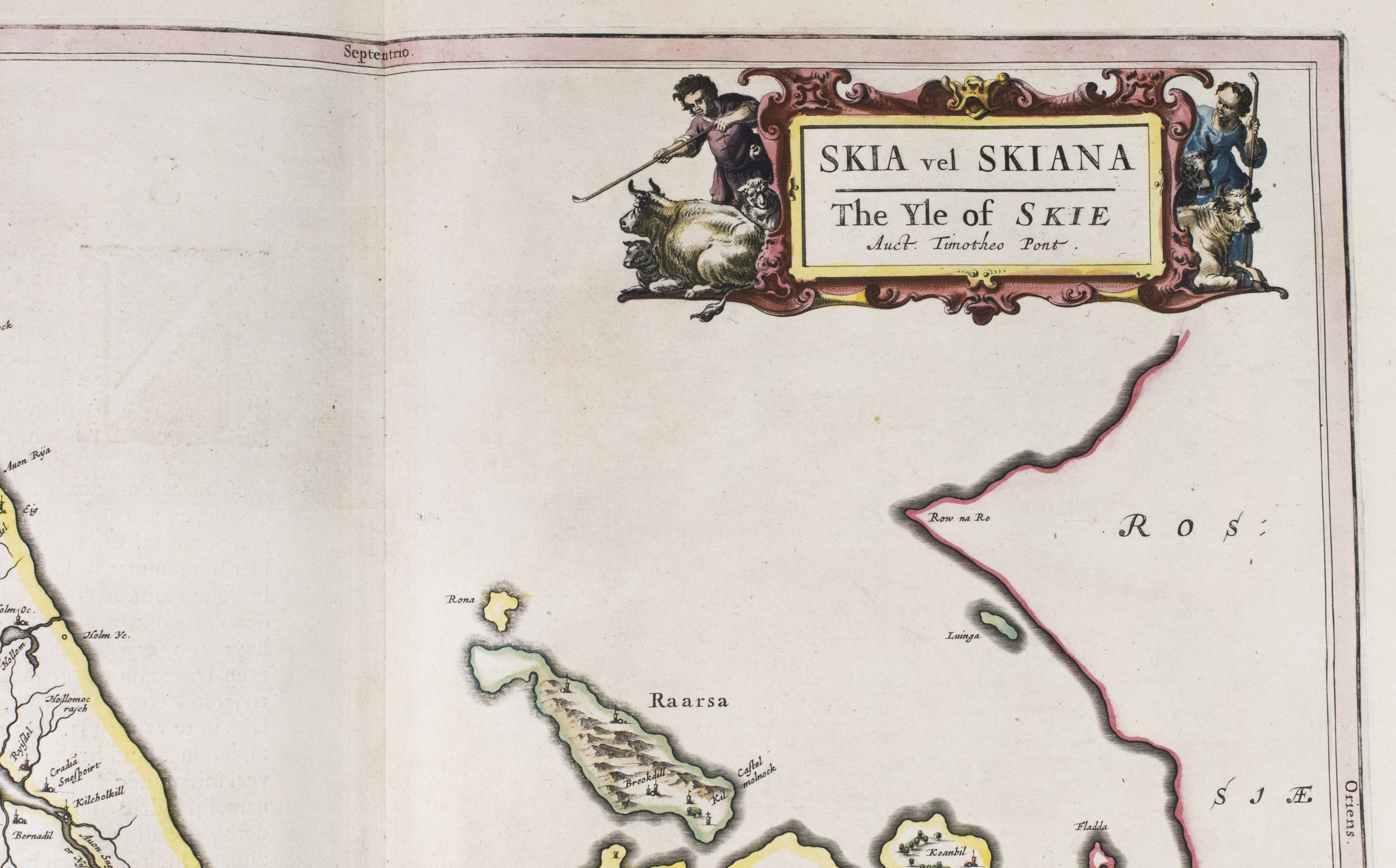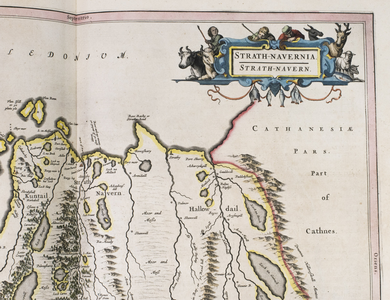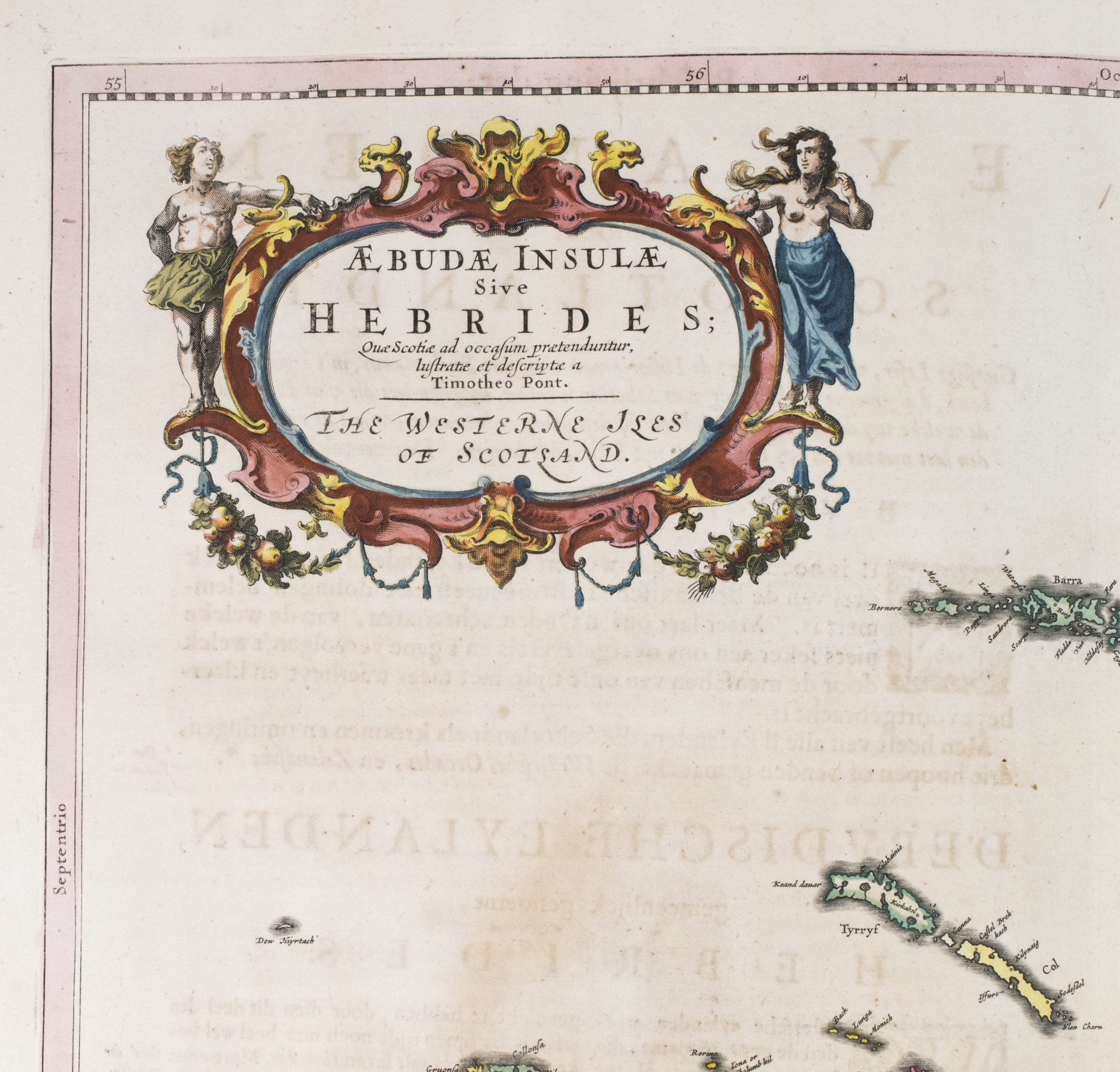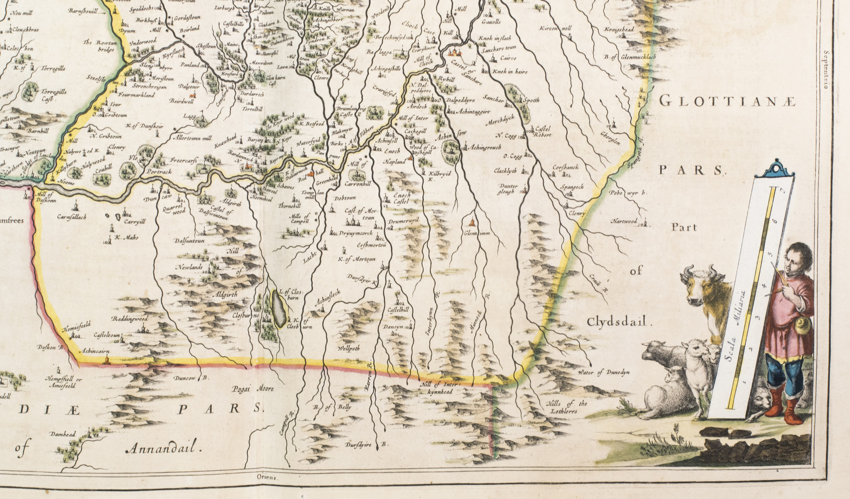 First edition, in Dutch, of the first national atlas of Scotland, far more accurate than any previously published, complete with the atlas of Ireland, the whole beautifully executed by Blaeu's printing office and with the engraved title-page, maps, and the cartouches, pictorial scenes and coats of arms in the maps coloured by a contemporary hand and highlighted with gold. The maps are coloured in outline, but with cities, forests, mountain ranges, etc. also coloured. It was published both separately and (as in the present copy) as the 5th volume of the 9-volume Dutch edition of Blaeu's Atlas major or Grooten atlas.