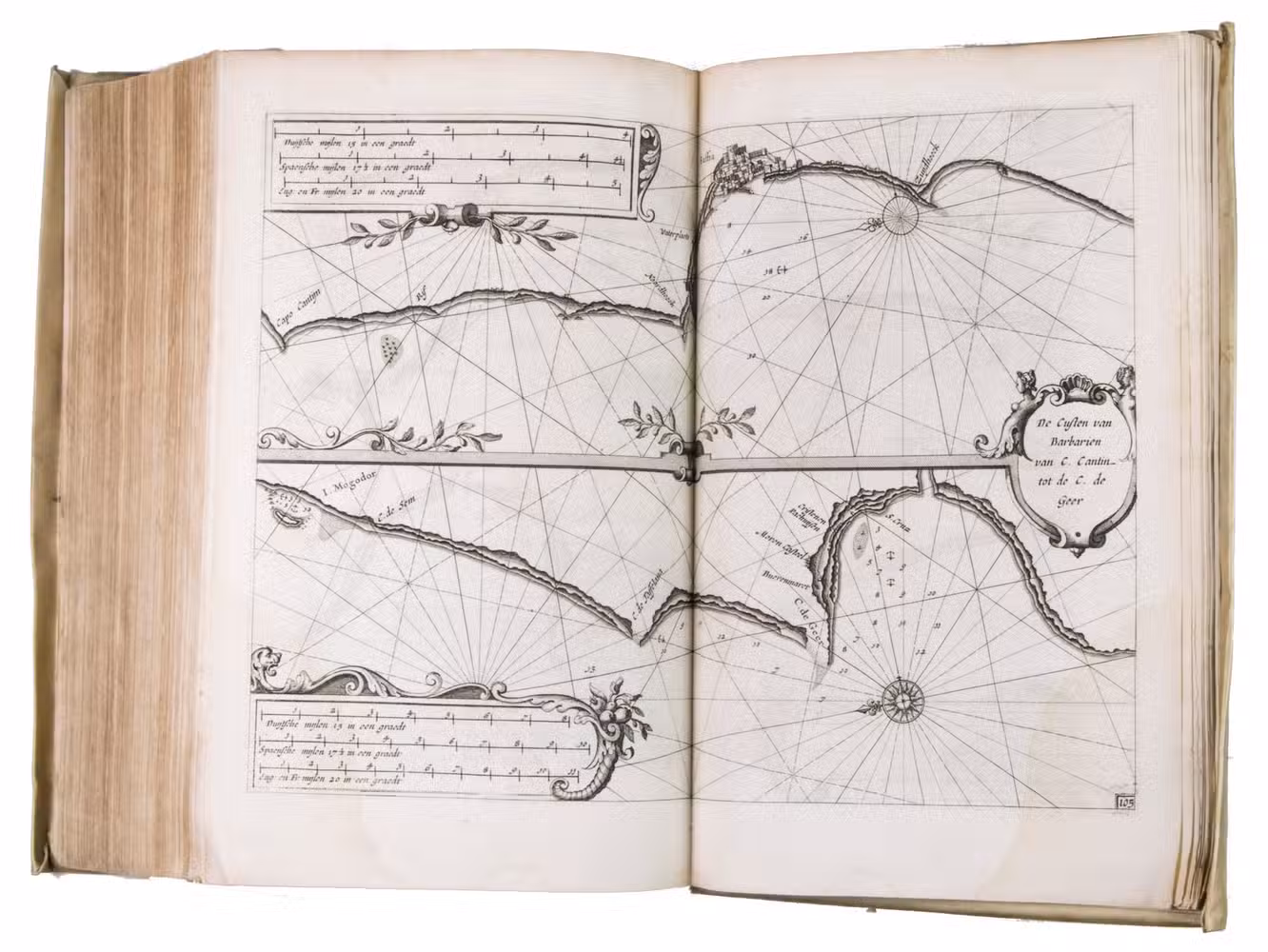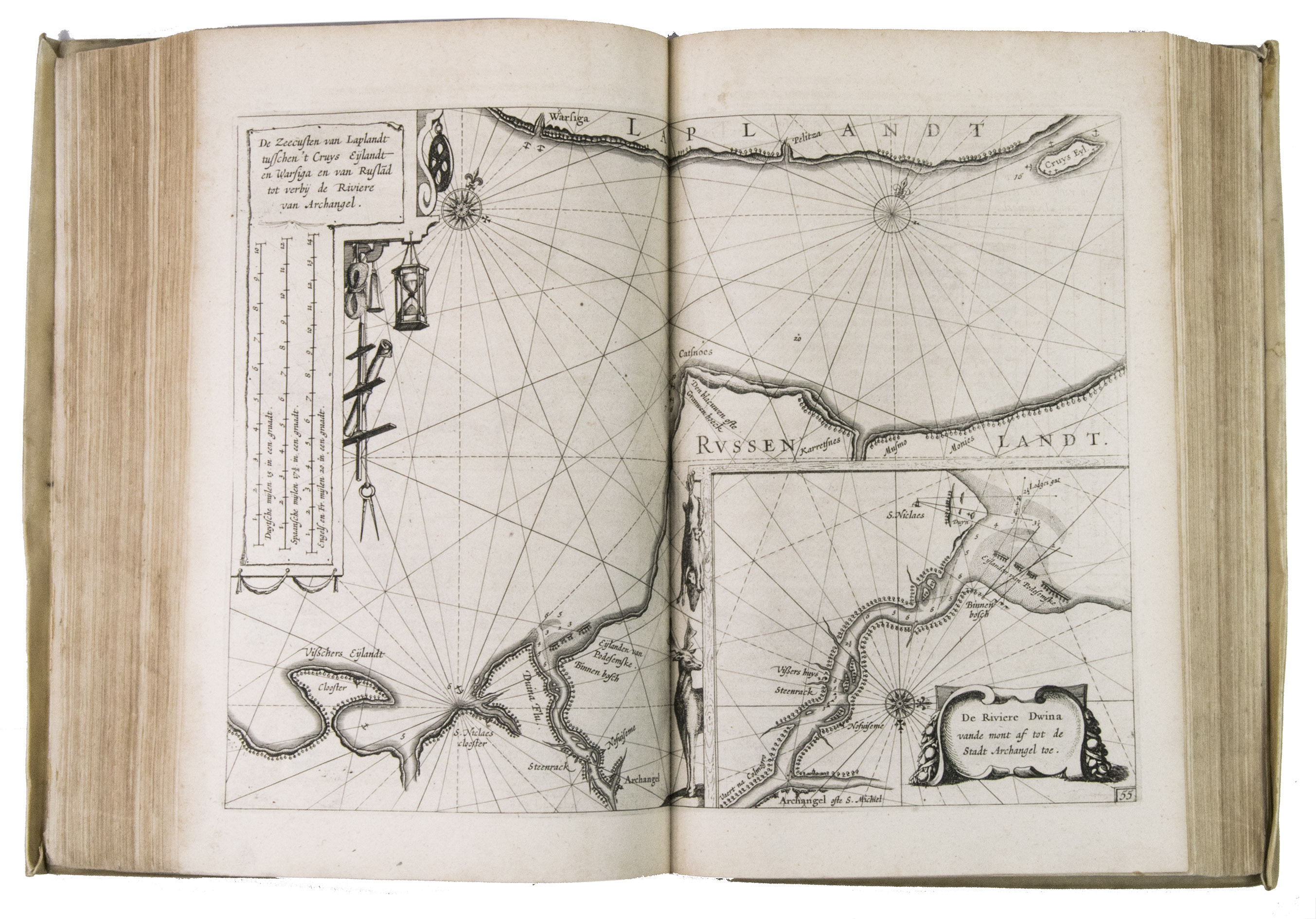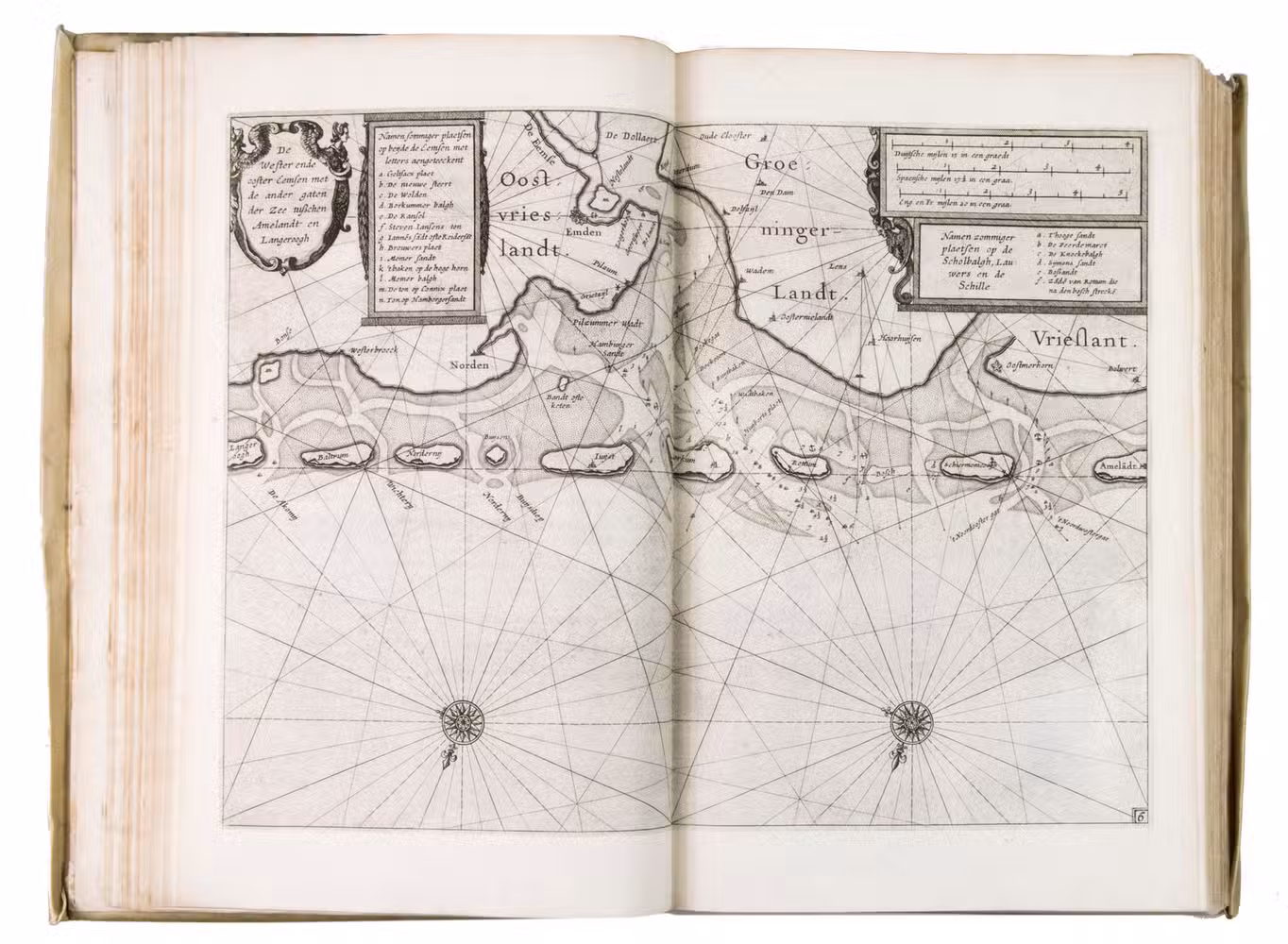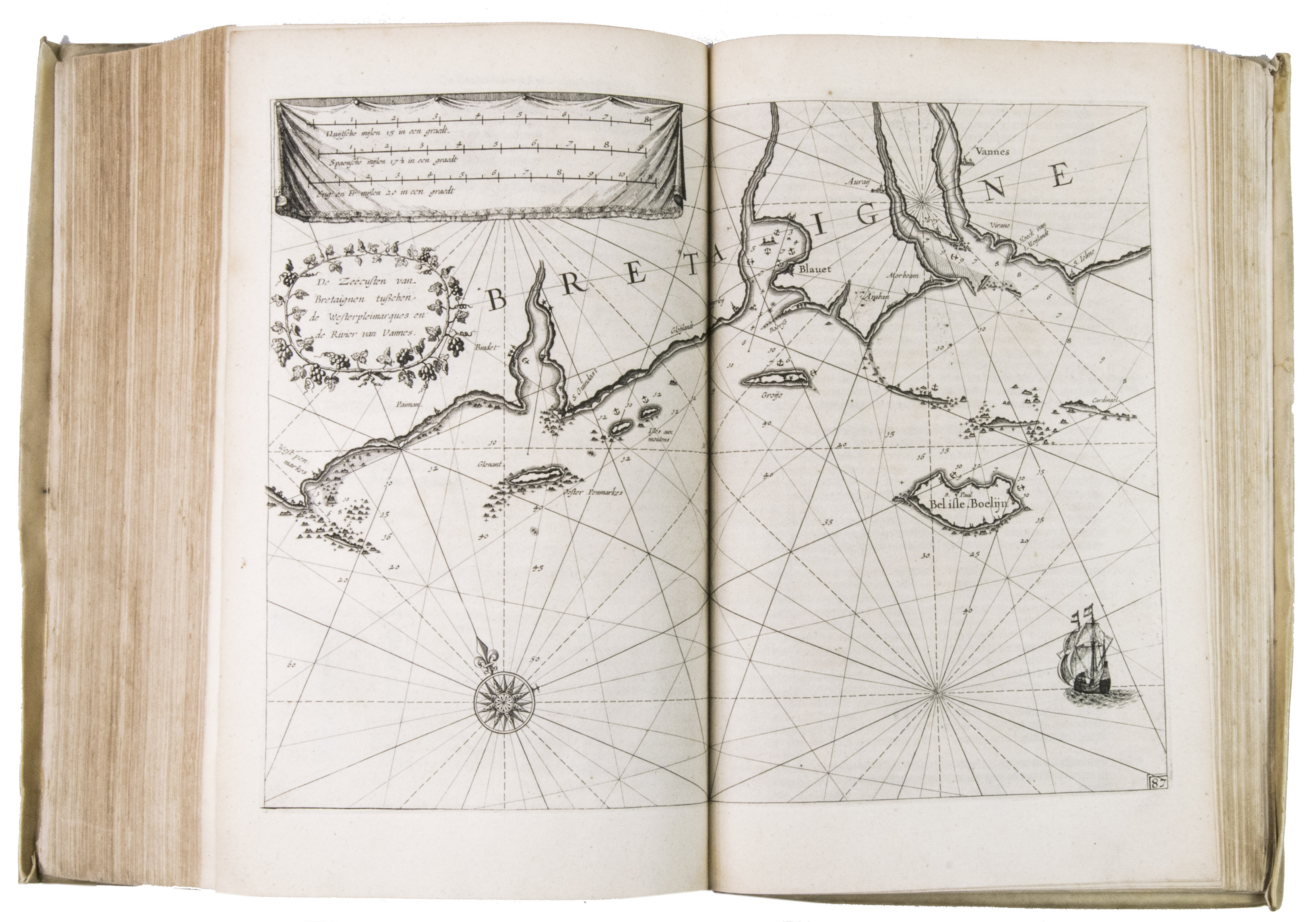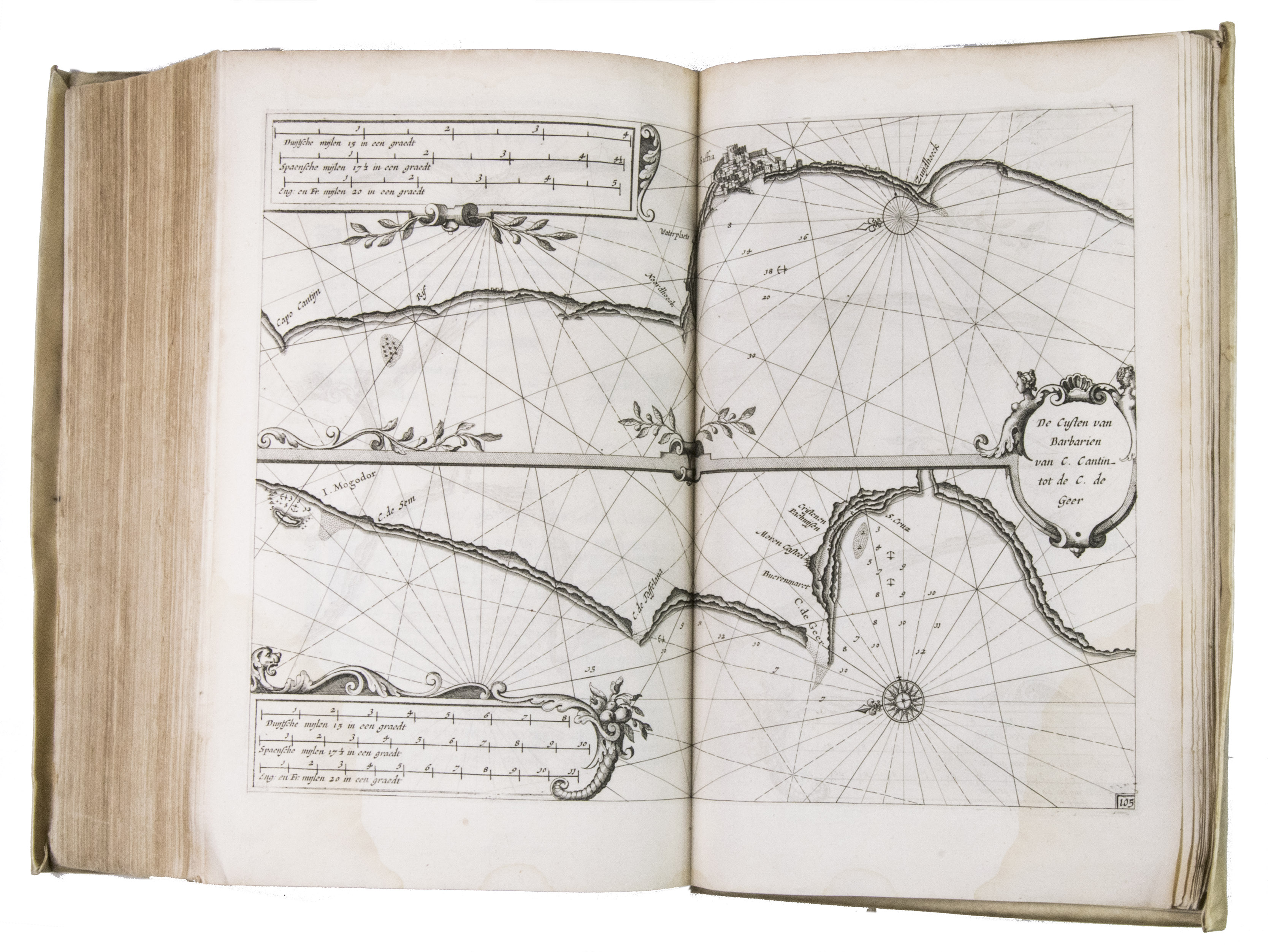 The Zeespiegel consists of three parts. It covers much the same coastal regions as in Het Licht der Zee-vaert, but does so in much greater detail and with larger scale charts, showing the European coast, all the way from Nova Zembla in the north to Malaga in the south, as well as the coasts of Africa from the Barbary (West) coast to the Canary Islands. The coasts of the Mediterranean were included in a fourth part, which appeared in 1638.