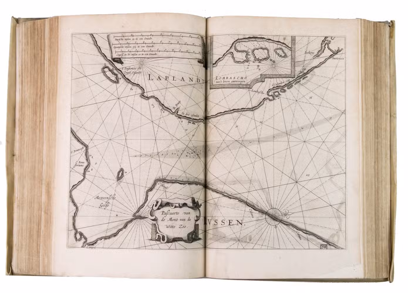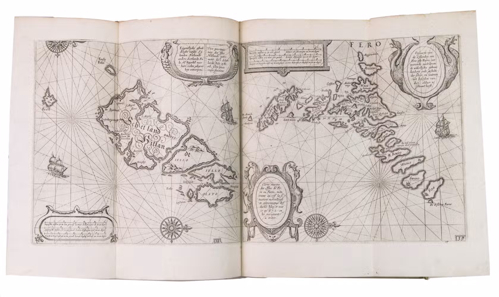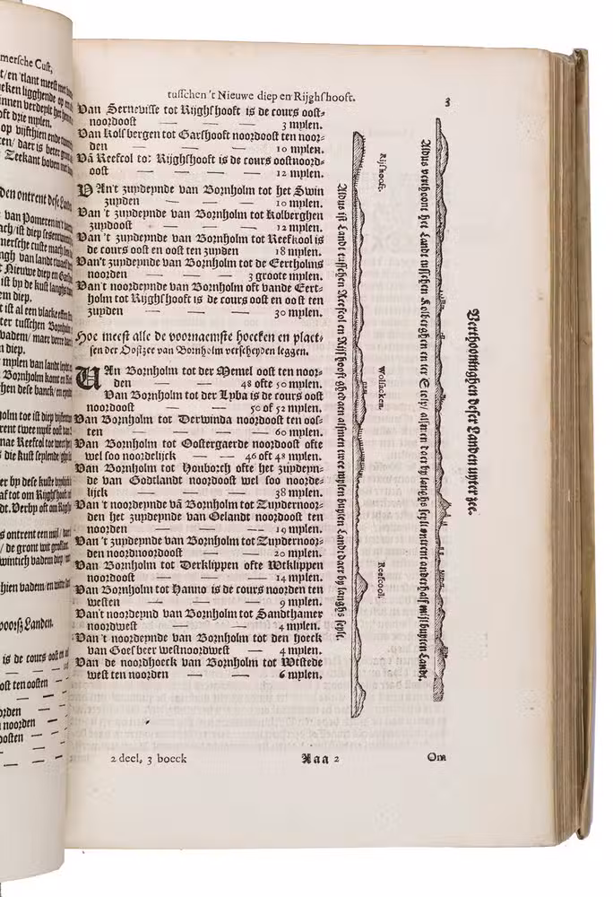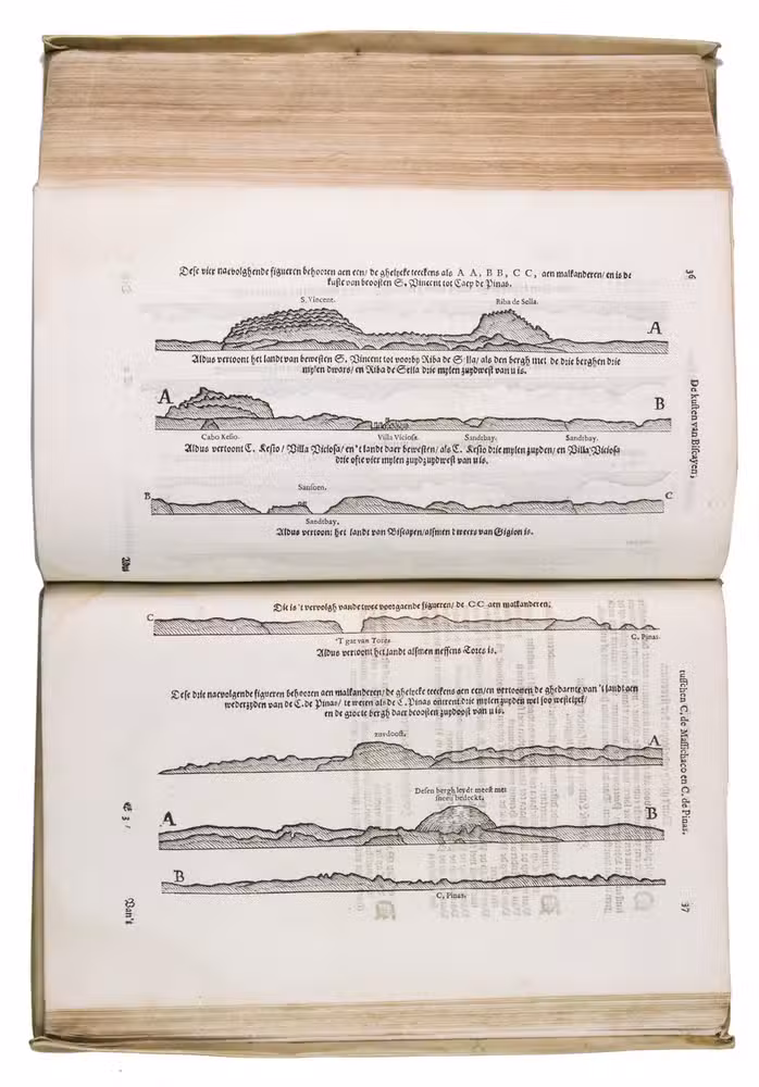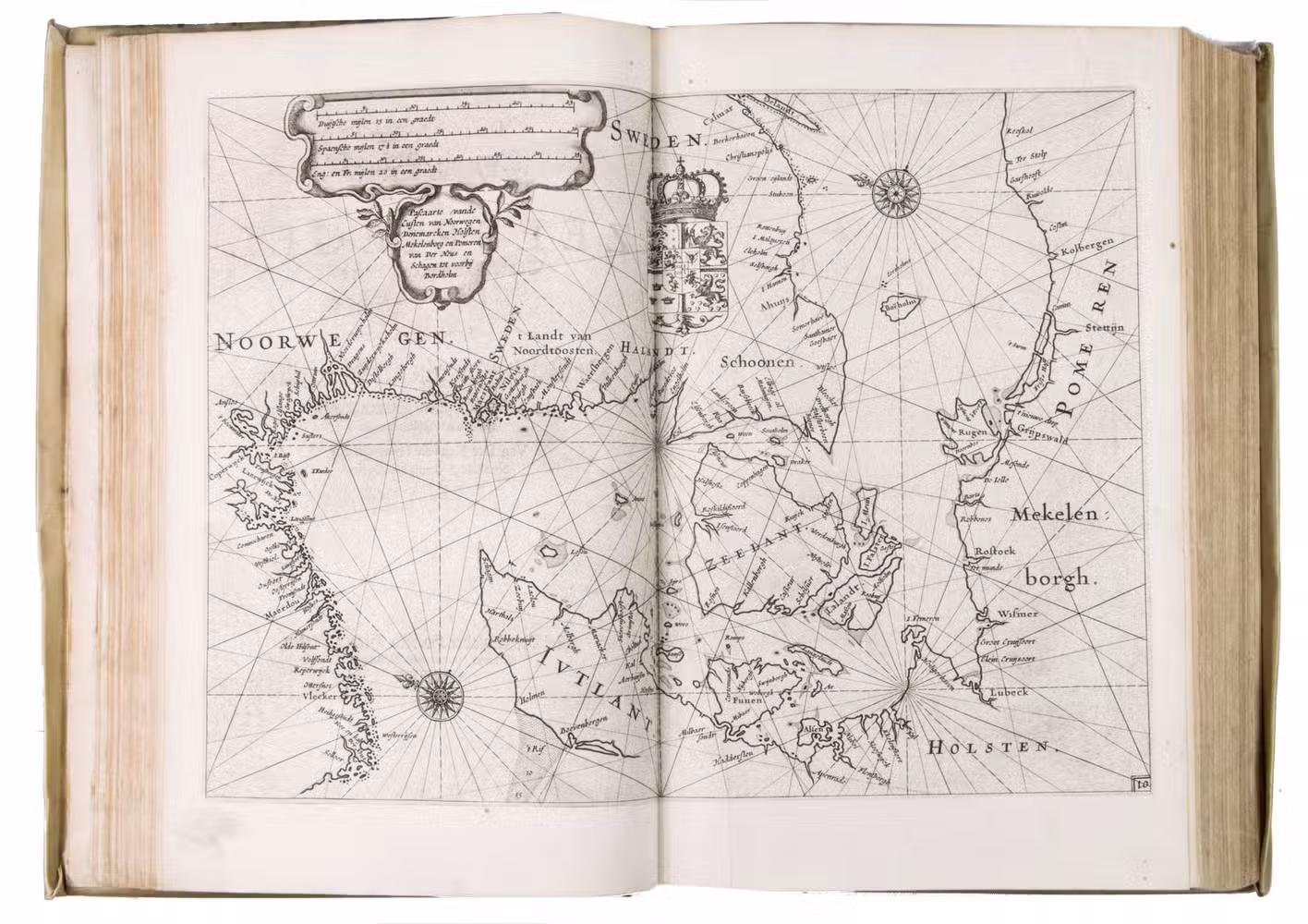 The Zeespiegel consists of three parts. It covers much the same coastal regions as in Het Licht der Zee-vaert, but does so in much greater detail and with larger scale charts, showing the European coast, all the way from Nova Zembla in the north to Malaga in the south, as well as the coasts of Africa from the Barbary (West) coast to the Canary Islands. The coasts of the Mediterranean were included in a fourth part, which appeared in 1638.