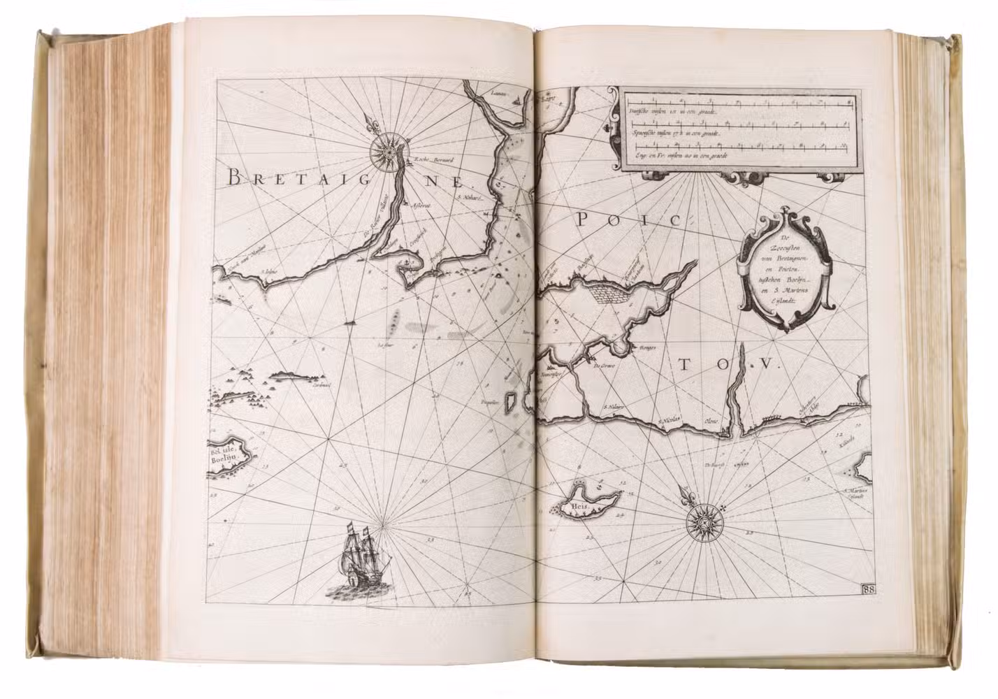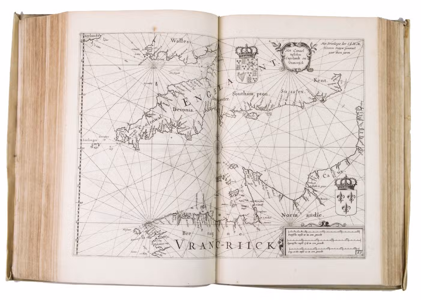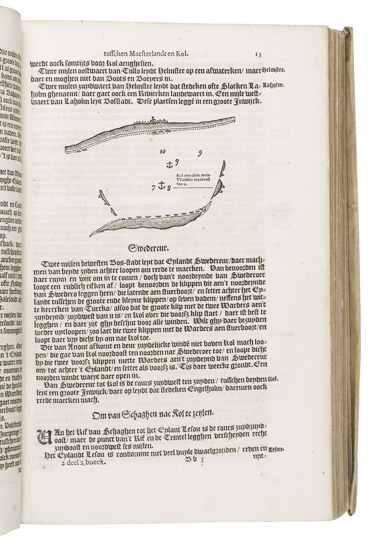 Second edition of Willem Blaeu's famous but extremely rare pilot guide, of which only a handful of copies are still known to exist. It was one of the largest pilot guides of the time, containing almost thrice as many charts as another famous example of the time, Blaeu's own Het Licht der Zee-vaert (1608). Although the work proved hugely successful because of this large update and was republished many times, it was also actively used at sea for navigation, which accounts for its extreme rarity today. Only a few copies of each edition are currently known. For the present edition, we have only been able to trace five other copies, of which four in institutions, and just one in sales records.