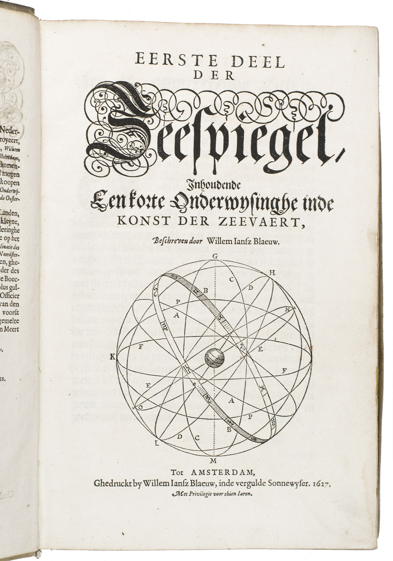 Amsterdam, Willem Jansz. Blaeu, 1627. 3 parts in 1 volume, parts 2 and 3 consist of 6 books each. Folio. With 108 numbered engraved charts, 2 half-page engraved charts, 2 volvelles, a woodcut vignette on the divisional title page of each part, and numerous woodcut illustrations in the text. Contemporary overlapping vellum. The work is preserved in a gold-tooled half red morocco clamshell box, with two green morocco title labels, lettered in gold, red buckram sides, and a green felt lining. [16], 64; 39, [1], 43, [1], 48, 32, 28, 24; 32, 52, 46, 43, [1], 40, 23, [1 blank] pp.