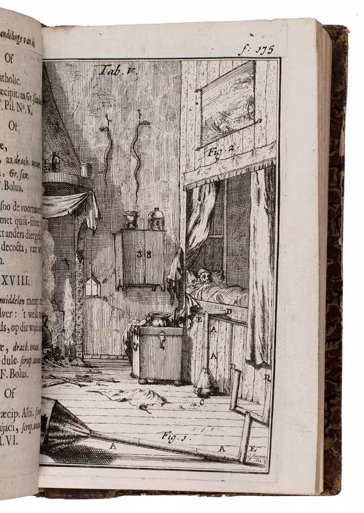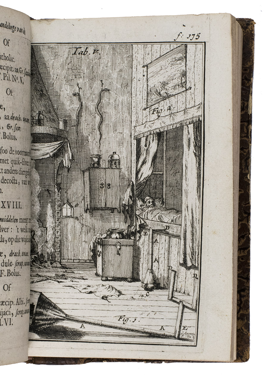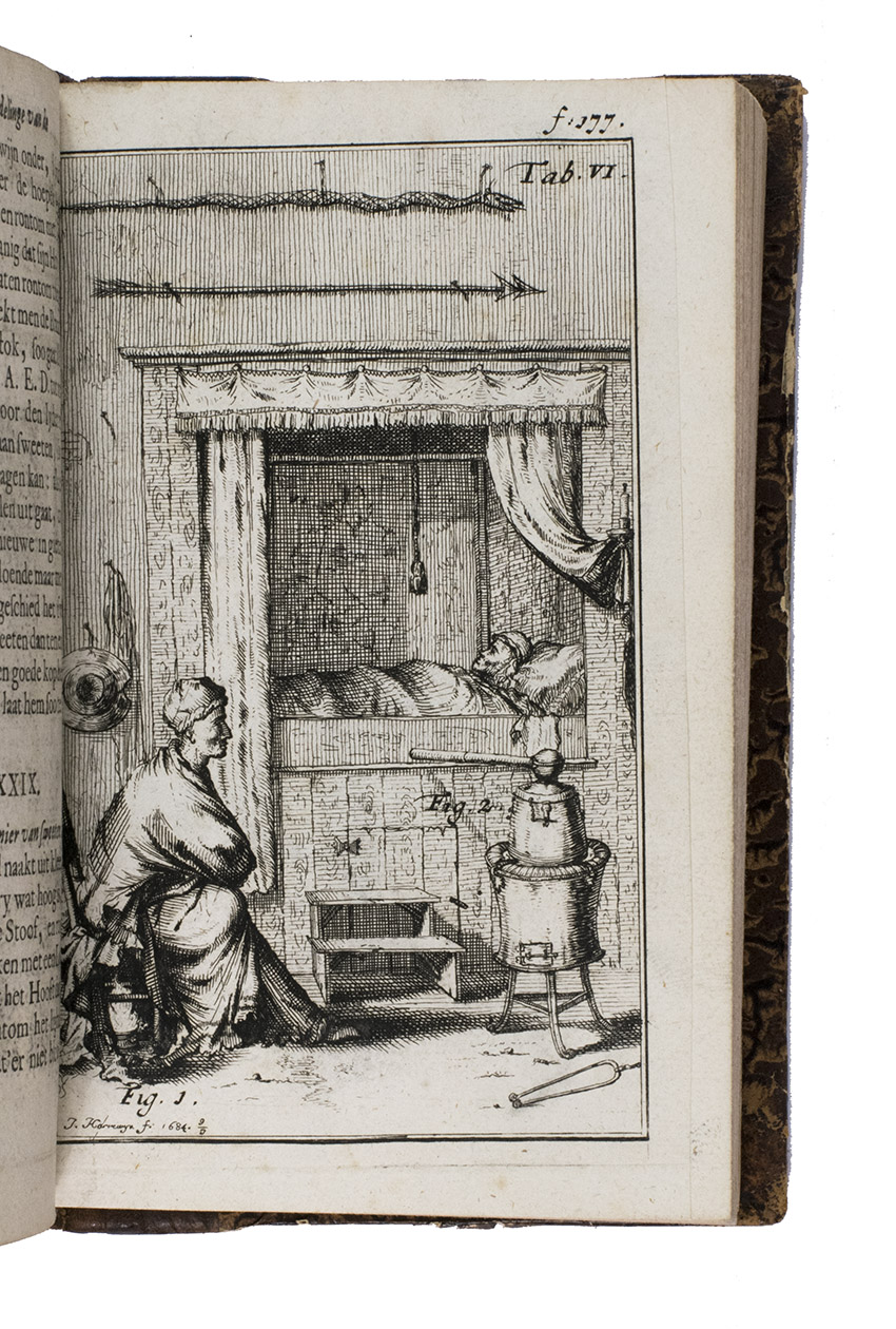 With the Jugenstil book plate of Dr. Ad. Stordeur, Bruges (Belgium), dated 1910; and a small owners label ("GOM" monogram) partly overlapping it. Very slightly browned but still in good condition. Bibl. Med. Neerl. I, 221; De Vries, Populaire prozaschrijvers 470; STCN (5 copies); Wellcome Library II, 177; cf. Bibl. Walleriana 1110-1111 (German eds.); Scheepers I, 562 (1696 ed.).