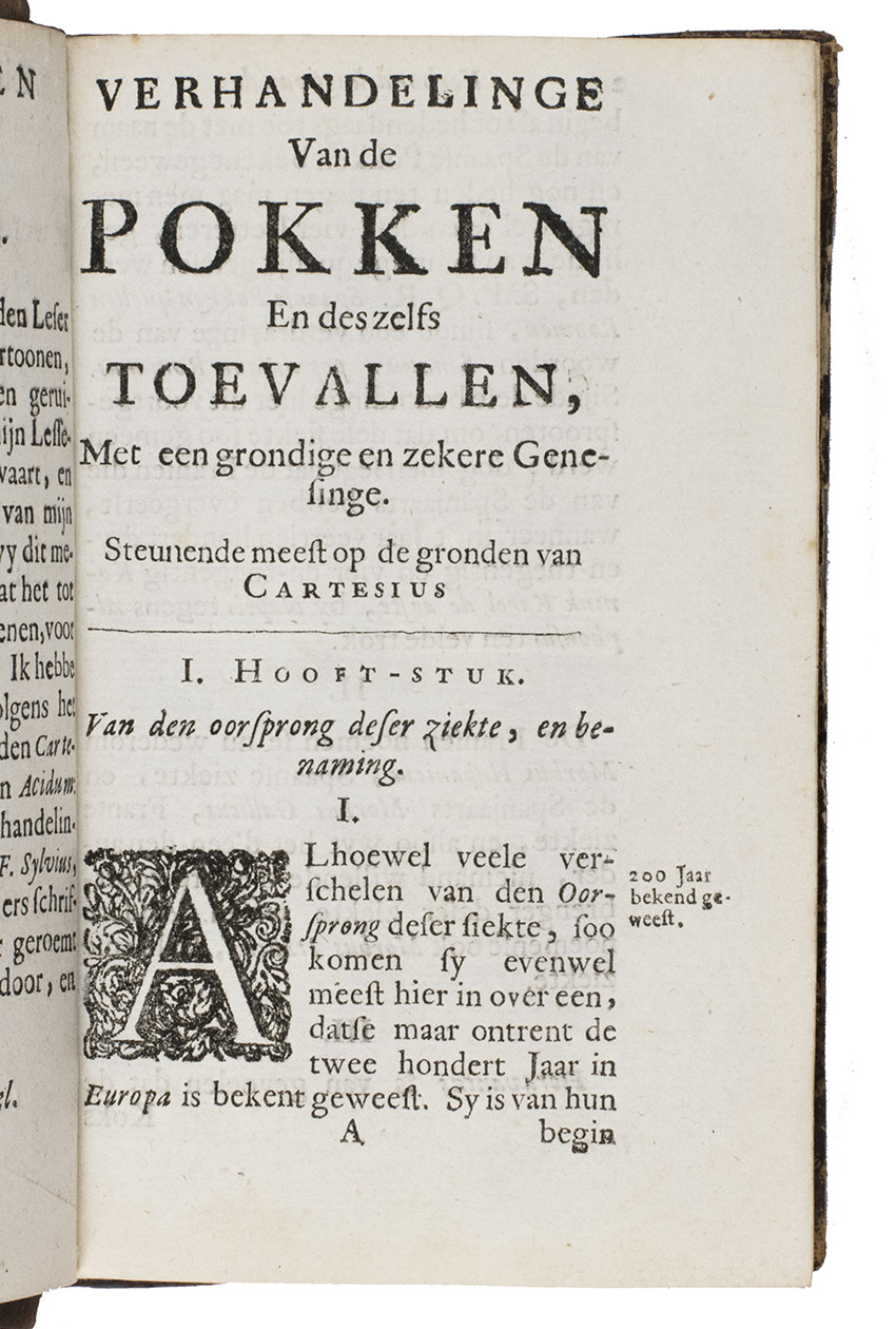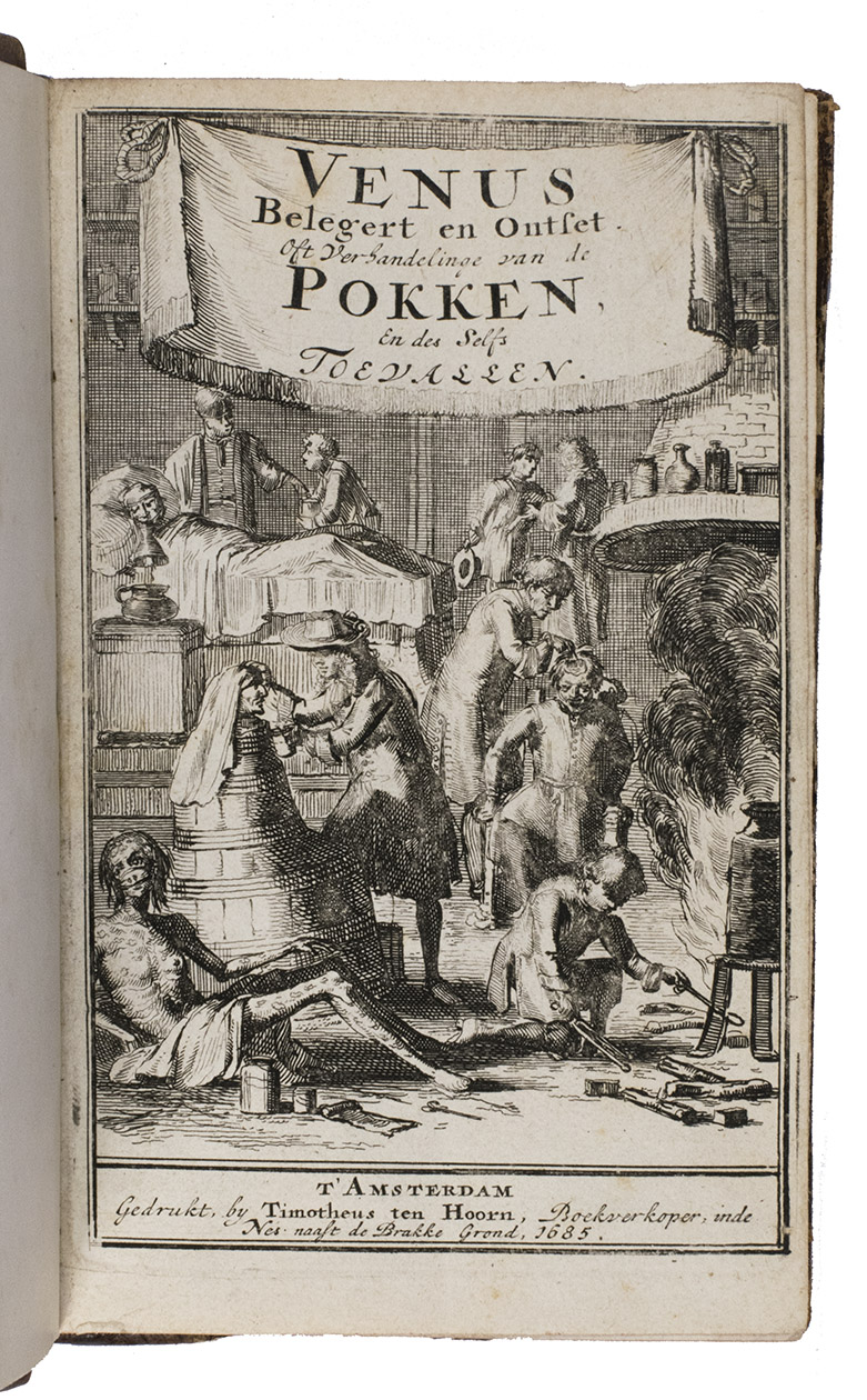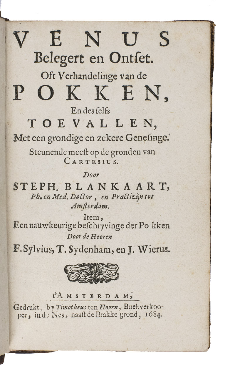 First edition of a very popular book on smallpox by Steven Blanckaart (1650-1704), son of a leading Dutch physician and professor, who trained as a pharmacologist, studied medicine at Franeker and promoted recent ideas in medicine. He was the first to introduce Cartesianism into medical science. All of the plates, excellent and interesting work by the artist-engraver Jacob Harrewijn, illustrate Blanckaarts own work, but following it he added three other treatises on smallpox, by Franciscus de le Boë Sylvius, Johannes Wier and Blankaarts contemporary, the English physician Thomas Sydenham, this last written in the form of a letter to his London colleague Henri Paman. Blankaarts book, still accompanied by the contributions by others, went through several editions in the original Dutch and in English and German translations.