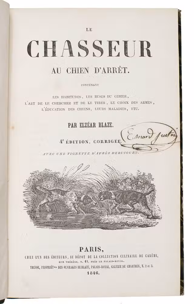 Le chasseur au chien d'arrêt. Contenant les habitudes, les ruses du gibier, l'art de le chercher et de le tirer, le choix des armes, l'éducation des chiens, leurs maladies, etc.Paris, chez l'un des éditeurs, au dépot de la collection culinaire de Carême, 1846. With an illustration of two dogs by A. Guyot on the title-page and a full-page plate "Contemplation" signed Pauquet.