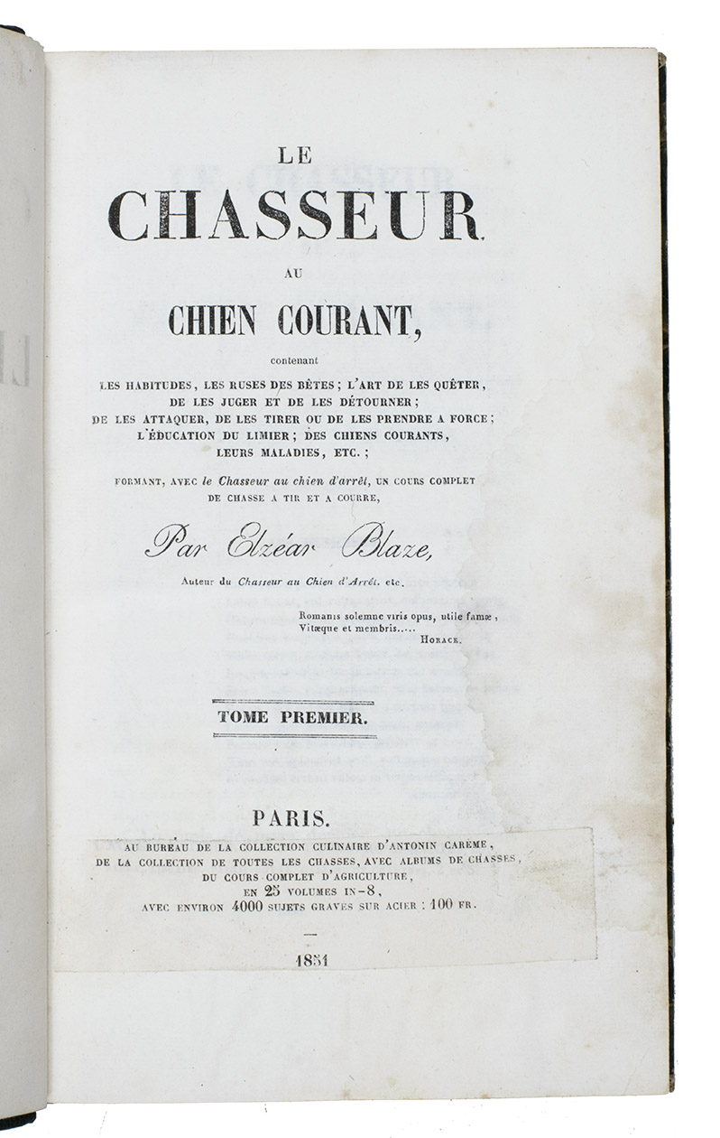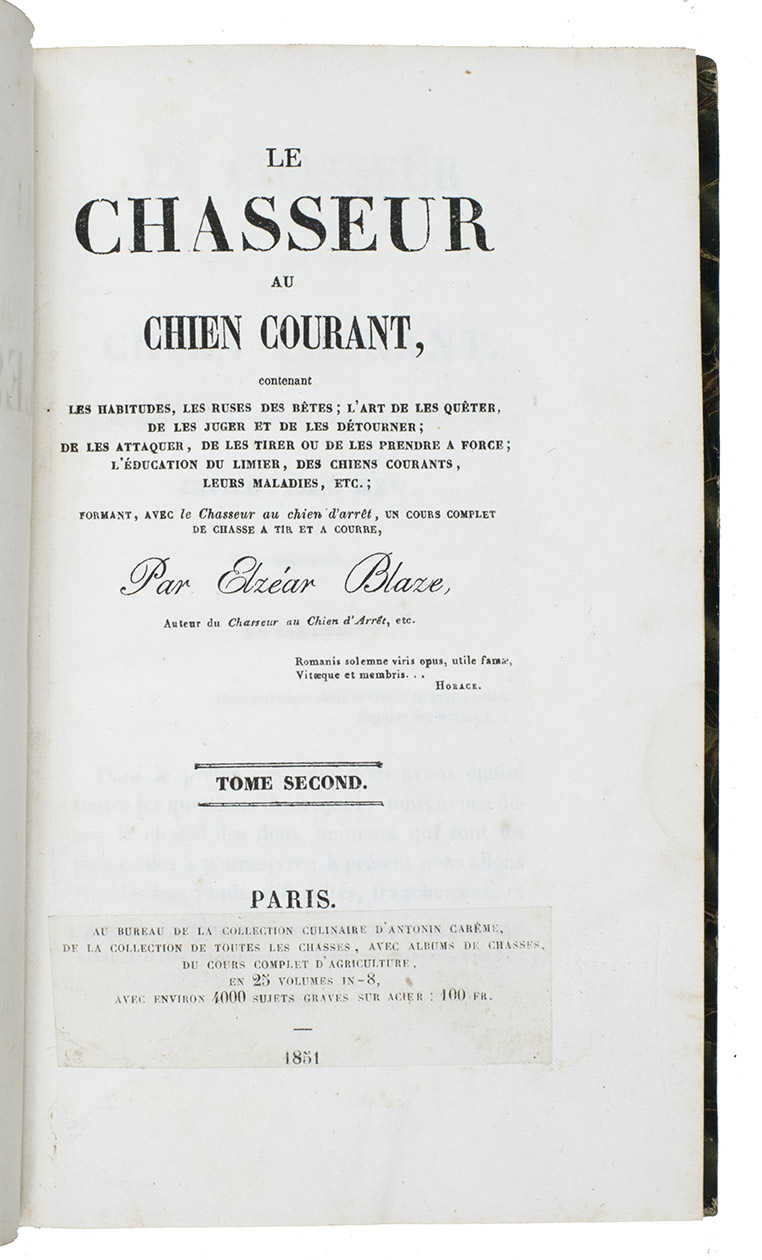(2) BLAZE, Elzéar. Le chasseur au chien courant, contenant les habitudes, les ruses des bêtes; l'art de les quêter, de les juger et de les détourner; de les attaquer, de les tirer ou de les prendre a force; l'éducation du limier; des chiens courants, leurs maladies, etc. Paris, Bernard et Cie for the dépot de librarie, 1851.