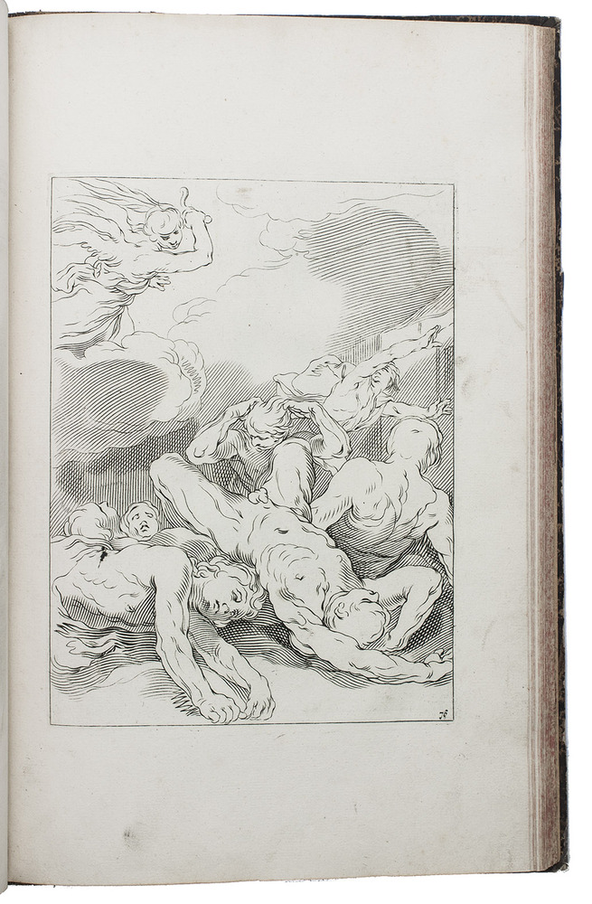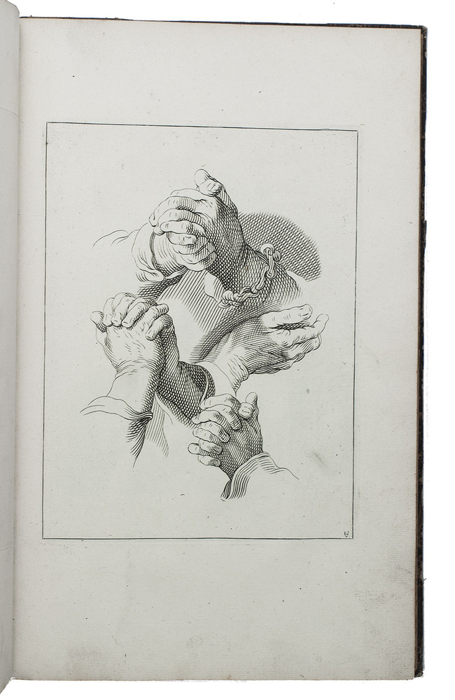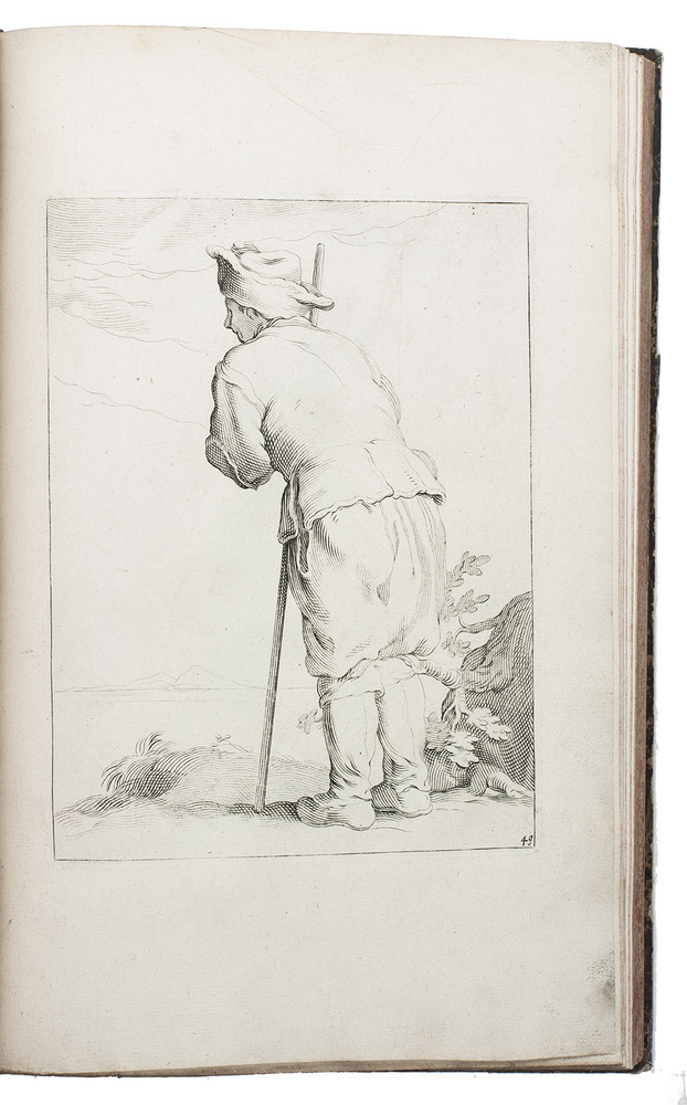 Amsterdam, Reinier & Joachim II Ottens, [ca. 1730]. Folio. With engraved frontispiece self-portrait of Bloemaert engraved by Joachim Ottens, here serving as no. [1] of 140 engraved plates with drawn models of parts of the human body, and human figures and characters in various postures, movements and scenes. Mottled half sheepskin (ca. 1840?). [1] leaf plus plates.
