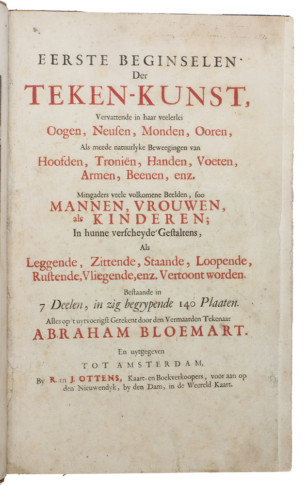 In good condition and with generous margins, with a small tear and minor smudges in the title-page, the first and last leaves slightly browned and a few unobtrusive restorations. A classic Dutch drawing book, providing a storehouse of human forms that influenced many artists for more than a century. WorldCat (1 or 2 copies); cf. Bolten, Method & Practice. Dutch & Flemish drawing books, pp. 51-67; Hollstein II, p. 86, nos. 36-155 (ca. 1650-ca. 1657 F. Bloemaert ed. of parts 1-6).