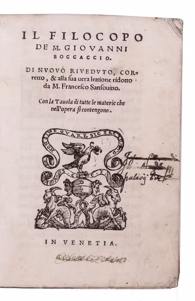 Francesco Sansovino (1521-1583) had produced the first variorum edition of the Decameron in 1546 and then turned his editorial scholarship to Il Filocolo, beginning with Gaetano's text (editions in 1527 and 1538).