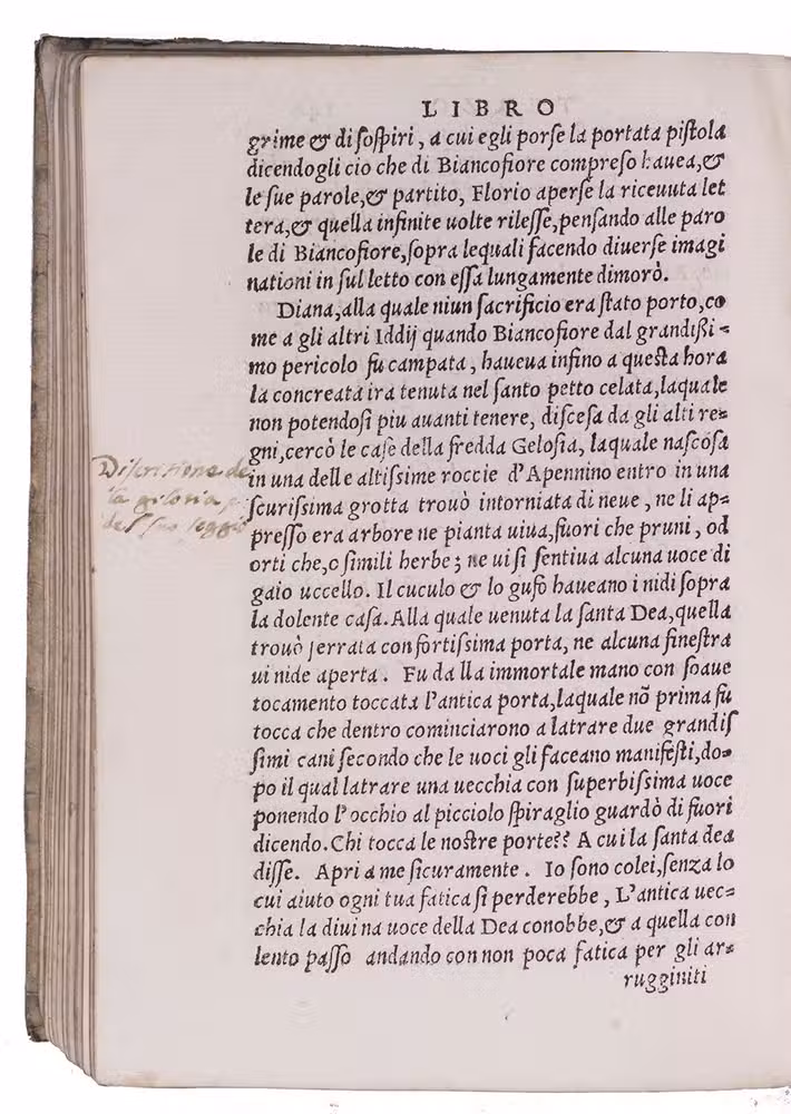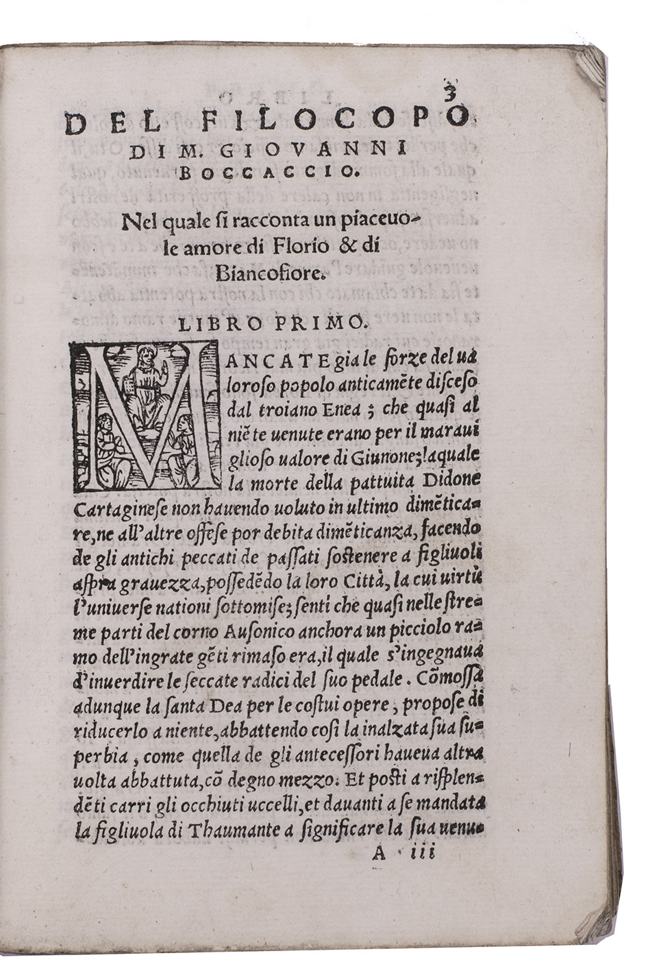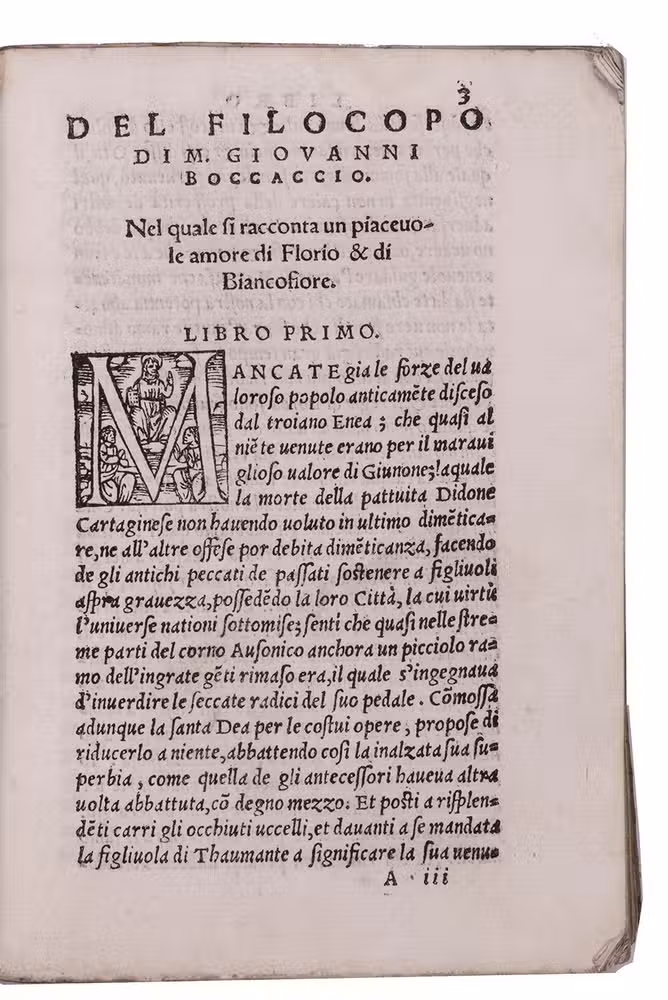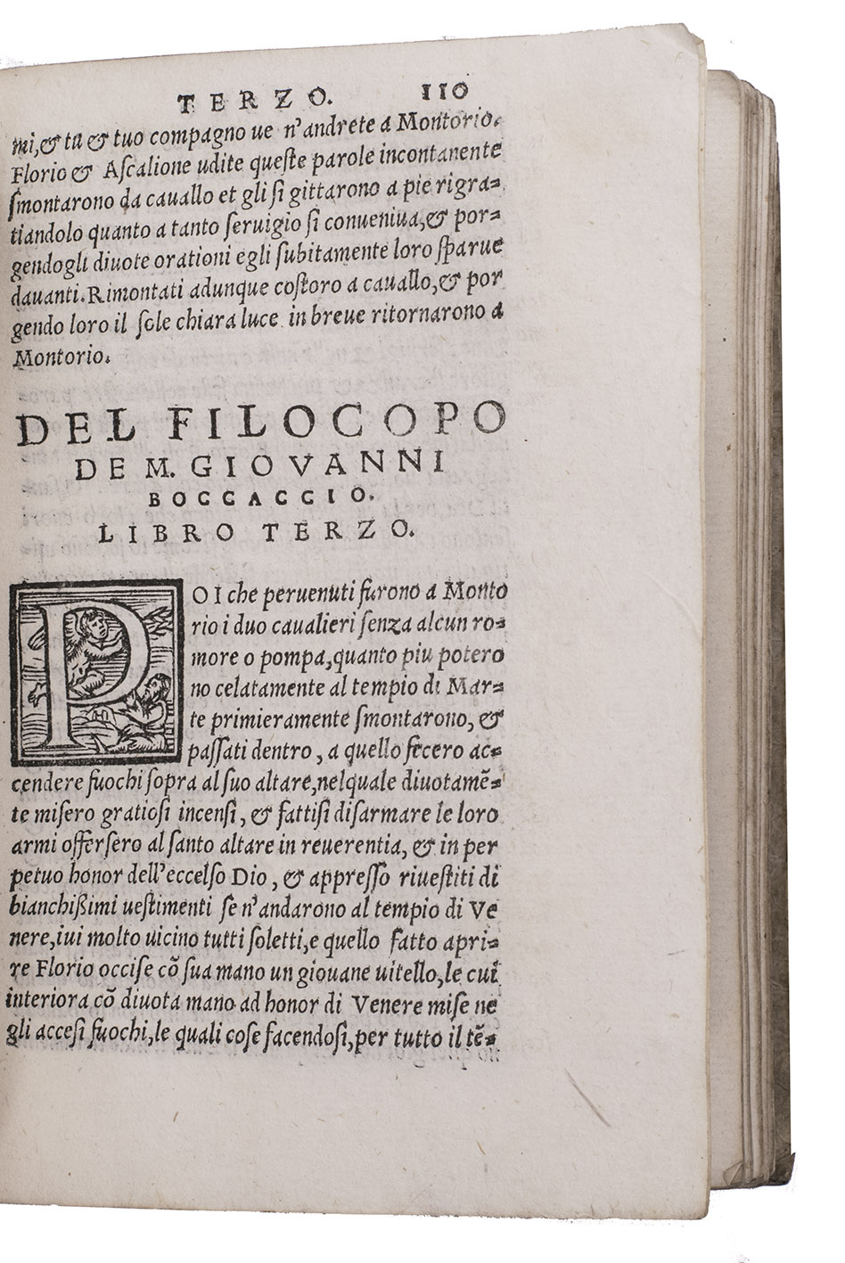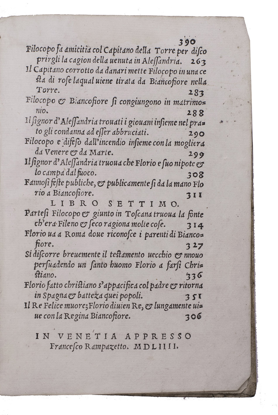Second Sansovino edition of Boccaccio's first important work, Il Filocolo (here Filocopo), a prose romance written ca. 1334-1336, about twenty years before the Decameron. Boccaccio reworked the 12th-century French love story of Floire (Florio), muslim Prince of Andalusia, and Blancheflor (Biancifiore), the orphaned daughter of his mother's Roman Christian lady-in-waiting. They grow up together in the royal household, but when they fall in love his parents try to break up the romance by selling her to merchants who will take her to Alexandria to join a harem. Florio, under the pseudonym Filocopo, rescues and marries her. He converts to Christianity and they return home where he ascends the throne and his people embrace Christianity. Boccaccio introduced many new elements into the story and told it with his usual flare for (often risqué) humour. It served as inspiration for writers around the world from Chaucer to Keats, and Boccaccio himself further developed several episodes for stories in his Decameron.