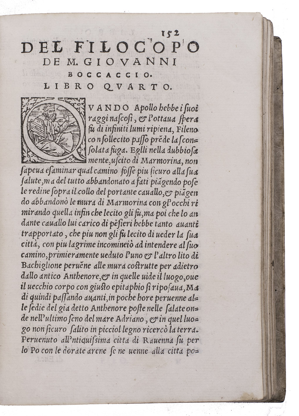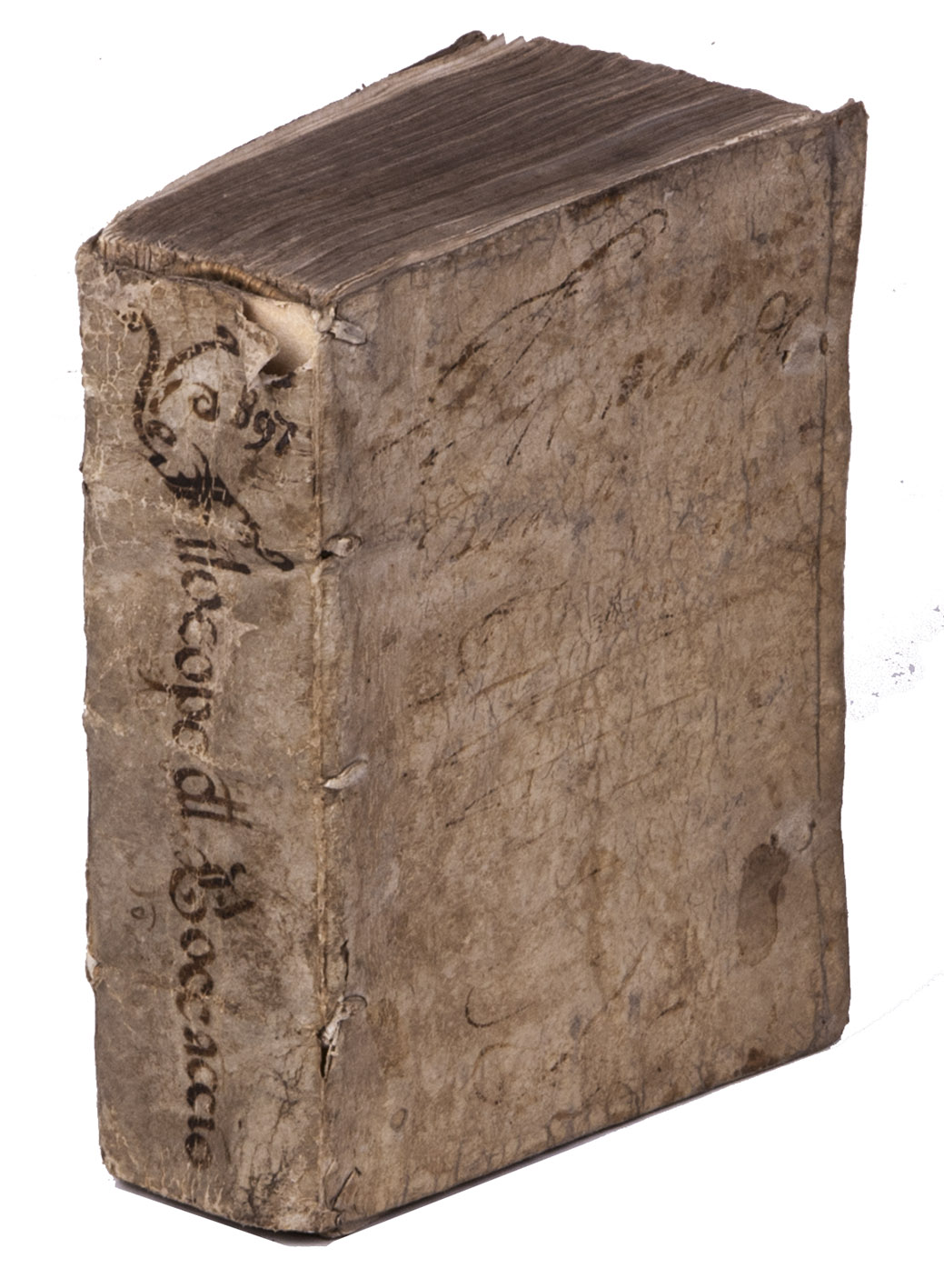 With 2 early owners' inscriptions on the title-page, both struck through and part of one abraded. With a small hole in the title-page and the corners of a few leaves dog-eared, but otherwise internally in very good condition. The binding is worn, but the lovely manuscript title on the spine remains clear. Second edition of the best Renaissance redaction of Boccaccio's important, influential and entertaining first major work. EDIT 16, 6334; Gay & Lemonnyer, col. 726; USTC 814845; cf. Gamba, Italiana letteratura 198 cr. (other eds.); for the text: Kirkham et al., eds., Boccaccio: a critical guide, pp. 87-93; Marrone, Encyclopedia of Italian literary studies, pp. 252-253.
