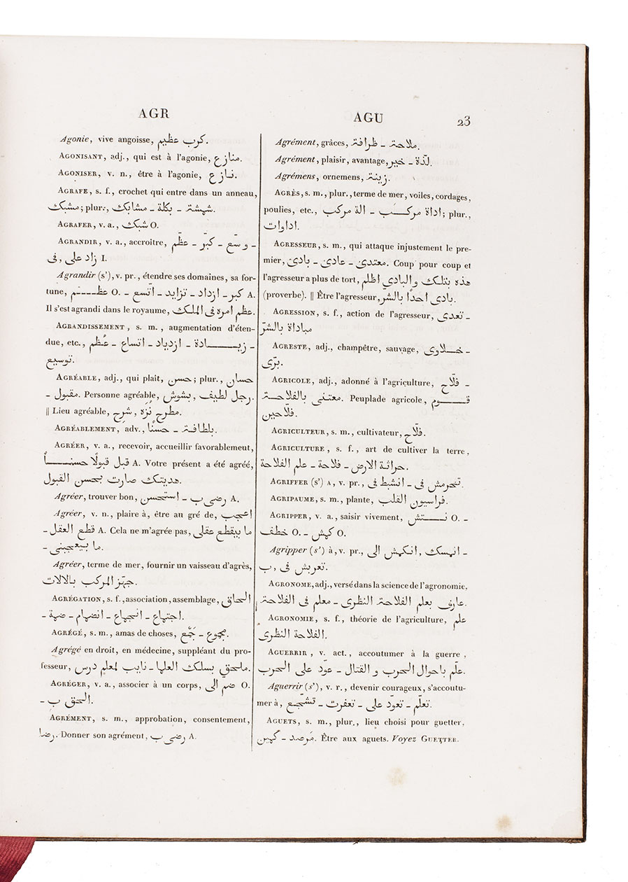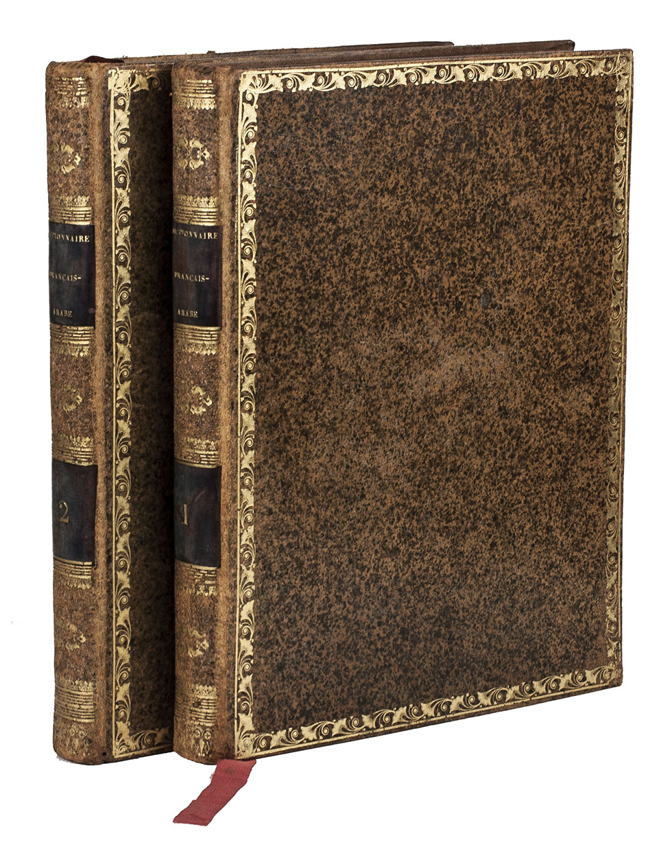 First edition, edited by Caussin de Percival, of one of the first complete French-Arabic dictionaries. This dictionary of Egyptian Arabic was compiled by the Coptic Egyptian Ellious Bocthor, a native speaker, and extended with material collected by Caussin de Perceval during the latter's travels in Syria.