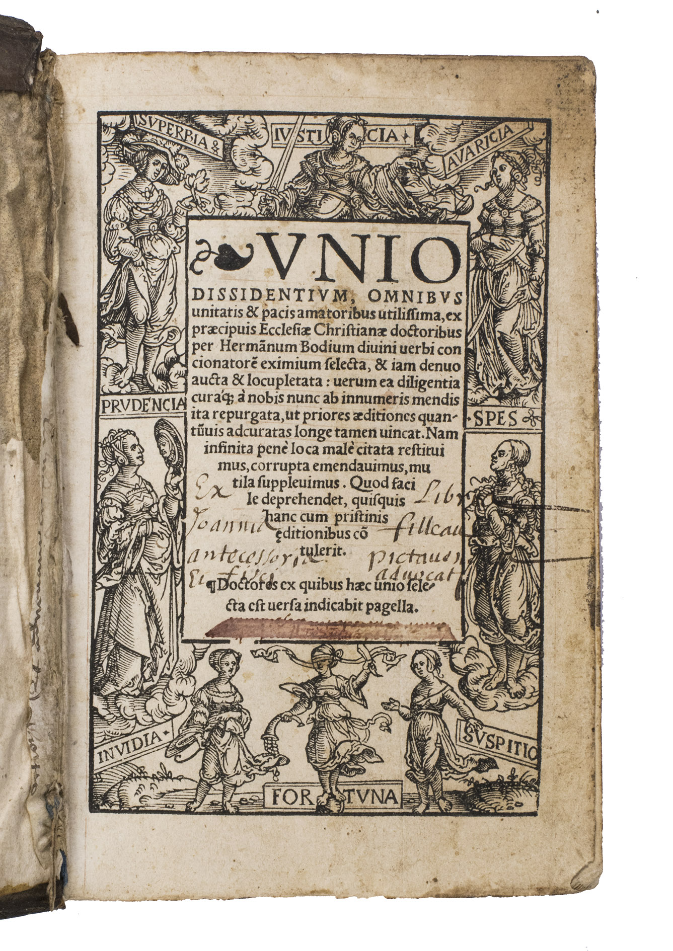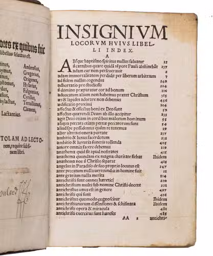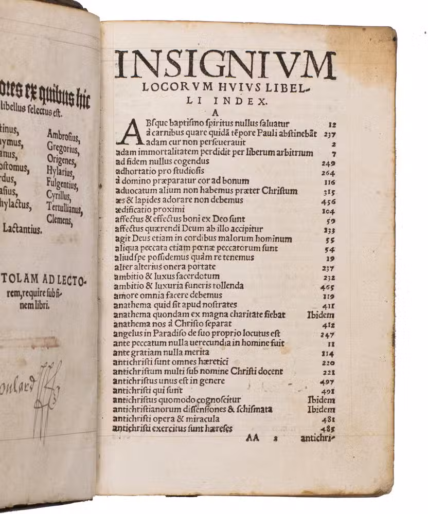 Early Cologne edition of one of the most intriguing irenical works of the early Reformation. The present work is the Unio dissidentium, and represents an early and expanded state of a work first published in Antwerp in 1527. The Unio dissidentium is a substantial irenical treatise in systematic theology, conceived as an attempt to reconcile the opposing confessional positions that divided Christendom in the first decades of the Reformation. Its compiler assembled an impressive body of biblical passages alongside nearly 550 quotations from the Church Fathers, many of them extensive, situating the work firmly within the Humanist revival of patristic theology associated with figures such as Erasmus (1469-1536) and Beatus Rhenanus (1485-1547).