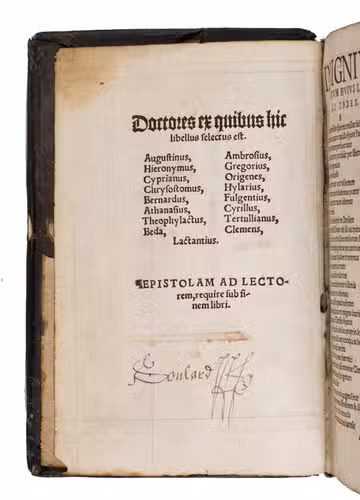 With early owners inscriptions on the title page and its verso, as well as on the final pastedown, including the name Franciscus Soulard. The title page bears a partly legible ownership inscription ("ex joannu antecessoria et fisco liber ... advocat"), with a further inscription entirely crossed out; the verso of the title page is inscribed ("Soulard..."). Further with occasional marginal annotations, the text is ruled in ink throughout. The spine and corners show damage and wear, with minor staining. Otherwise in good condition. BM STC German p. 134; Kronenberg, "Het Boek", 34, (1960/61), pp. 1-11; NUKAT xx001538065; Peters, "Who Compiled the Sixteenth-Century Patristic Handbook Unio Dissidentium?", Studies in Church History, 2, (1965), pp. 237-250; USTC 701804; not in Adams.