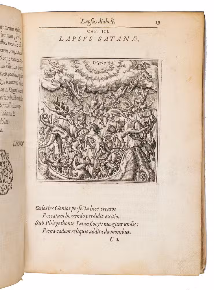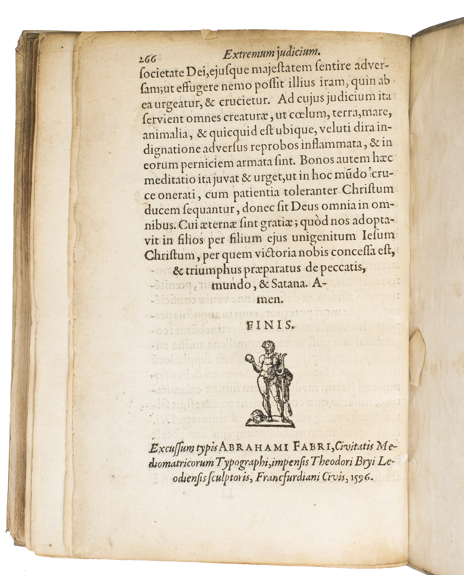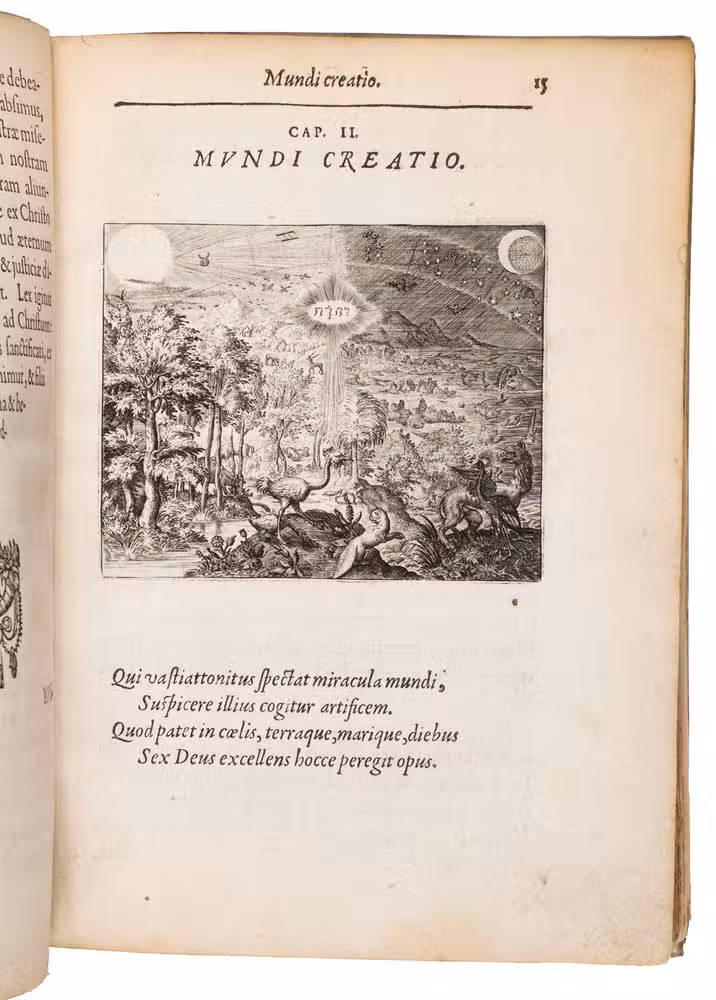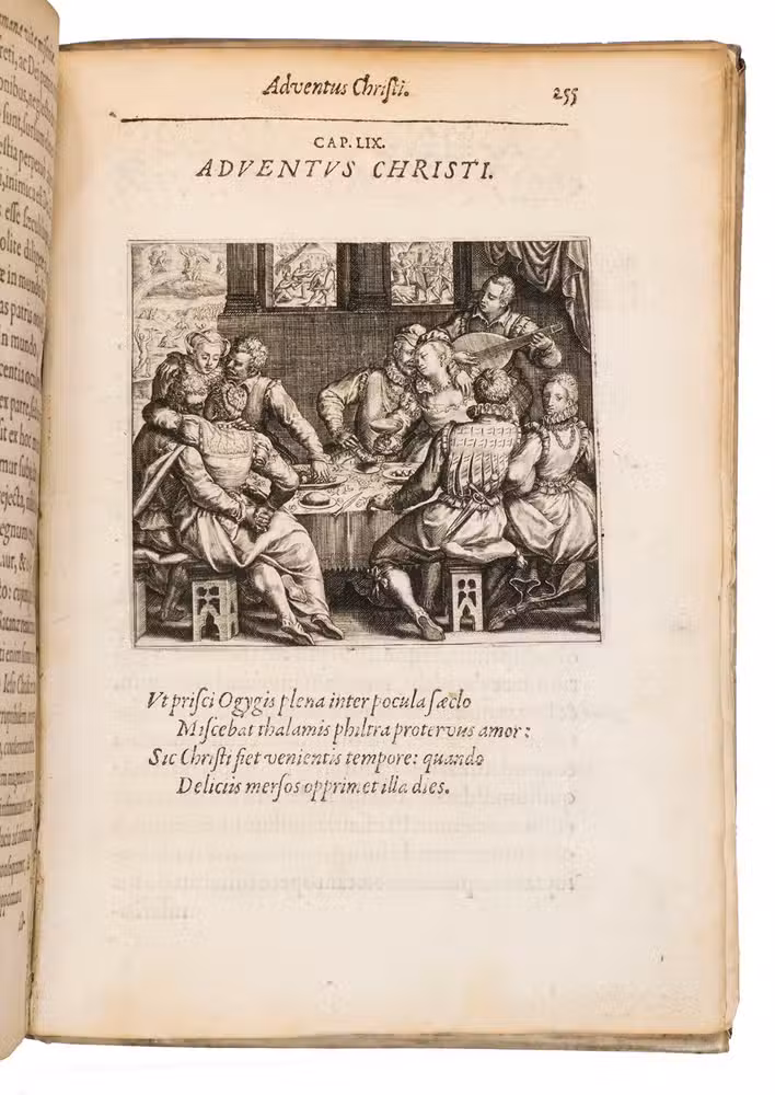 Metz, printed by Abraham Faber for Theodor de Bry in Frankfurt am Main, 1596. 4to. With the title set in an elaborate engraved frame of ornaments and illustrations representing the four stages of human life (birth, marriage, active life, and death) with short bible verses below, a half-page engraved portrait of the author (on leaf é2r in the preliminaries), and 60 half-page engraved emblems in the text, engraved by Theodor de Bry. Further with numerous woodcut decorated initials, head- and tailpieces throughout. 17th-century vellum. [1], [1 blank], [14], 266 pp.