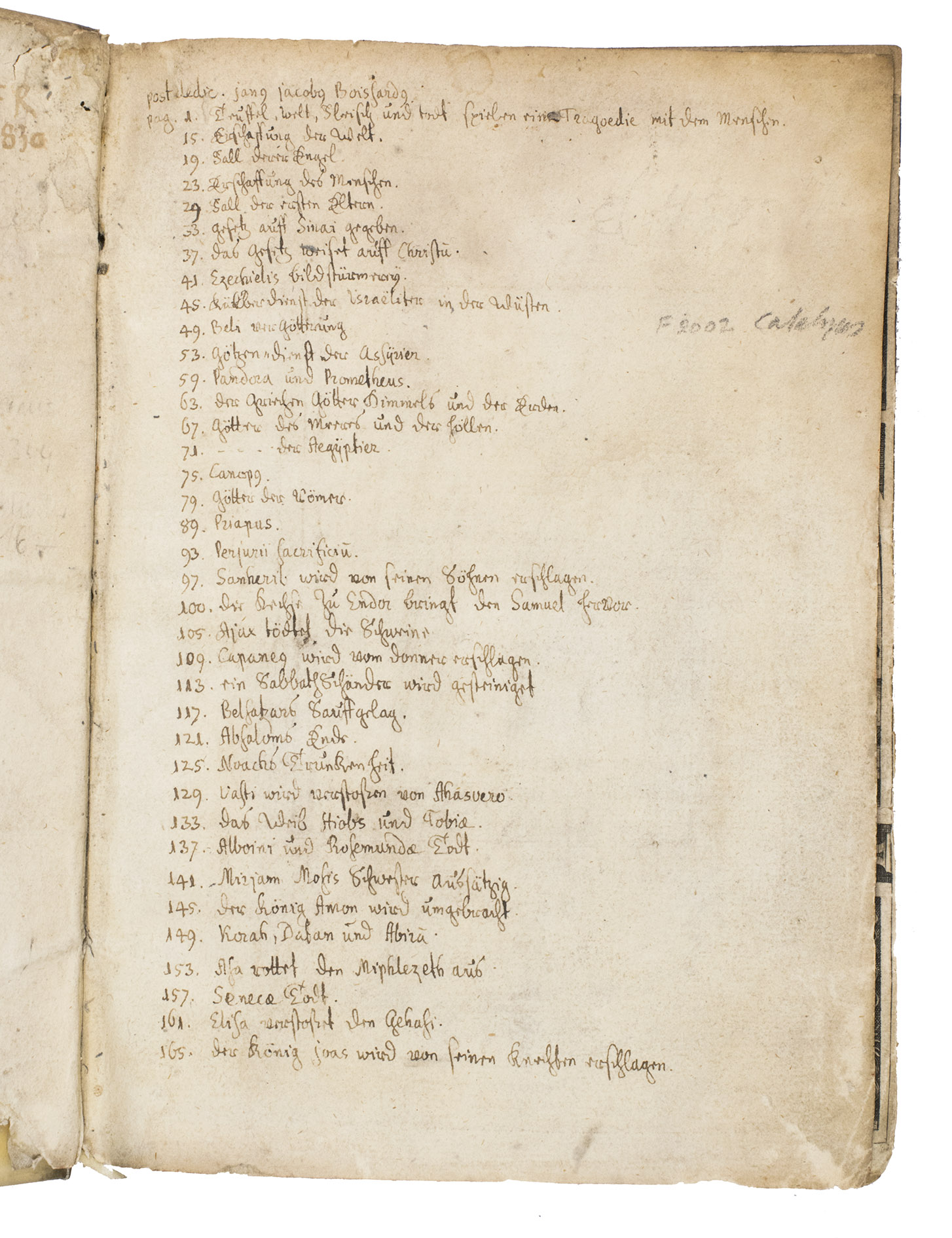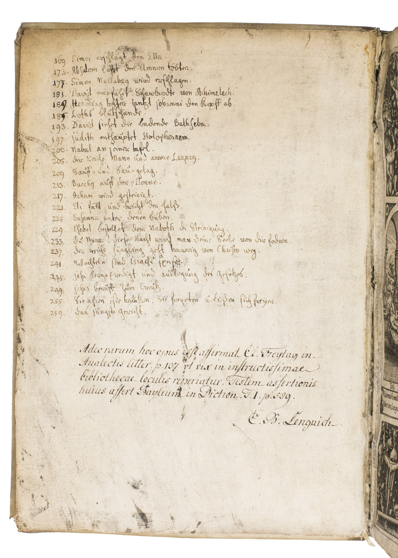 With the large engraved armorial book plate of James Allardes on the front paste-down, a contemporary manuscript detailed list of engravings on the recto and verso of the first free flyleaf, another manuscript inscription on the verso of the first free flyleaf below the list, by an 18th-century owner of the work named C. B. Lengnich; he refers to Pierre Bayles Dictionnaire (vol. I, p. 589) and mentions the rarity of the present edition. Further with a few manuscript annotations in the margins (mainly on p. 2) and some manuscript underlining of the text. The binding is somewhat dust-soiled and shows a brown stain on the back board, the corners of the boards are slightly scuffed, the title page shows some (dust) soiling, some dust-soiling in the margins and thumbed corners throughout, the leaves are slightly frayed along the fore-edge. Otherwise in good condition with clear engraved illustrations in the text. Adams, B-2344; Brun, p. 138; Brunet, I, p. 1067; Ind. Aurel., 121.340; Landwehr, French, Italian, Spanish ... Emblems (1976), no. 167; Praz, p. 279; Redgrave, Boissards Emblems, in: Transactions of the Bibliogr. Society (1893); Tchemerzine, Bibl. dauteurs franç., I, p. 815; VD16 B 6465.