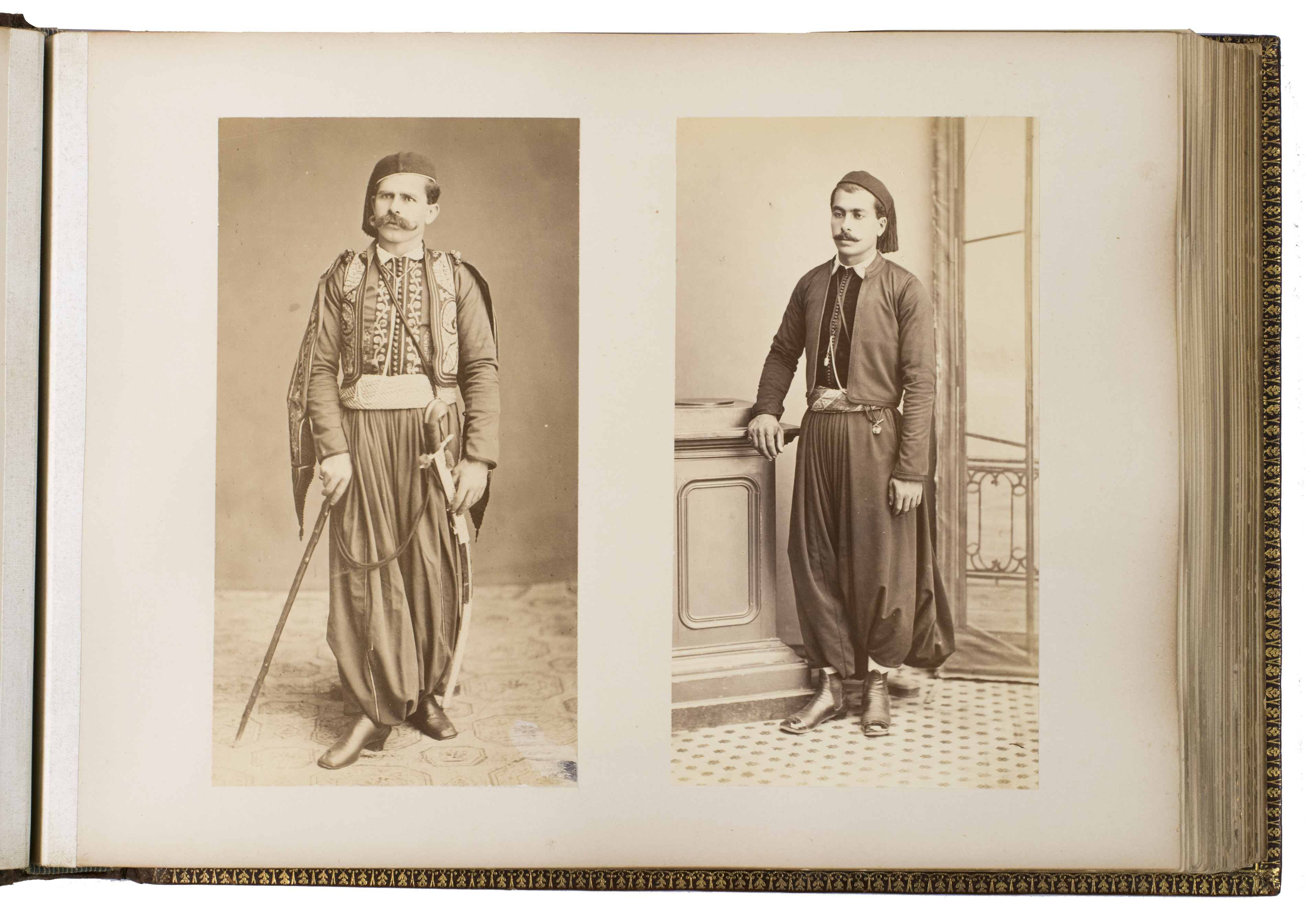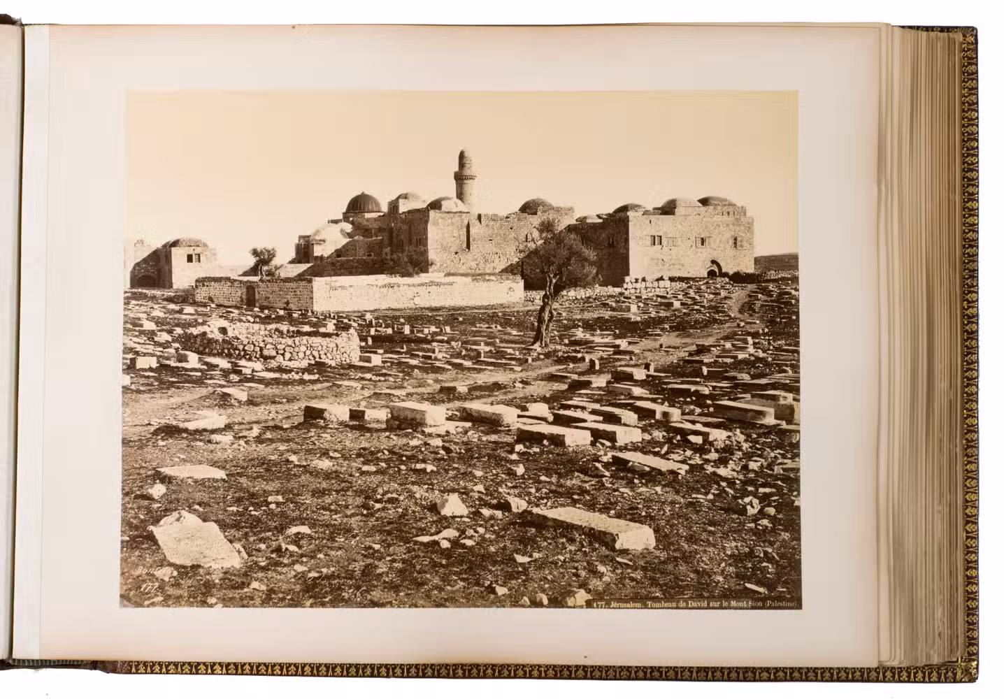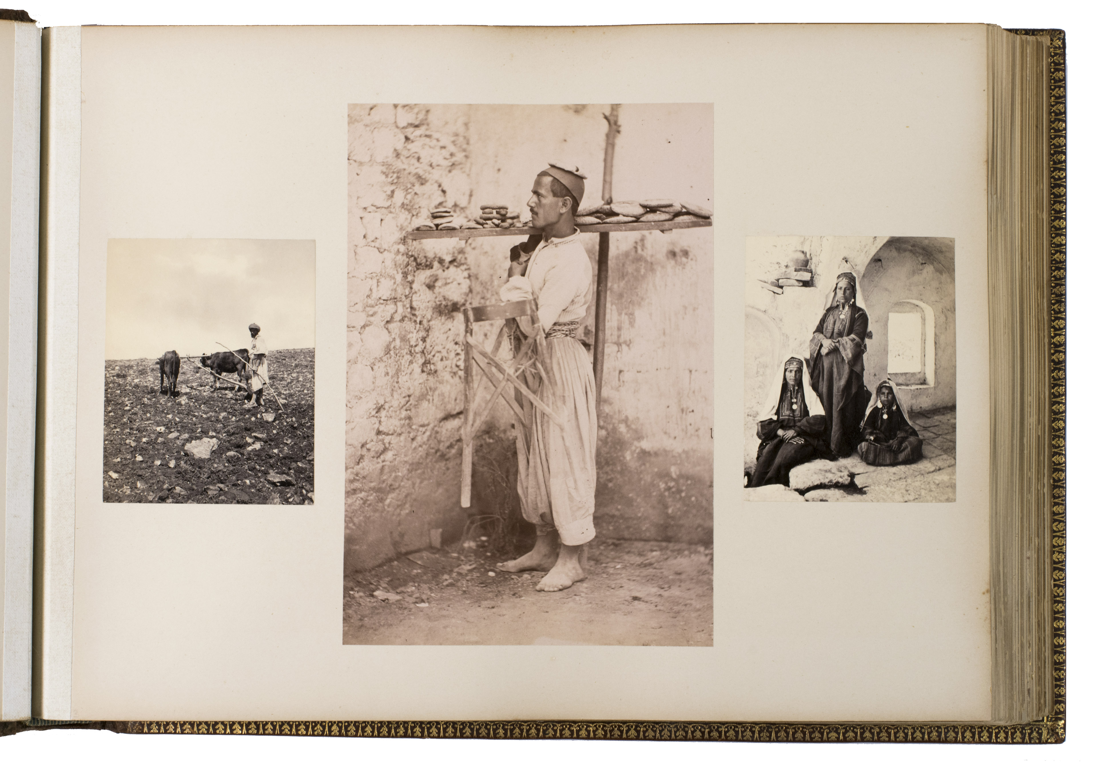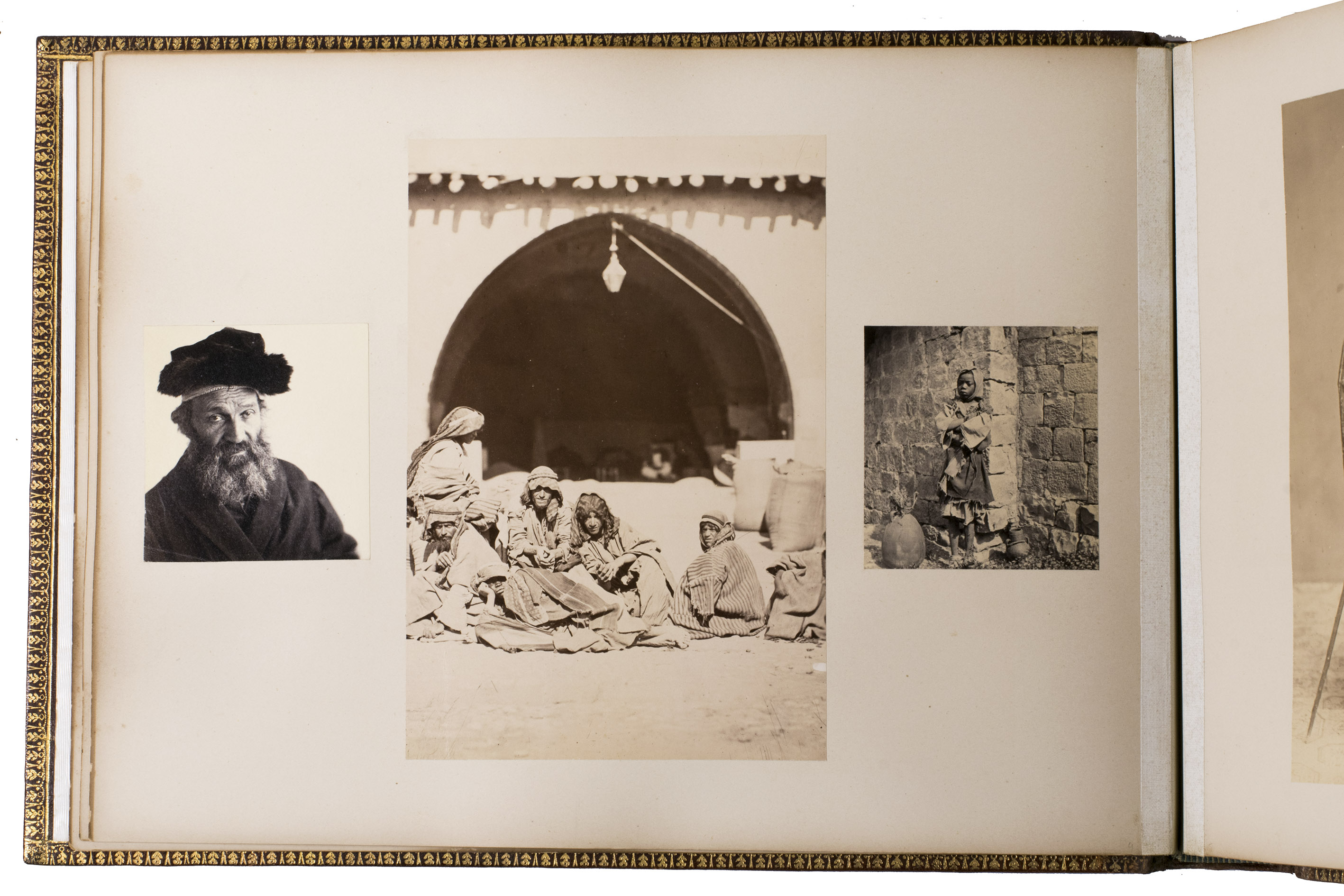The majority of the photographs in the album are signed by Bonfils. He opened his first studio in Beirut in 1867 and produced thousands of photographs of the region. The present album contains one of the photographs he is most known for, namely the group of Jews in front of the Wailing Wall. Bonfils personally considered this haunting image to be one of his best works. Other photographs include views of Damascus, Beirut and Jerusalem, the church of the Holy Sepulchre, the Dome of the Ascension, Jericho, Jaffa, Ramallah, the Jordan river, the temple of Jupiter in Baalbek, and the Umayyad mosque. The remaining photographs in the album are either signed by Sébah or unsigned and include beautiful portraits of locals, views of Istanbul (the Blue Mosque, Hagia Sophia, Galata bridge and the Bosphorus river) and Athens (the Theseion, the temple of Olympian Zeus, the Parthenon, and the caryatids of Erechtheion).