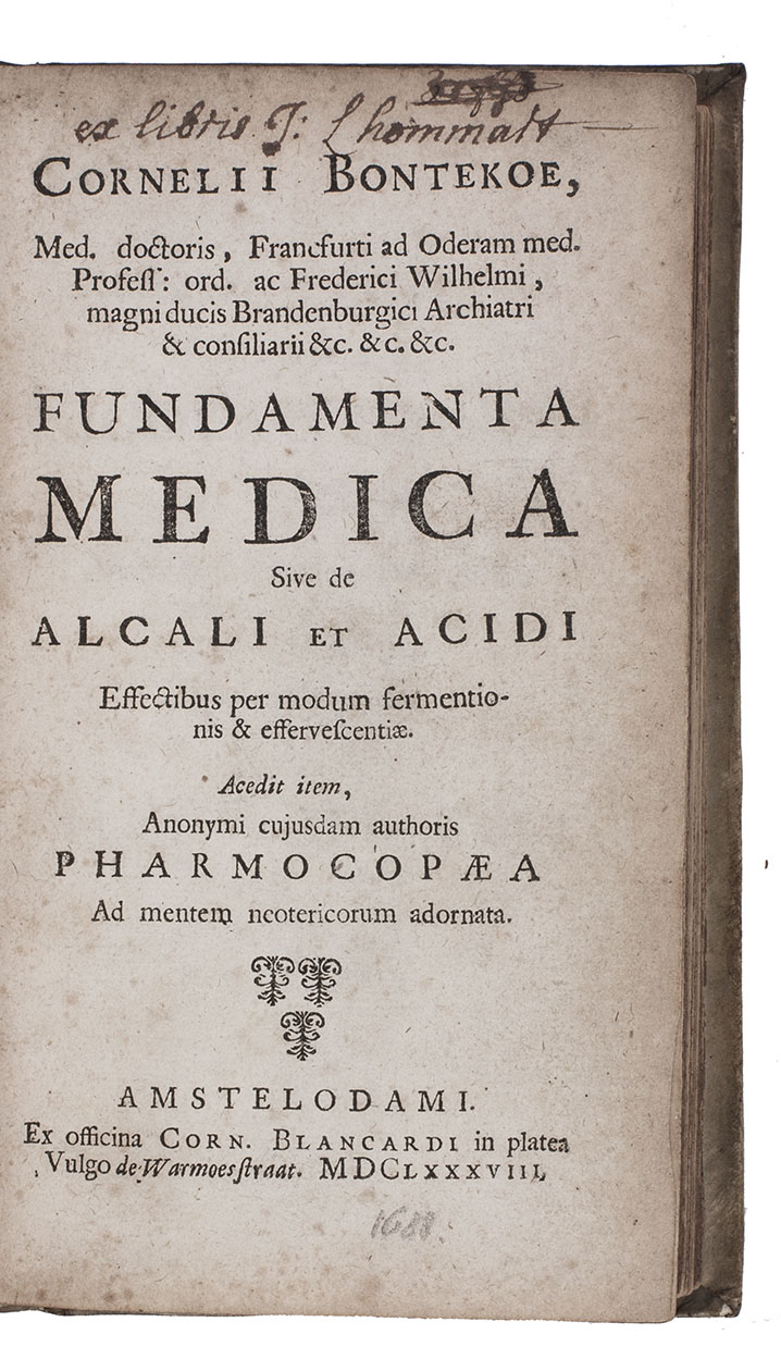 Ad 1: First edition of a general introduction to medicine and pharmacology by the Dutch Cartesian physician Cornelis Bontekoe (1647-1685), who served from 1682 as physician and advisor to Friedrich Wilhelm I, Elector of Brandenburg in Berlin, and as professor at the university in Frankfurt an den Oder. It reflects the modern scientific method that had made Bontekoe a controversial figure, beginning with matters of chemistry before moving on to medicines, then discussing various ailments. Part 2, with its own divisional title, comprises a 58-page pharmacopoeia.