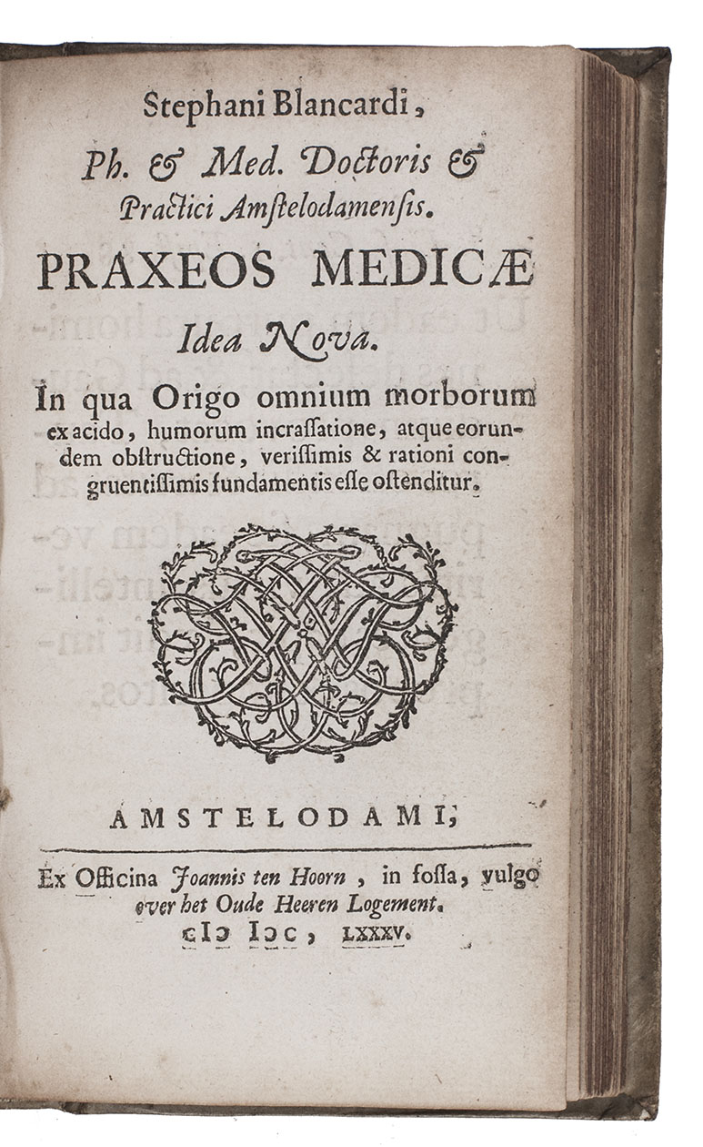 Ad 2: First edition of a Latin adaptation of a Dutch handbook of practical medicine by the Dutch Cartesian physician, chemist, pharmacologist and entomologist Steven Blankaart (1650-1704), who worked in Amsterdam. It is based on his Dutch Nieuw lichtende praktyk der medicynen, first published in 1678, also by Ten Hoorn, which saw its third edition in 1685. It discusses a wide variety of ailments and their treatment, giving recipes for medicines. Blankaart was an early user of Van Leeuwenhoeks new microscopes, and the blood vessels shown in one of the plates may have been based on microscopic views. The plates are new for this edition, the Dutch Praktyk having shown only equipment. Blankaart dedicated the book to Abraham Johannes Kuffler (ca. 1637-1694?), a follower of Spinoza.
