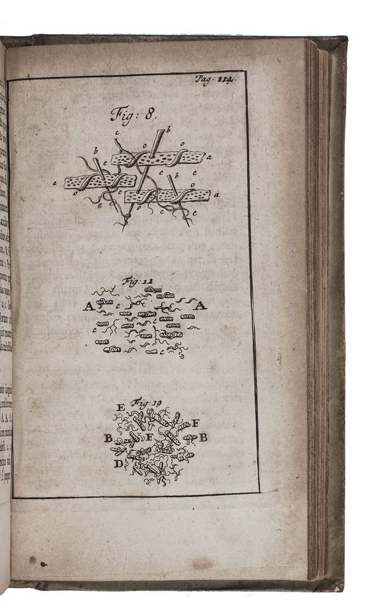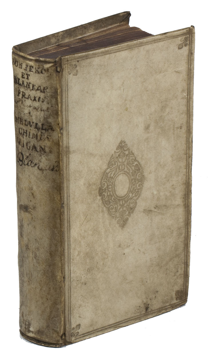 3 works in 1 volume. 8vo. Ad 1 with a divisional title for the Pharmacopaea, woodcut tailpieces, 1 woodcut decorated initial and decorations built up from cast fleurons. Ad 2 with Ten Hoorn's woodcut JCTH cypher monogram on the title-page, the engraved arms of the dedicatee Abraham Johannes Kuffler, 6 engraved illustration plates showing 10 numbered figures, 1 woodcut decorated initial. Ad 3 with 3 numbered engraved folding plates, 1 woodcut decorated initial and a few fleurons. Contemporary blind-tooled vellum, each board with a centrepiece and in each corner a fleur-de-lis, the whole in a frame of double fillets, red sprinkled edges. [8], 228, [11], [1 blank]; [16], 170, [6]; [10], 70 pp.