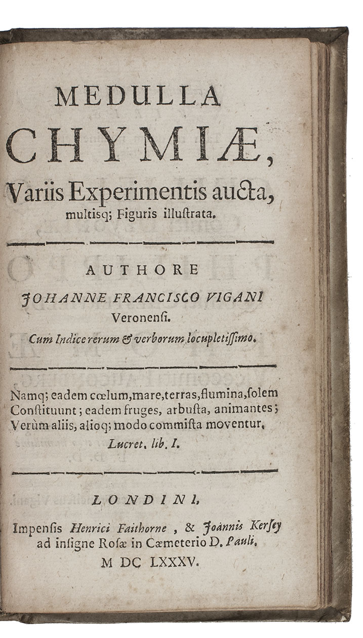 (3) VIGANI, Giovanni Francesco. Medulla chymiæ, variis experimentis aucta, multisq; figuris illustrata. ...