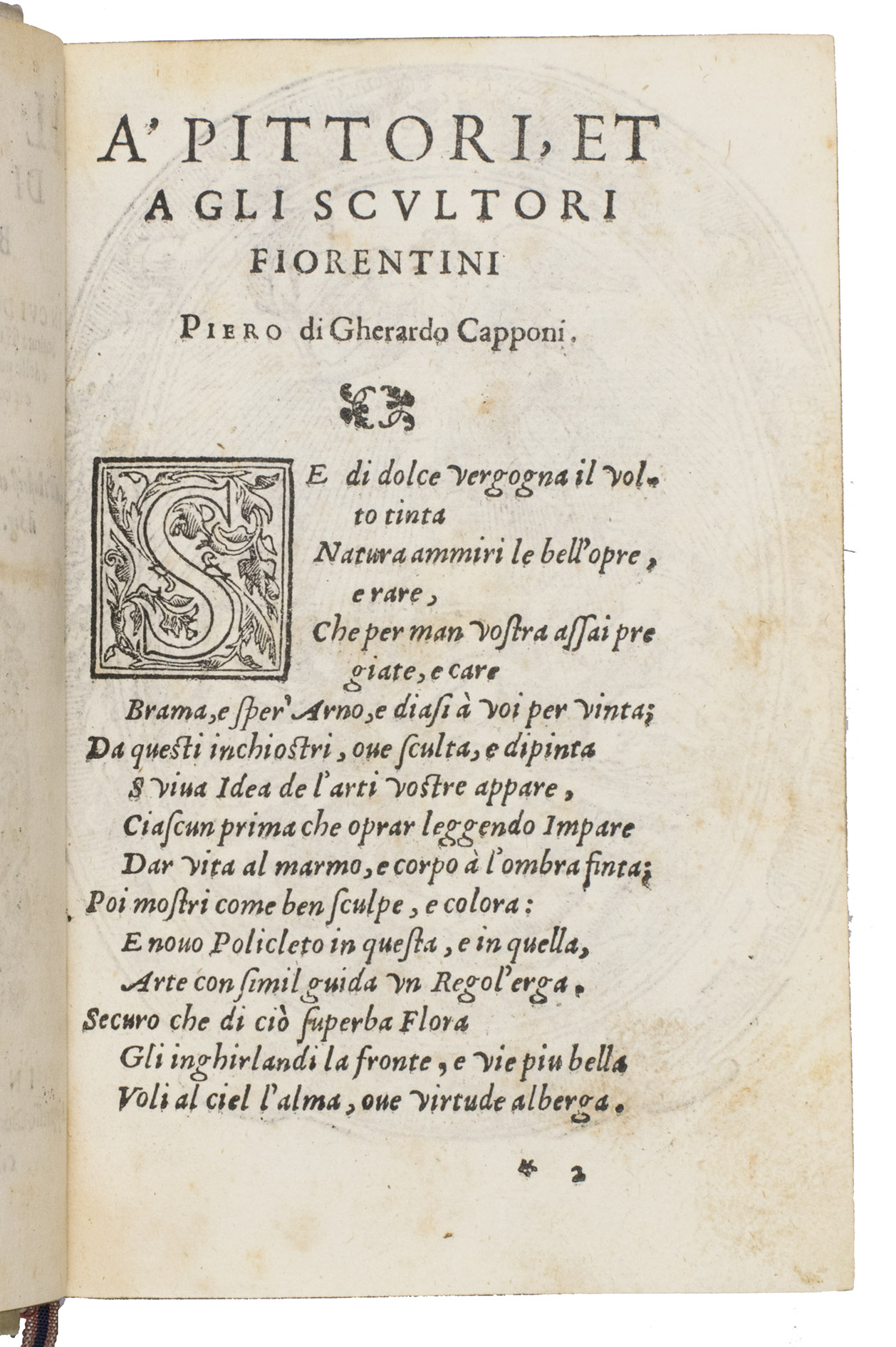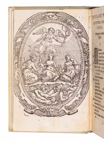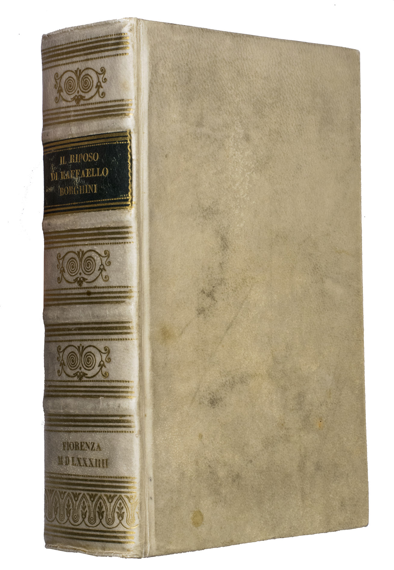 Florence, Giorgio Marescotti, 1584. 8vo. With Marescottis woodcut "et vult et potest" device on the title page (ship in an oval cartouche with motto, and a monogram at the foot) and a full-page allegorical woodcut on art and on fame in an oval cartouche, a woodcut tailpiece, and 6 woodcut decorated initials (4 series). 19th-century gold-tooled sheepskin parchment (ca. 1890?). [48], 648 pp.